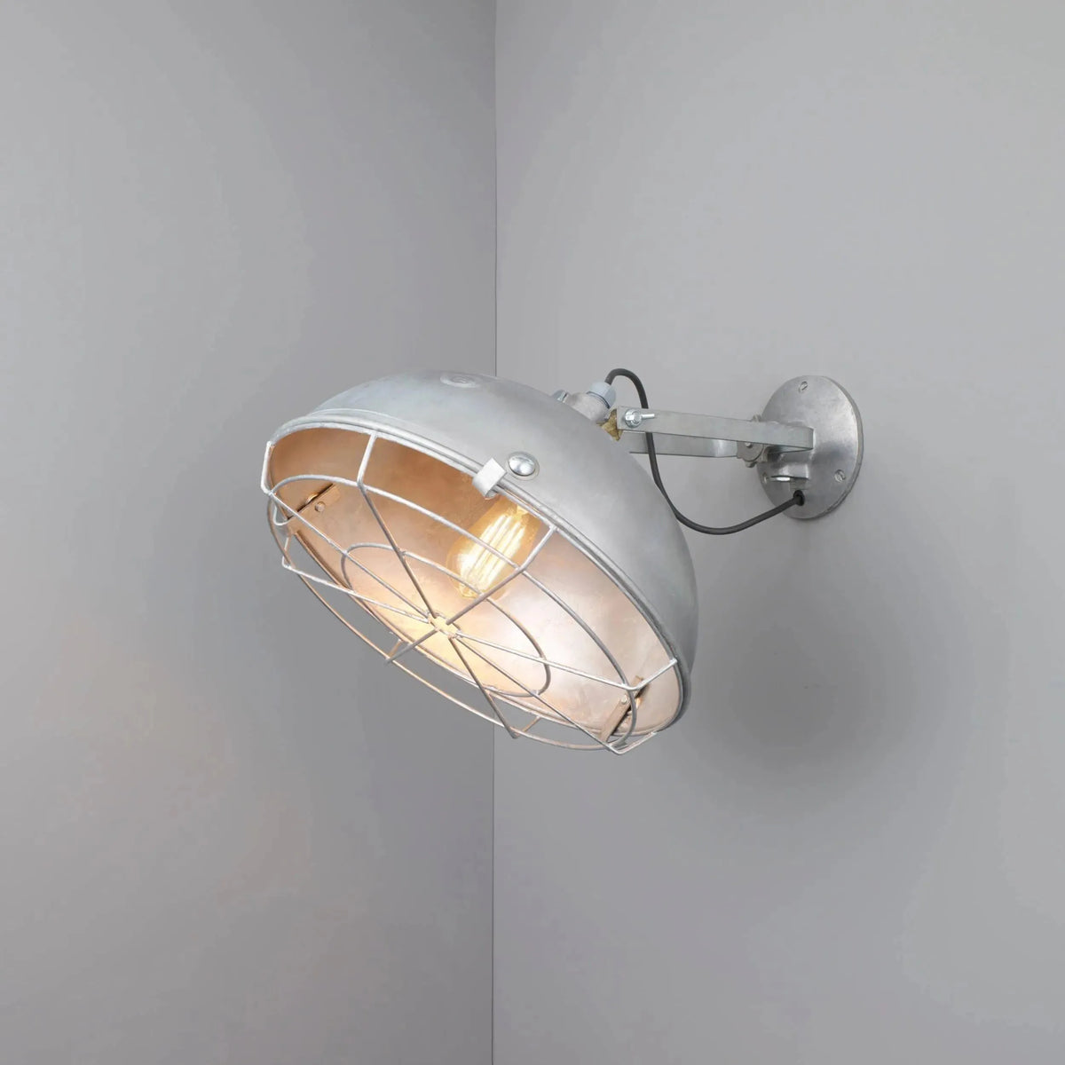 An industrial style deck working wall light in galvanised metal with a protective galvanised guard.