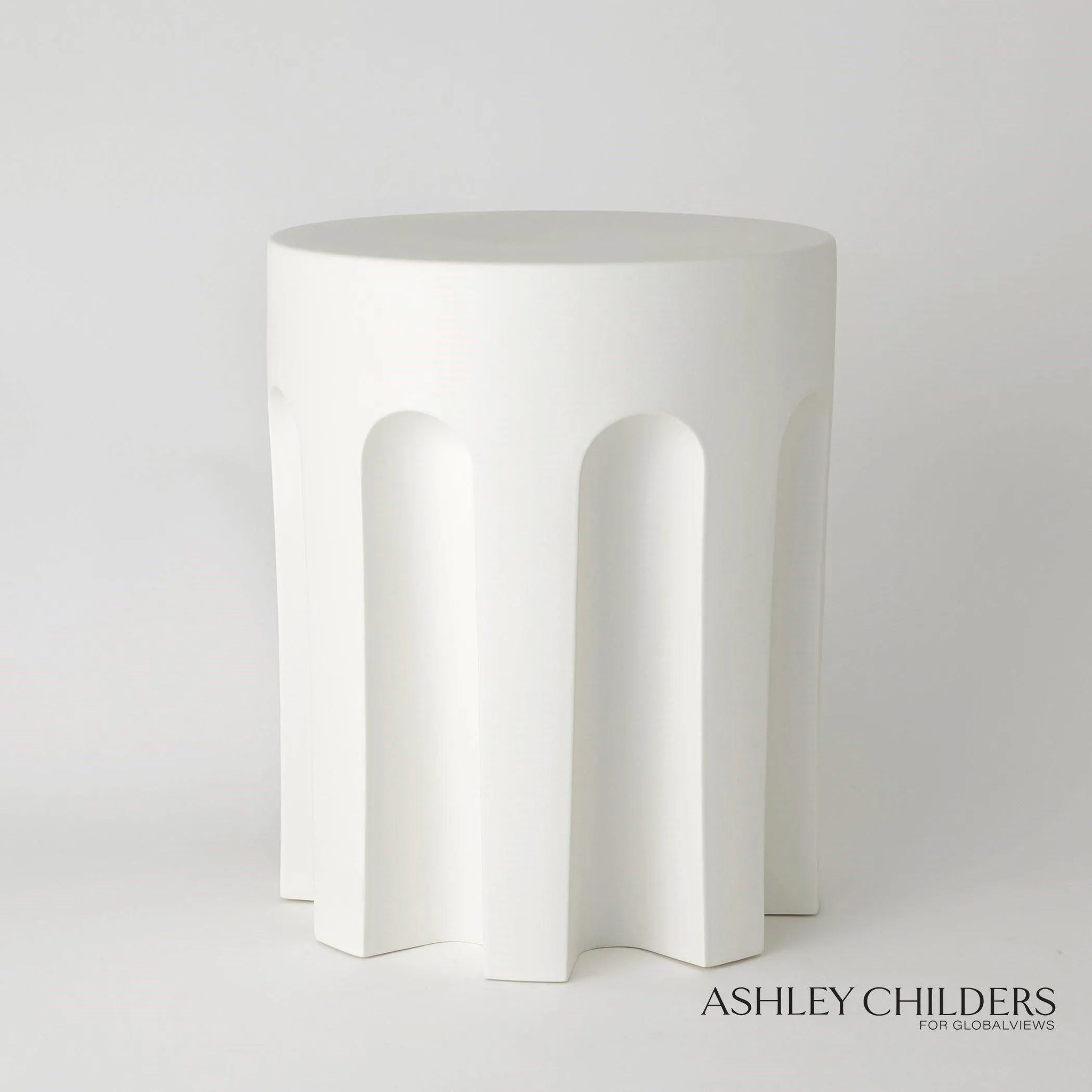 Arches Table by Global Views — a sculptural side table that reduces form to elegant geometry. Its cylindrical silhouette is carved with repeating arch recesses, creating a rhythm of light and shadow that reads as both architectural and tactile.
