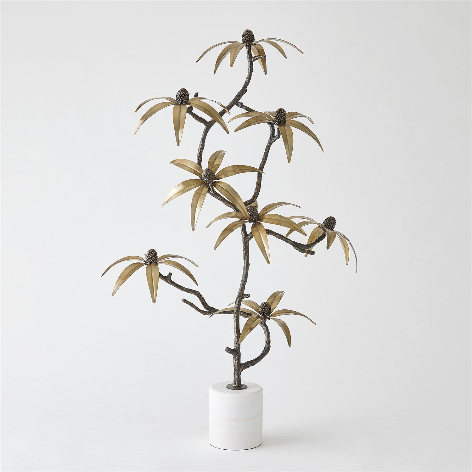 Handcrafted by artisans, the Black-Eyed Susan sculpture features iron and cast iron in bronze and faux brass finishes, elegantly resting on a white marble base. This piece beautifully captures the essence of nature’s charm.