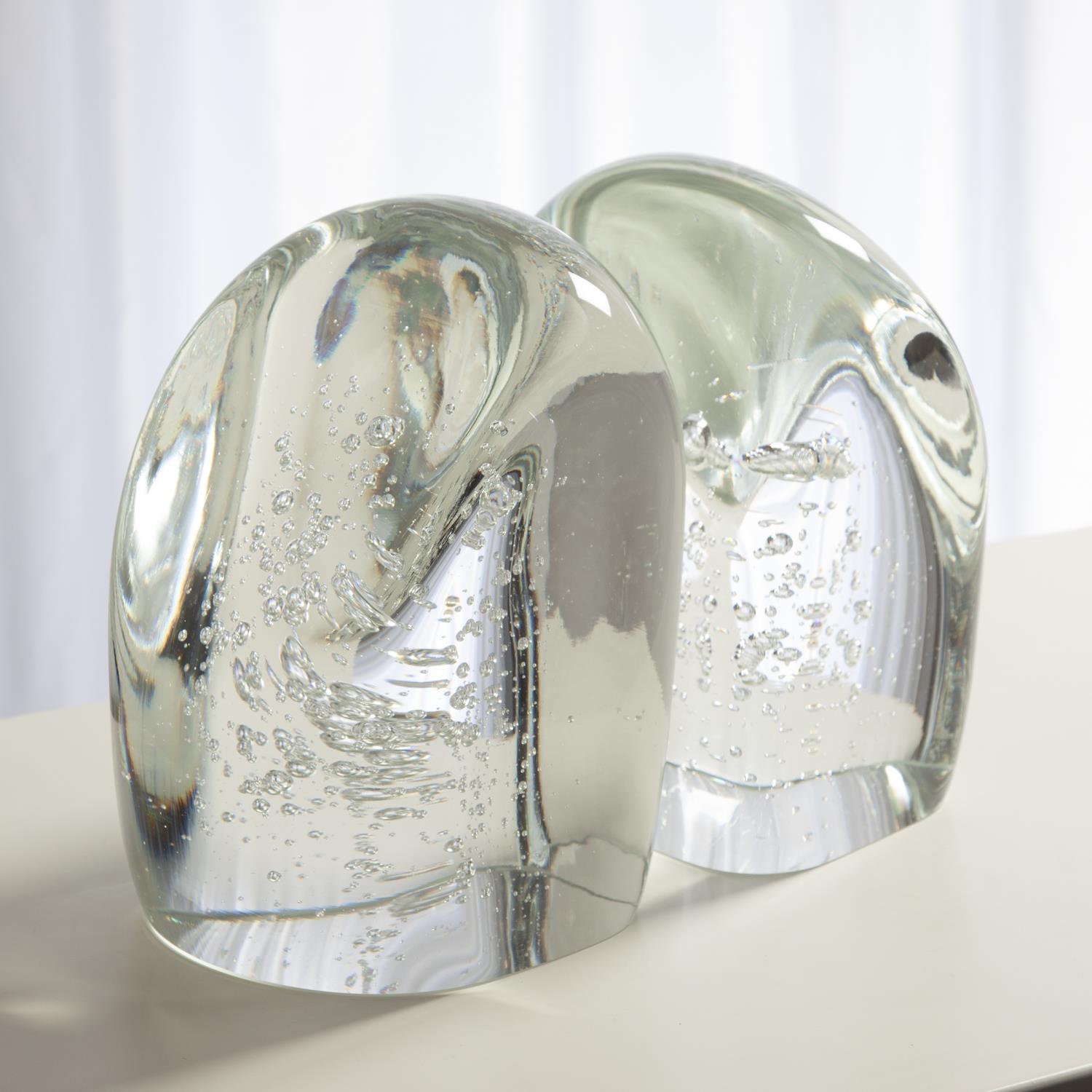 Thick clear art glass is blown by Polish artisans; each will be individually unique. These book ends feature clear bubbles.