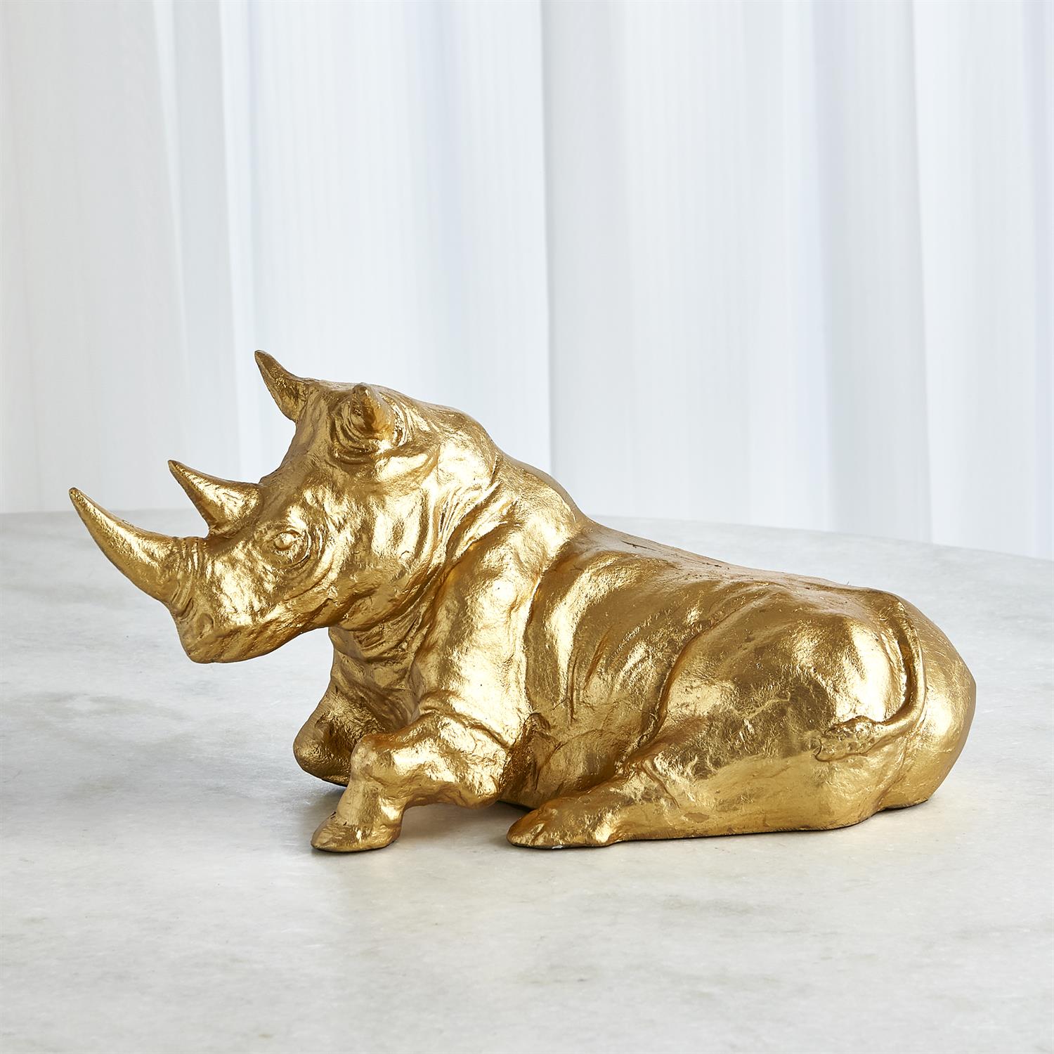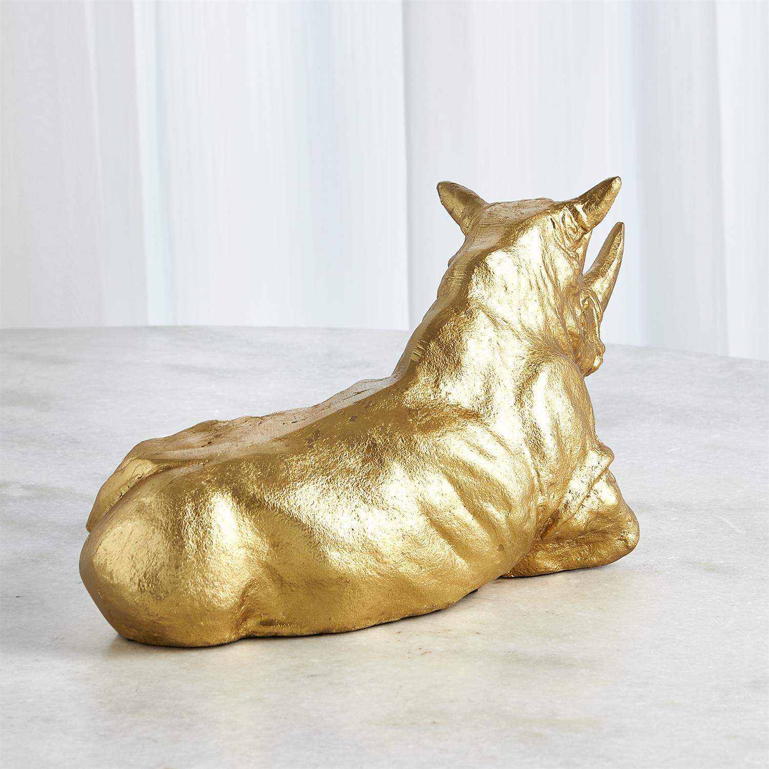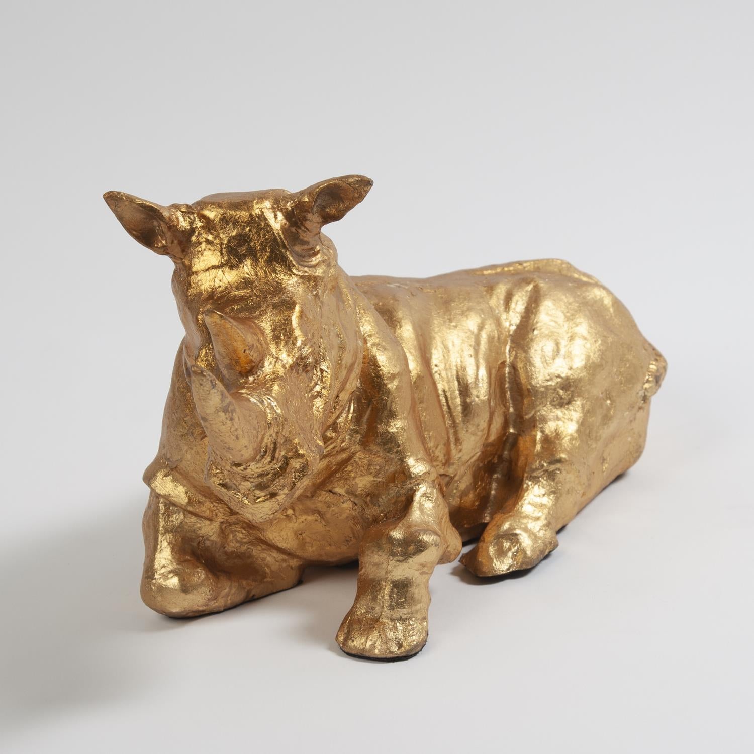 The Arete Collection is renowned for magnificently carved and hand-crafted home furnishings. This exclusive collection for William D Scott consists of nature-inspired accessories. This cast aluminum sculpture is covered in a gold leaf finish and resembles a rhinoceros lying down. Felt tabs on the bottom of the sculpture help to protect any surface this piece rests upon.