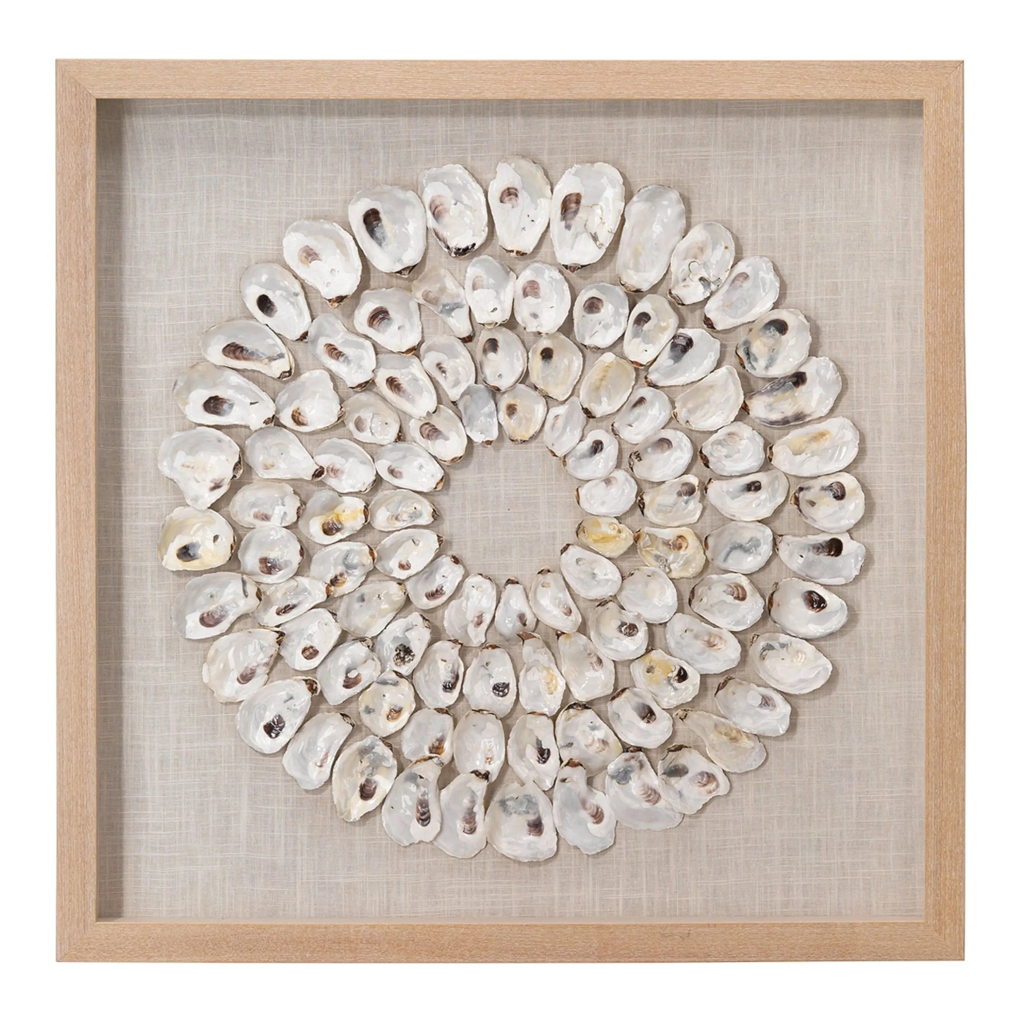 An assortment of natural abalone shells are arranged into shrinking concentric circles that highlight its mesmerizing organic beauty with a range of natural seaside colors and textures. Arranged by hand with natural materials and framed in wood, making each piece one of a kind. Position in your entryway, powder room or bedroom for an earthy, eye-catching accent.