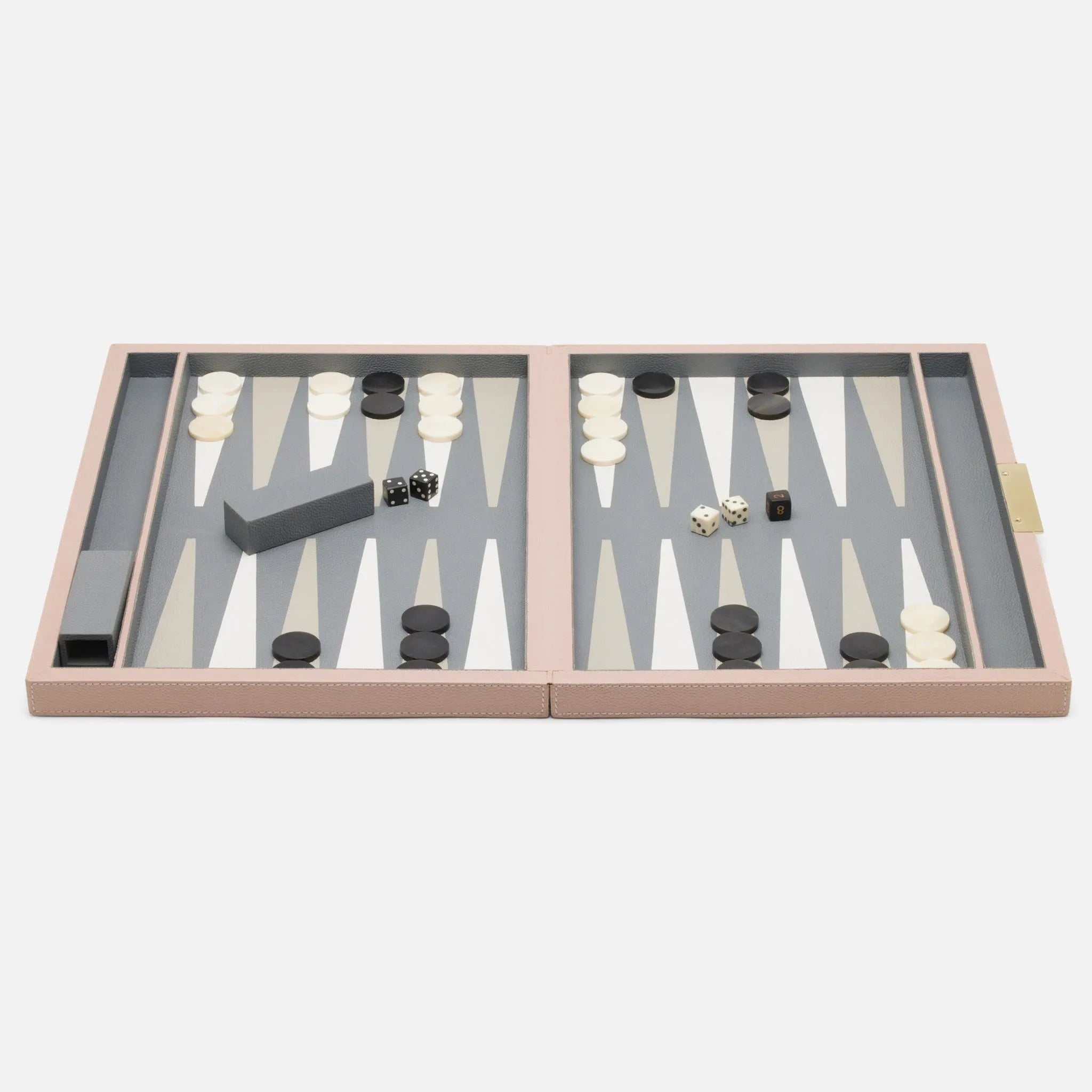 Bold forest green full-grain leather backgammon set with stitching detail and brass tab closure. The board game interior beautifully features alternating navy and forest green full-grain leather on a tobacco leather background, along with natural bone and dark horn playing pieces.
