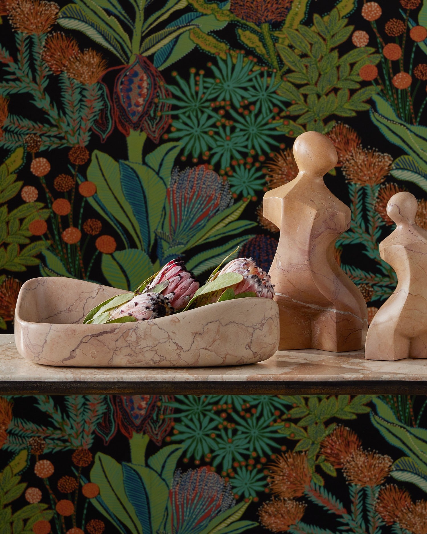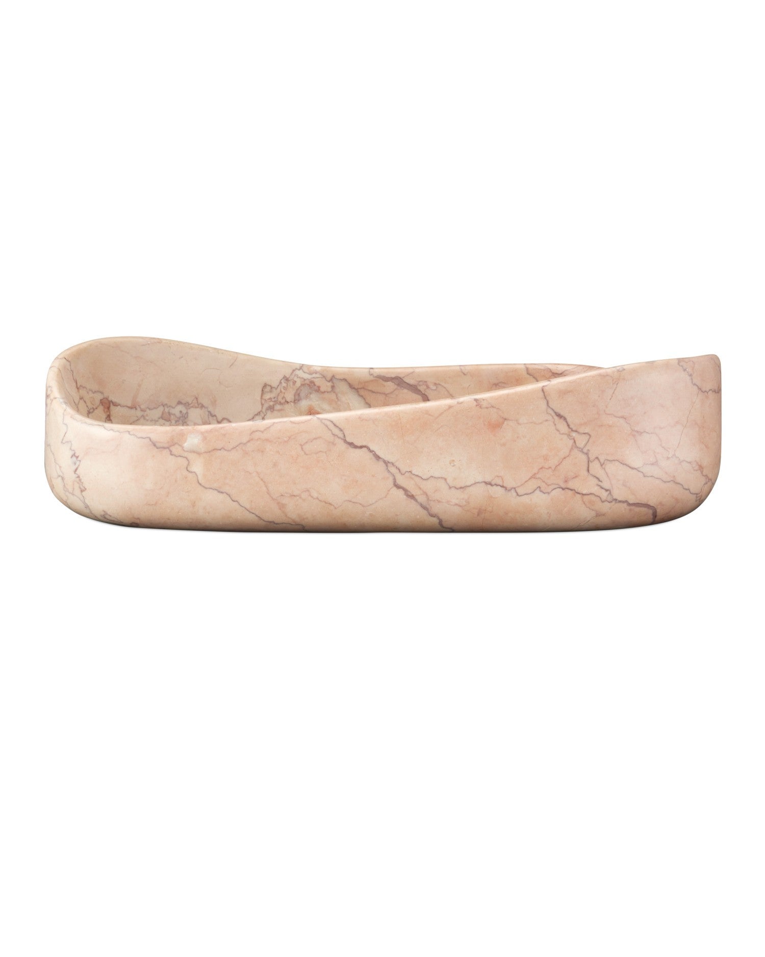The Deaton Rosa Marble Bowl is an elegantly organic decorative piece with a gently undulating shape. Crafted from Rosa Cappuccino marble, its soft pink surfaces are enhanced by darker veining that creates a personable pattern. Empty, it is a statement accent that can also be perfect or for showcasing cherished items. This is a generously sized decorative bowl at fourteen-and-a-half inches long by eight-and-a-half inches wide.