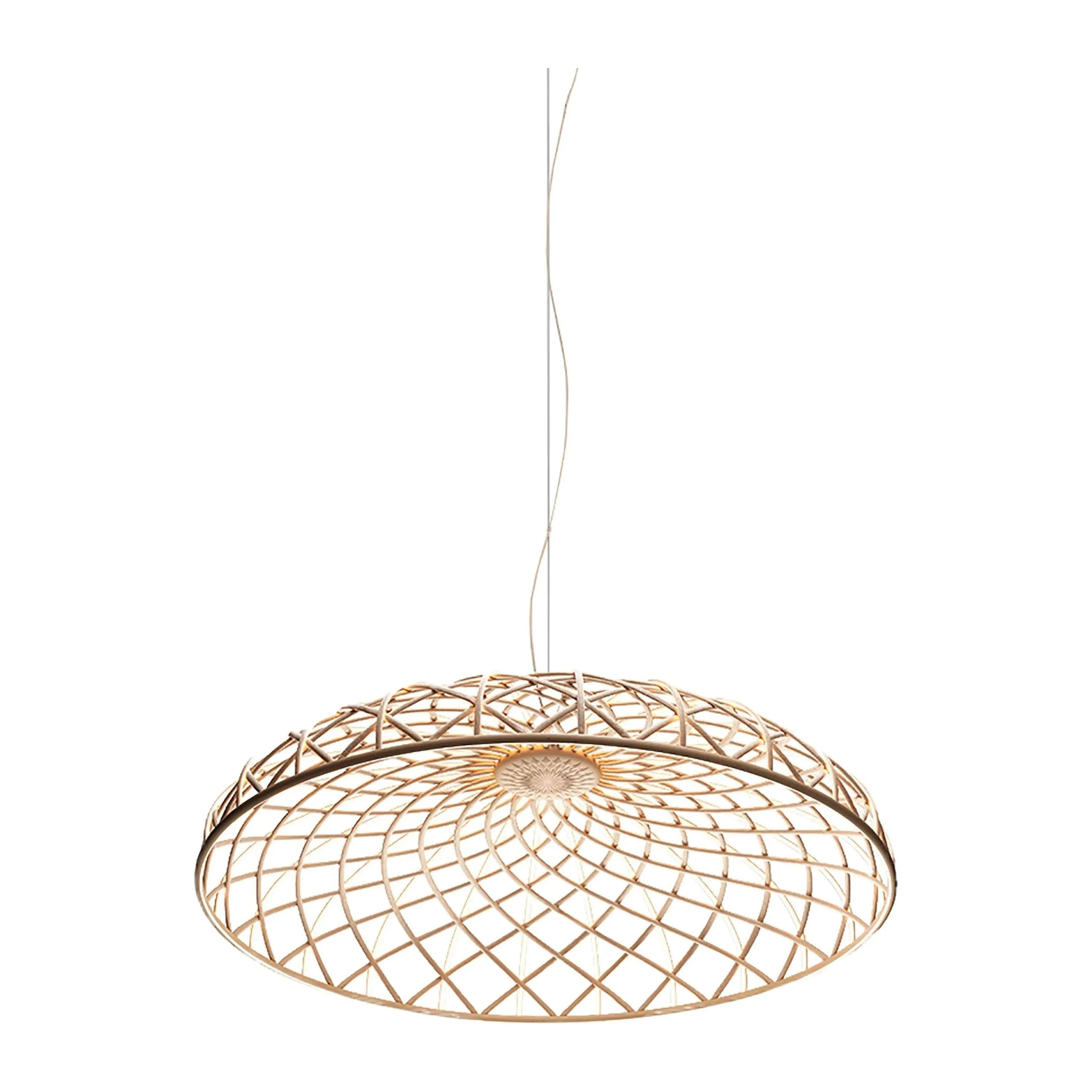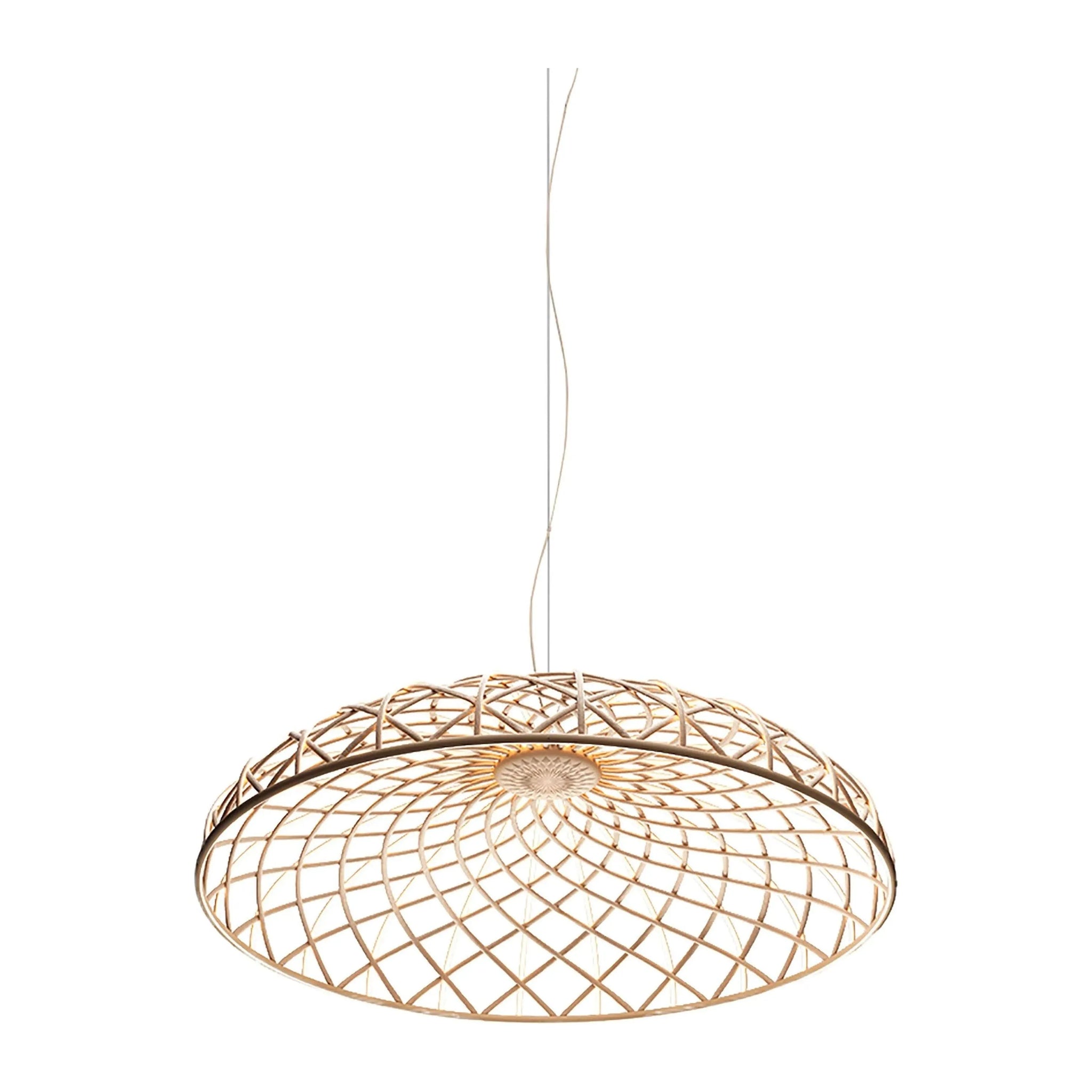 Woven tubes and luminous elements form an airy dome on the Skynest Pendant. Each light is powered by micro-connectors at the top and covered with woven mesh, with a white inner side for optimal light emission. The dome rim is fitted with an aluminum ring for structural integrity while a balance system at the top ensures stability. The canopy is plastic, painted in the same finish as the rest of the pendant. This pendant is environmentally friendly, its mesh made of recycled and recyclable fabric. It is also assembled without any glue, allowing it to be fully separated for recycling in the future. The Skynest is a great option for those seeking a beautiful, sustainable and innovative lighting solution.