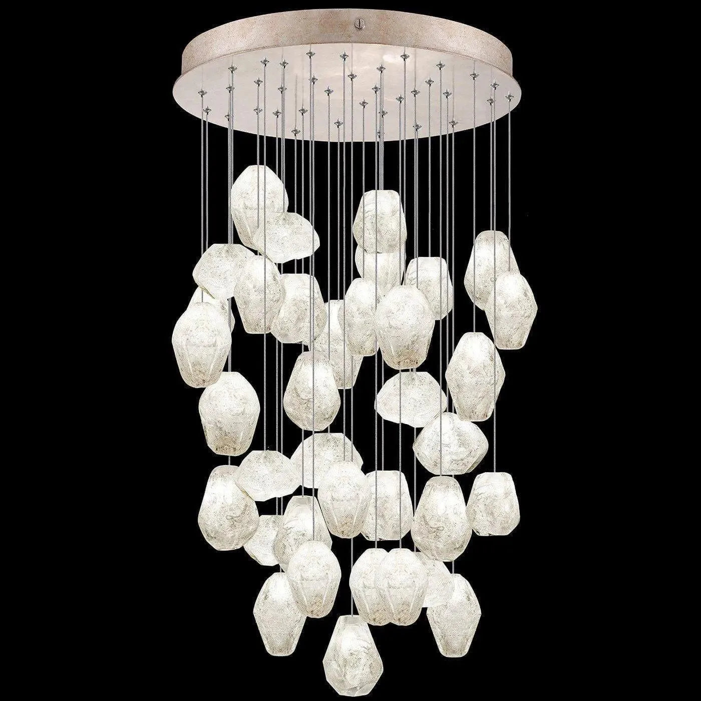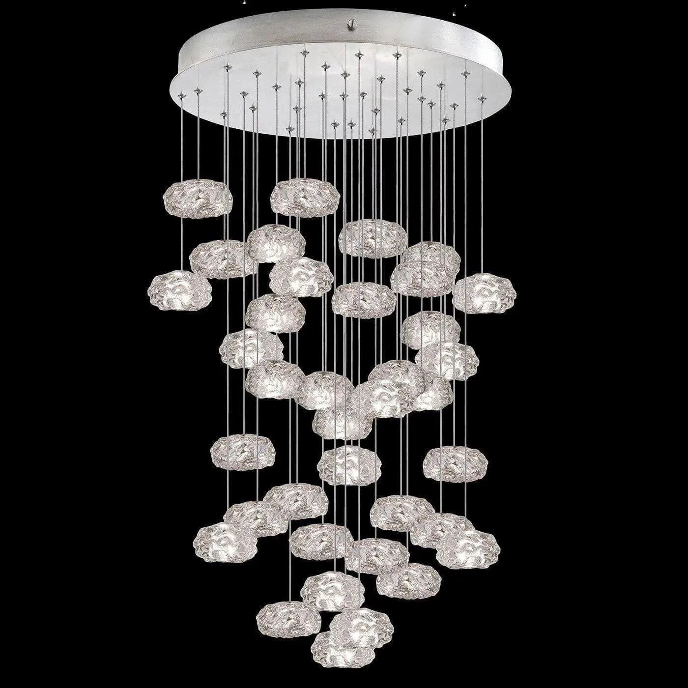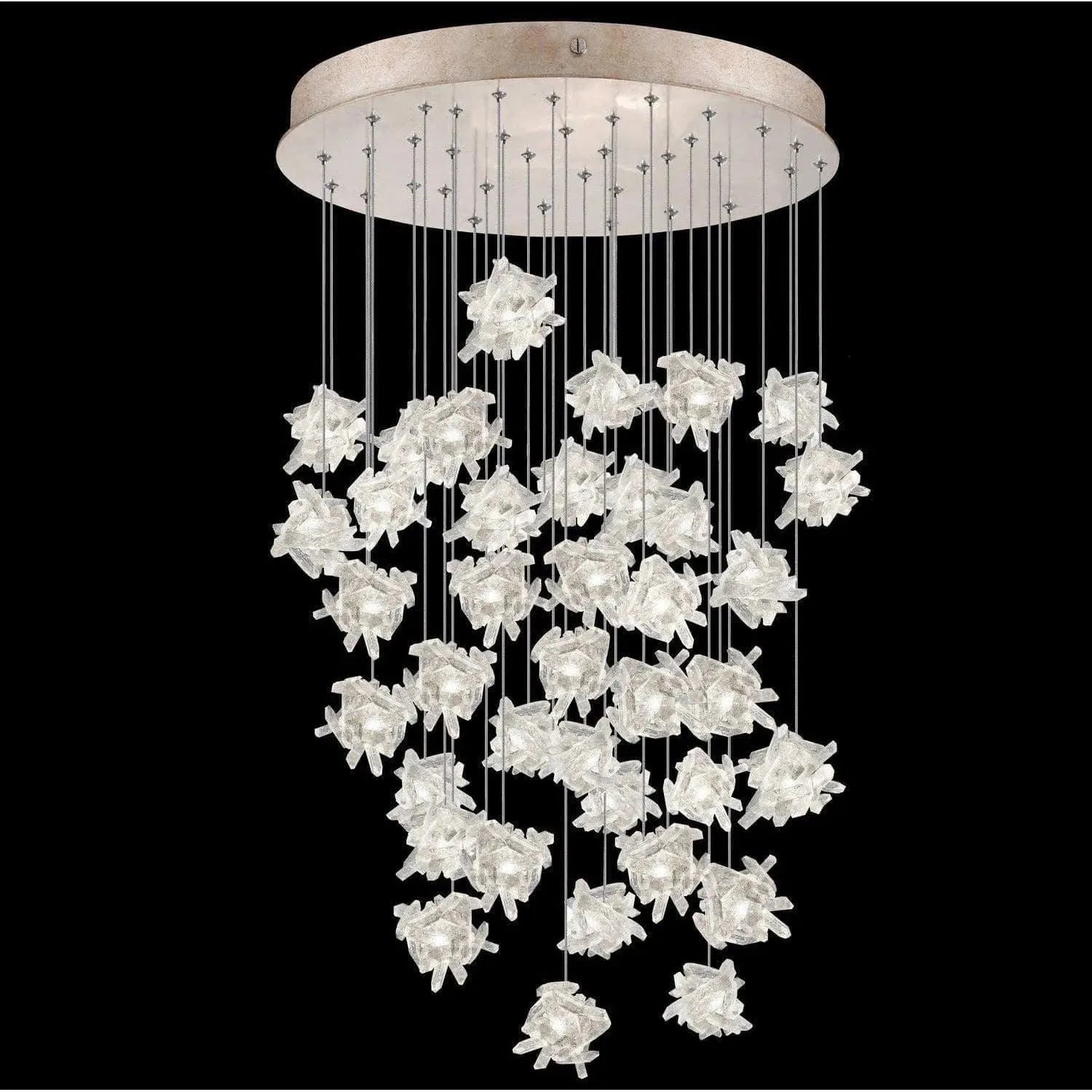 Crafted by Fine Art Handcrafted Lighting, the pendant pairs meticulous glasswork with precision stainless hardware and a low-profile round canopy. Each cluster hangs on an adjustable cable to create dynamic depth; overall diameter is 34 inches. The crystalline elements create sparkling reflection without glare, delivering both ambient illumination and decorative texture.