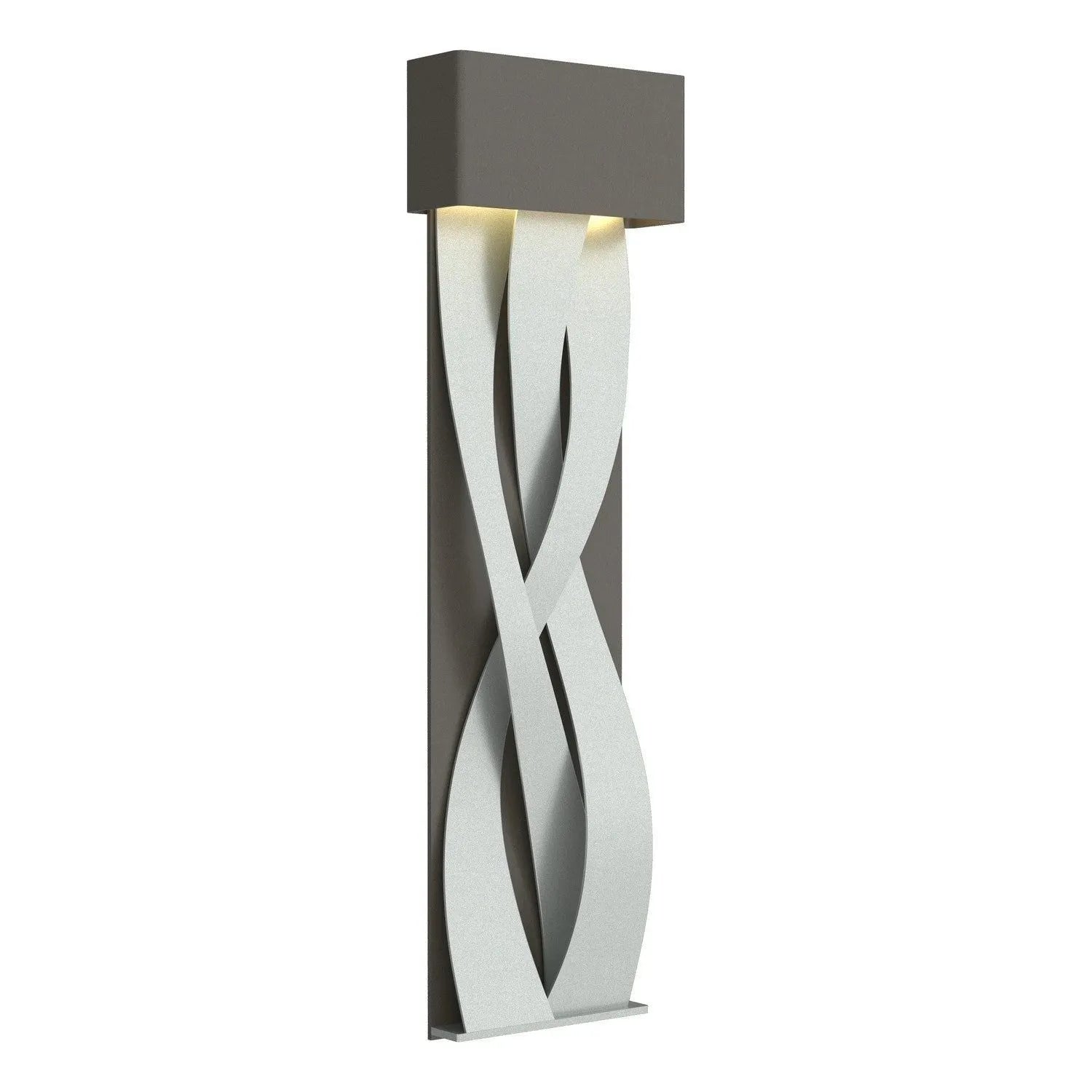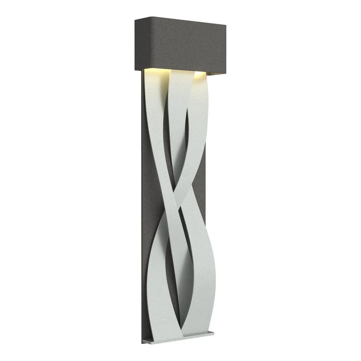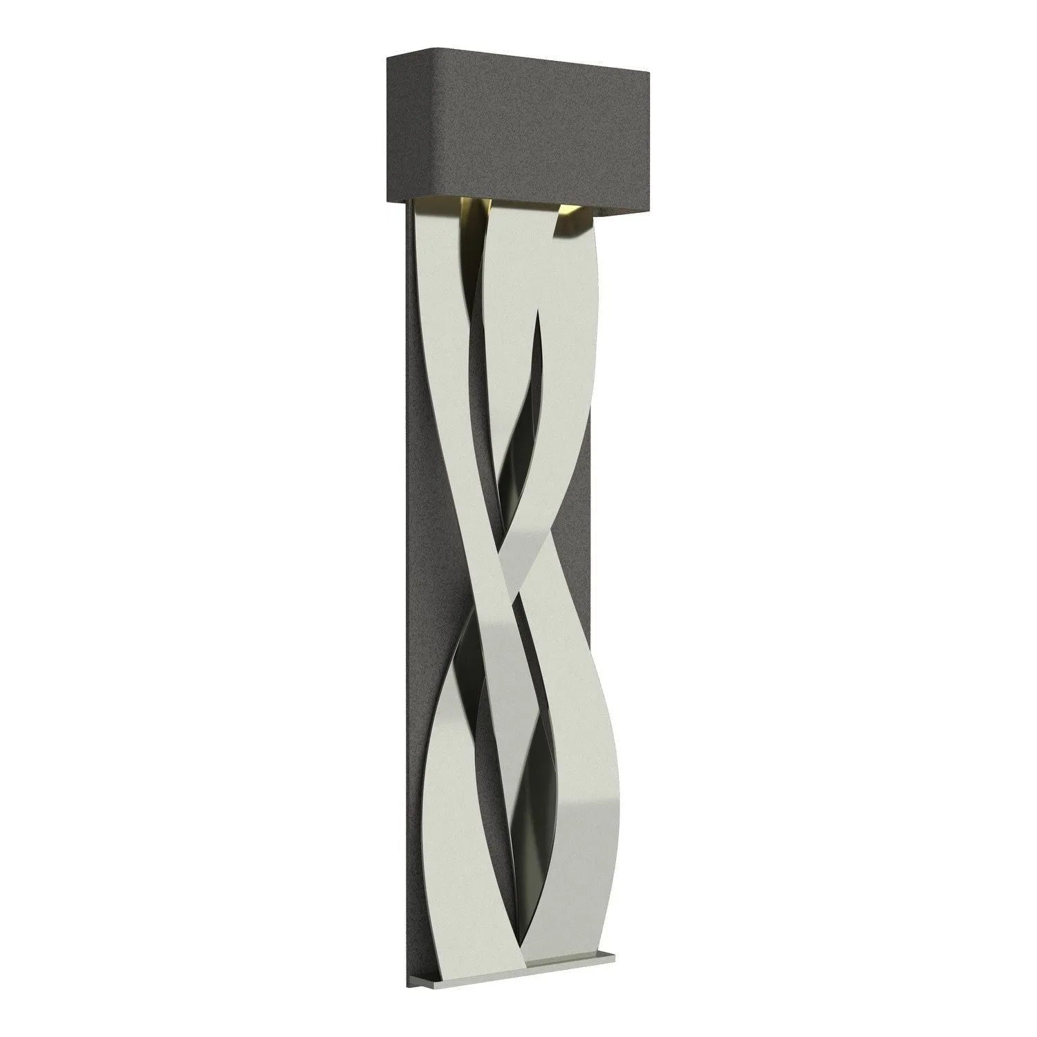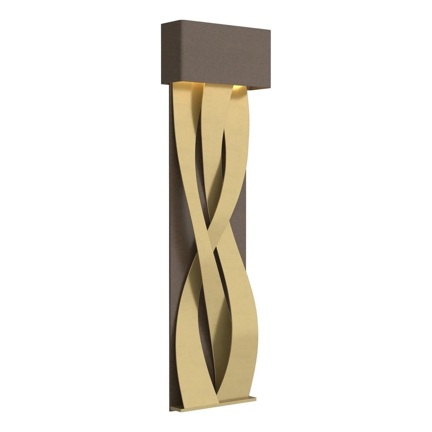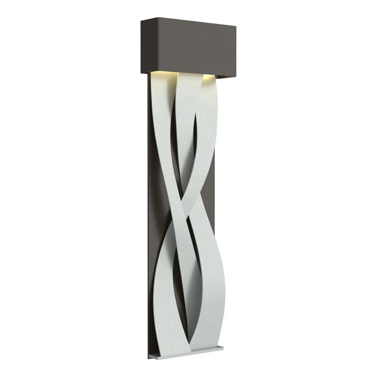 Three bands of metal intertwine to create a stunning sculptural design. The LED light flowing from the enclosure above creates a dramatic play of light and shadow. This transitional design is perfectly suited to both traditional and contemporary settings.