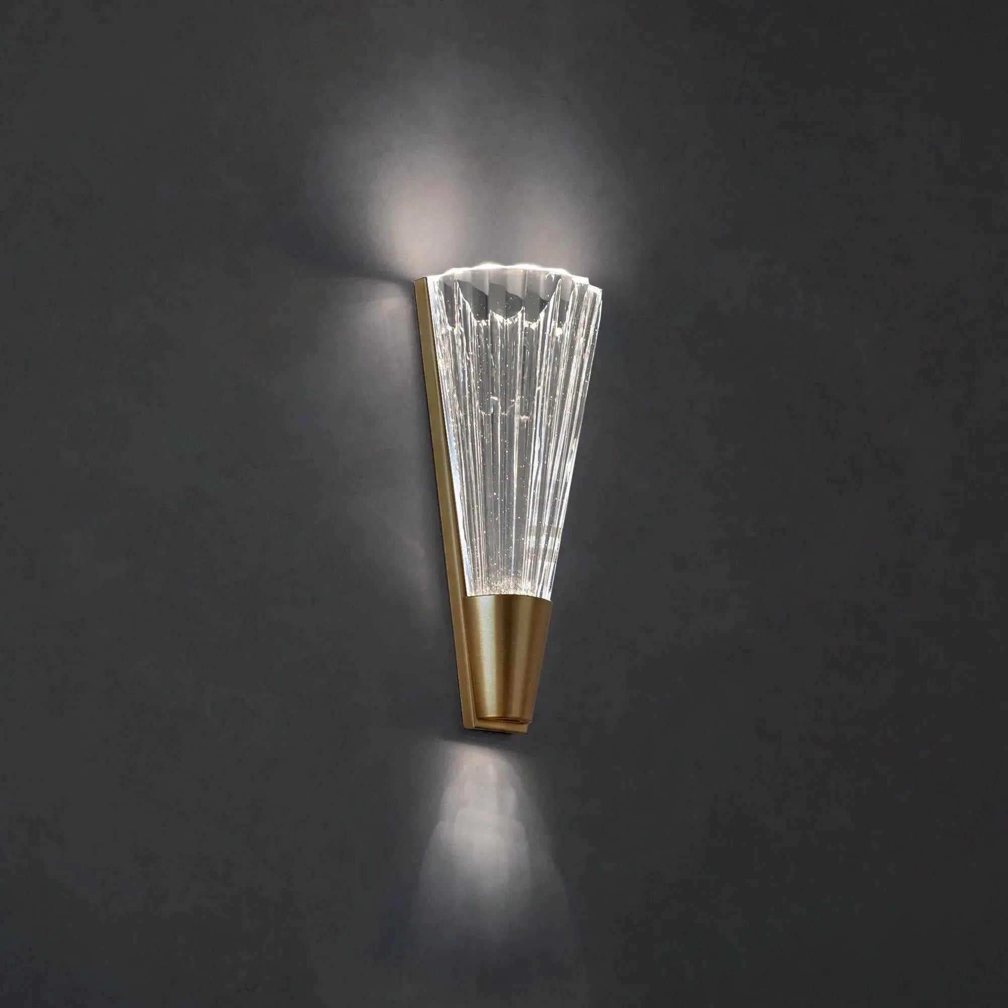 Calming and prescient, Origami proffers a simple elegance. Folds in the patterned Schonbek handcut crystal glass shade illuminate as prisms to bend light. Integral LEDs discreetly offer generous indirect illumination from behind a reflector plate finished in luxurious Aged Brass or Chrome.