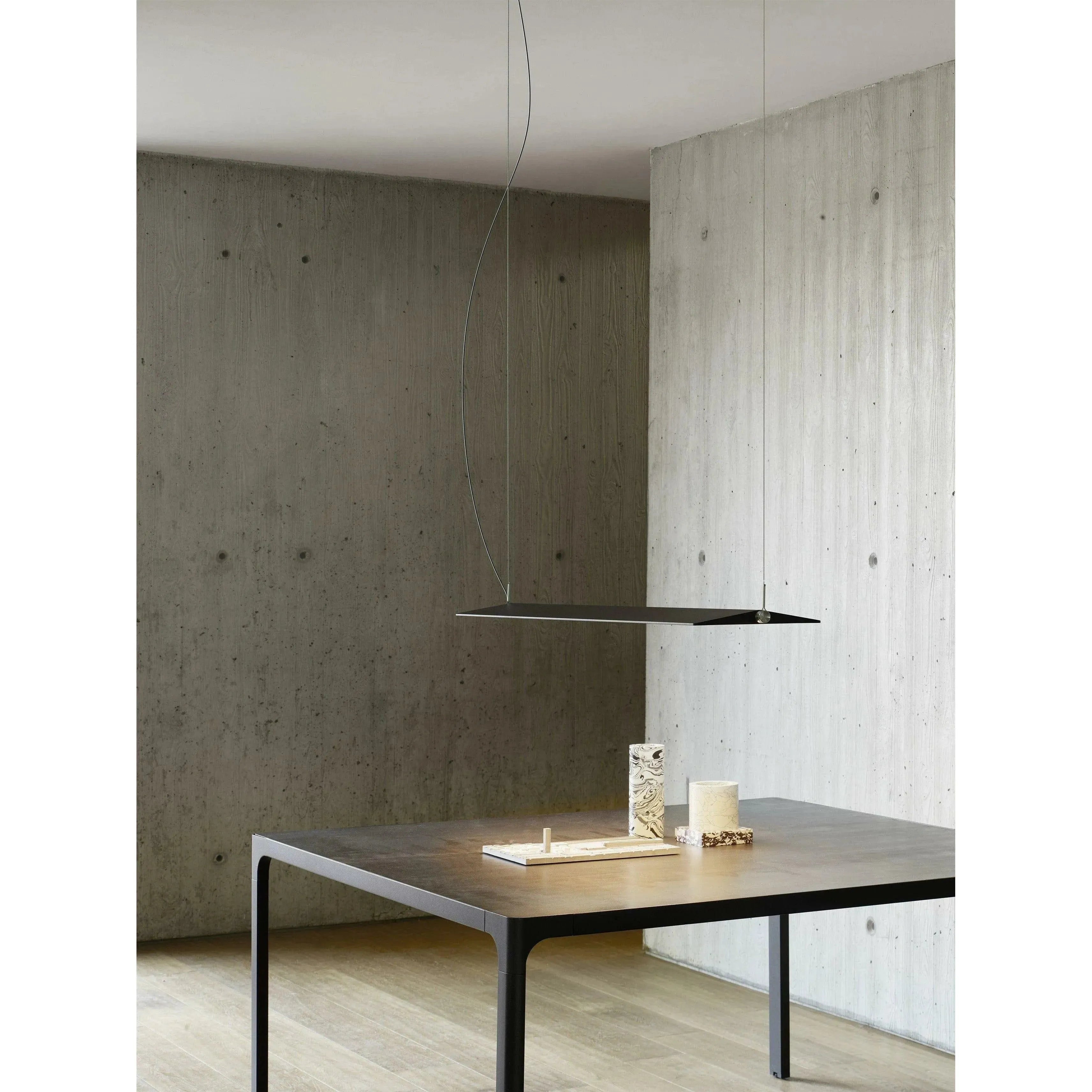 The suspension version of Fienile is made in a single size for the roof, whose lower portion contains a homogeneous light source for high performance without glare. The lamp provides light directed upward and downward, thanks to great freedom of movement, permitting rotation of 360 degrees.