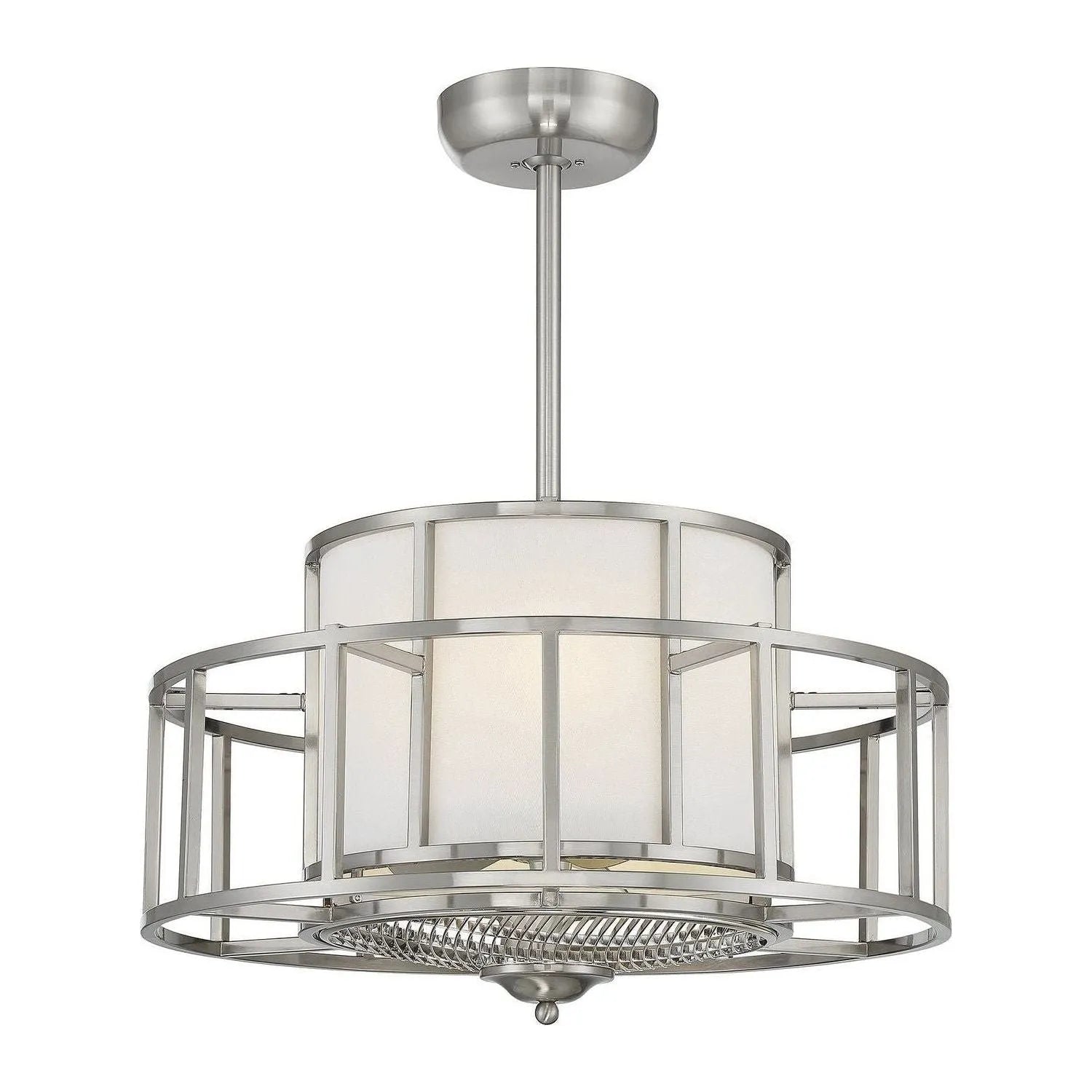 The four-light Oslo Fan D'Lier makes a beautiful visual statement in any room. In addition to serving as a fashion-forward chandelier with a white fabric shade and a sculptural outer frame in a warm finish, Oslo is equipped with a functional ceiling fan cleverly concealed within its 30" high x 26" wide frame. Illumination is provided by four Edison-base bulbs.