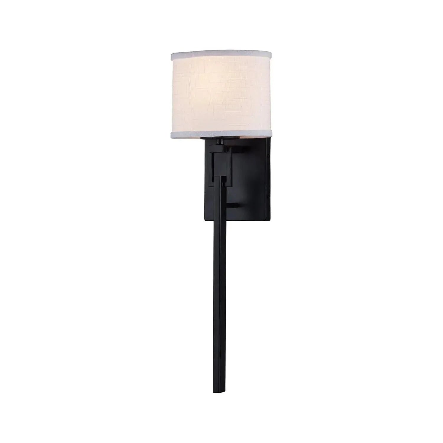 Alpine Wall Sconce by Justice Designs — a refined study in proportion and material that elevates transitional and modern interiors. The sconce pairs a slender, squared metal rod and rectangular backplate in a deep matte finish with a soft, textured white drum shade for balanced contrast and calm illumination.