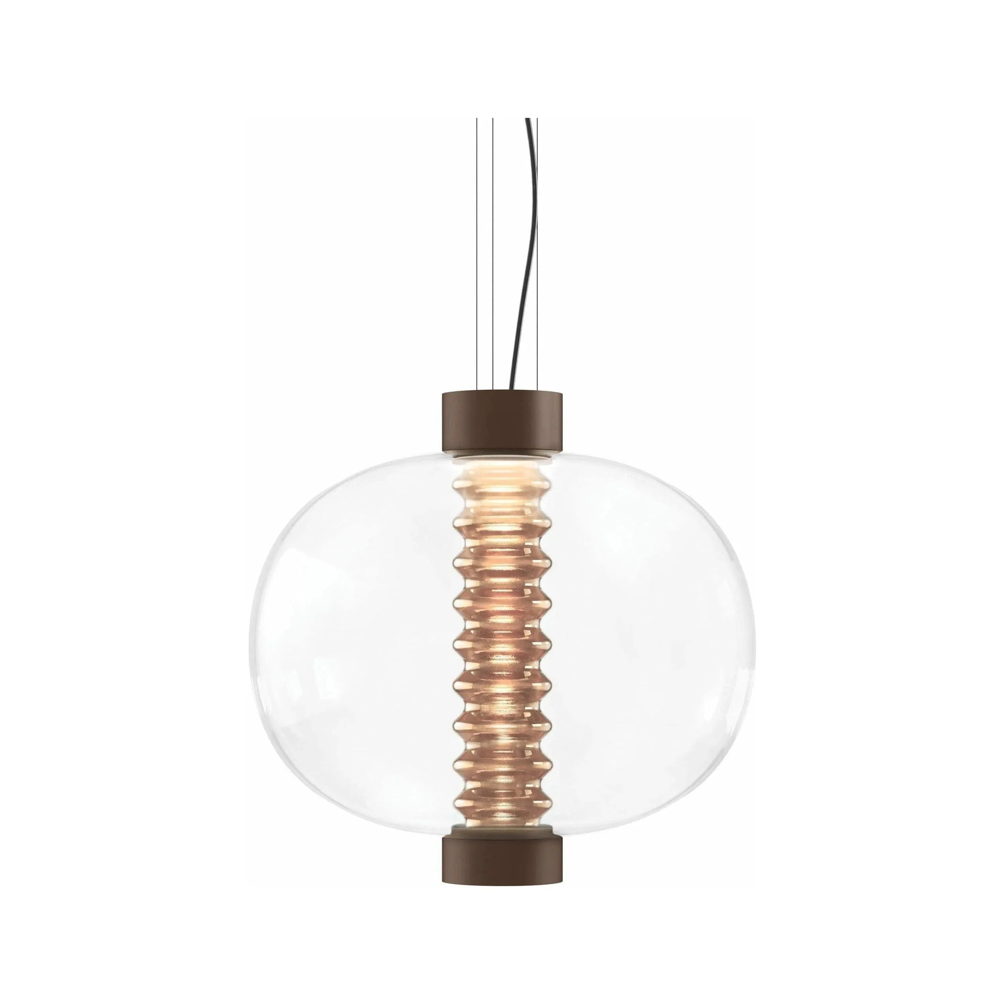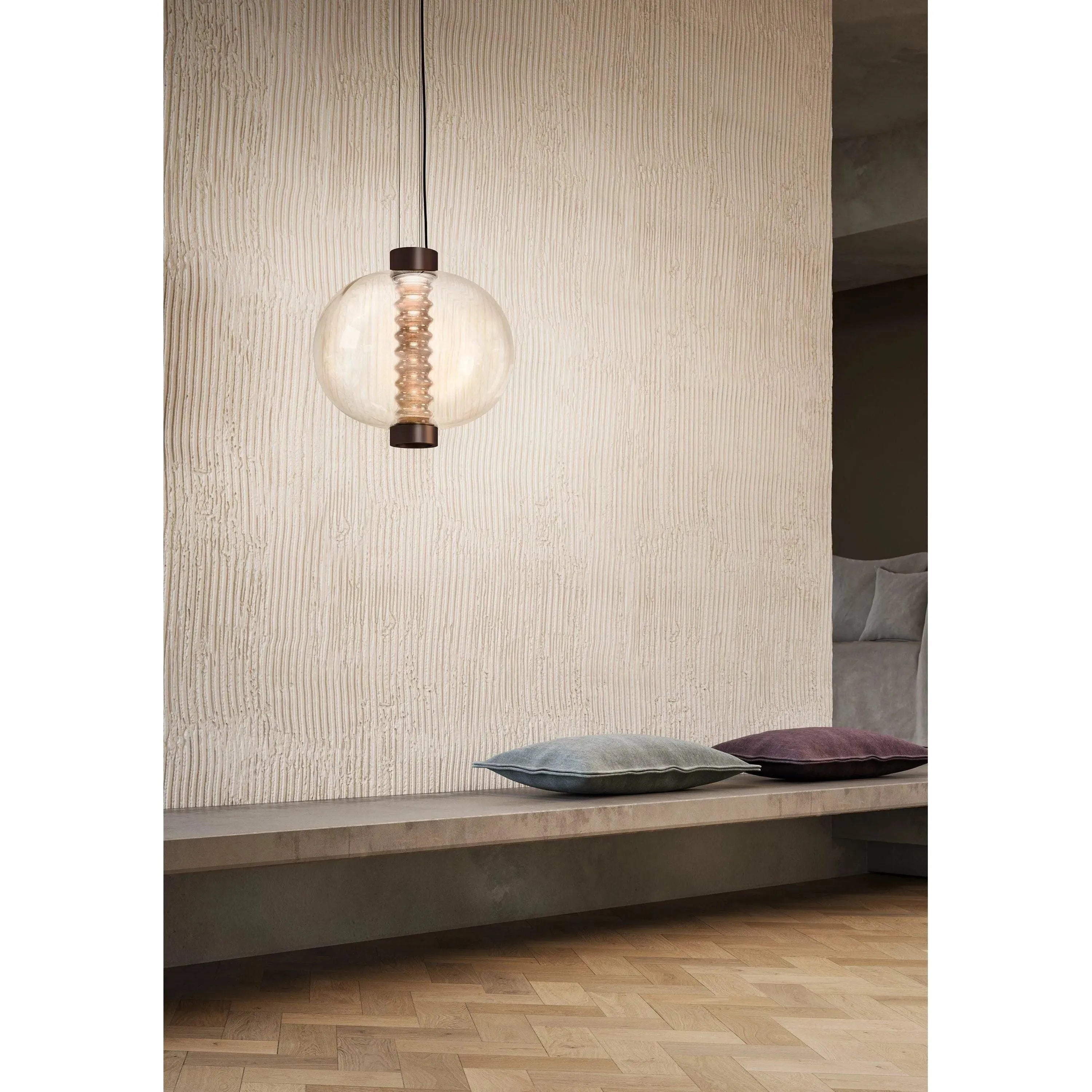 Two different forms of glass. An ethereal, transparent bubble for the diffuser. A textured inner cylinder for the light source which resembles the filaments of traditional incandescent light bulbs. The continuously refracted light takes on a tangible appearance thanks to the interaction between the two elements.