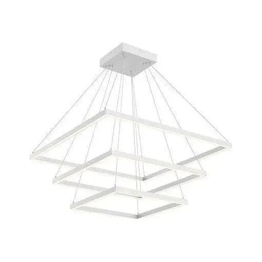 Piazza 3-Tier Chandelier by Kuzco Lighting — a sculptural, modern centerpiece that defines space through clean geometry and refined finish. Three nested square tiers suspend on slender cables from a minimalist canopy, creating layered illumination and a sense of architectural balance ideal for entryways, dining areas, or double-height volumes.