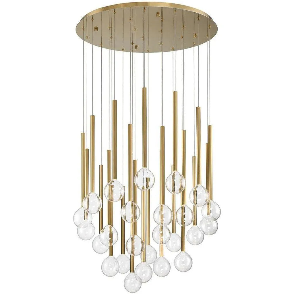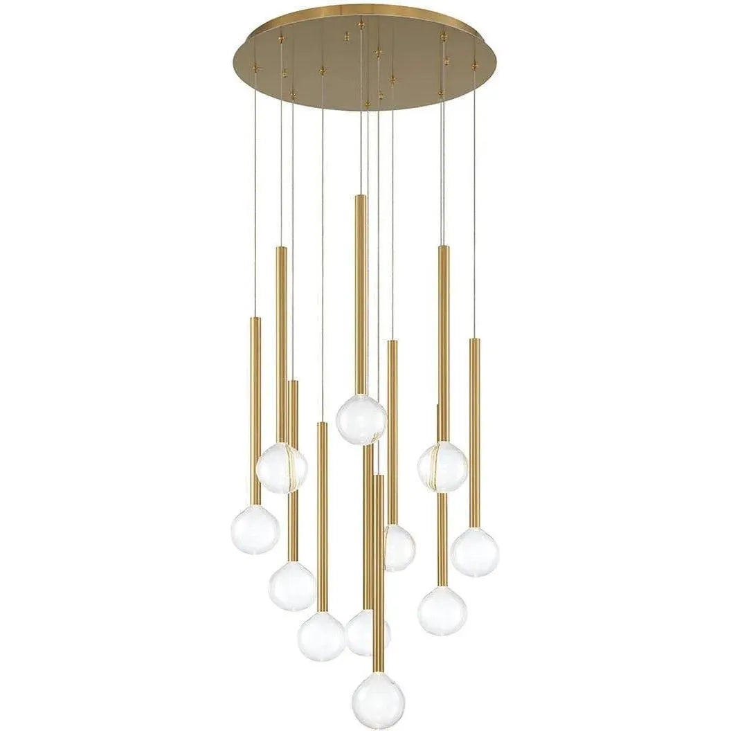 Crafted to appeal to designers and architects, the fixture pairs precision metalwork with hand‑finished glass for consistent light diffusion and visual depth. The large round canopy and individually suspended drops deliver a layered glow ideal over stairwells, dining spaces, or hotel lobbies.