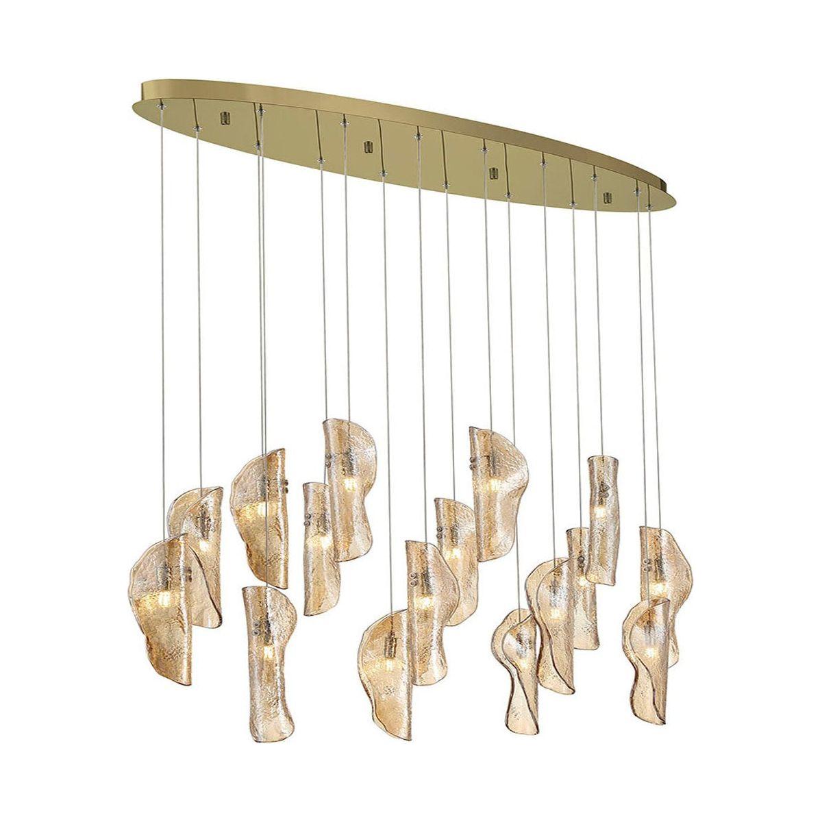 Key features: hand-sculpted glass pendants suspended on adjustable cables, integrated G4 LED lamps (3000K, high CRI), and an elongated oval canopy engineered for linear arrangements. Available in multiple sizes (examples: 38", 48", 60", 72" widths) with a maximum drop to ~156.5" to suit grand volumes.