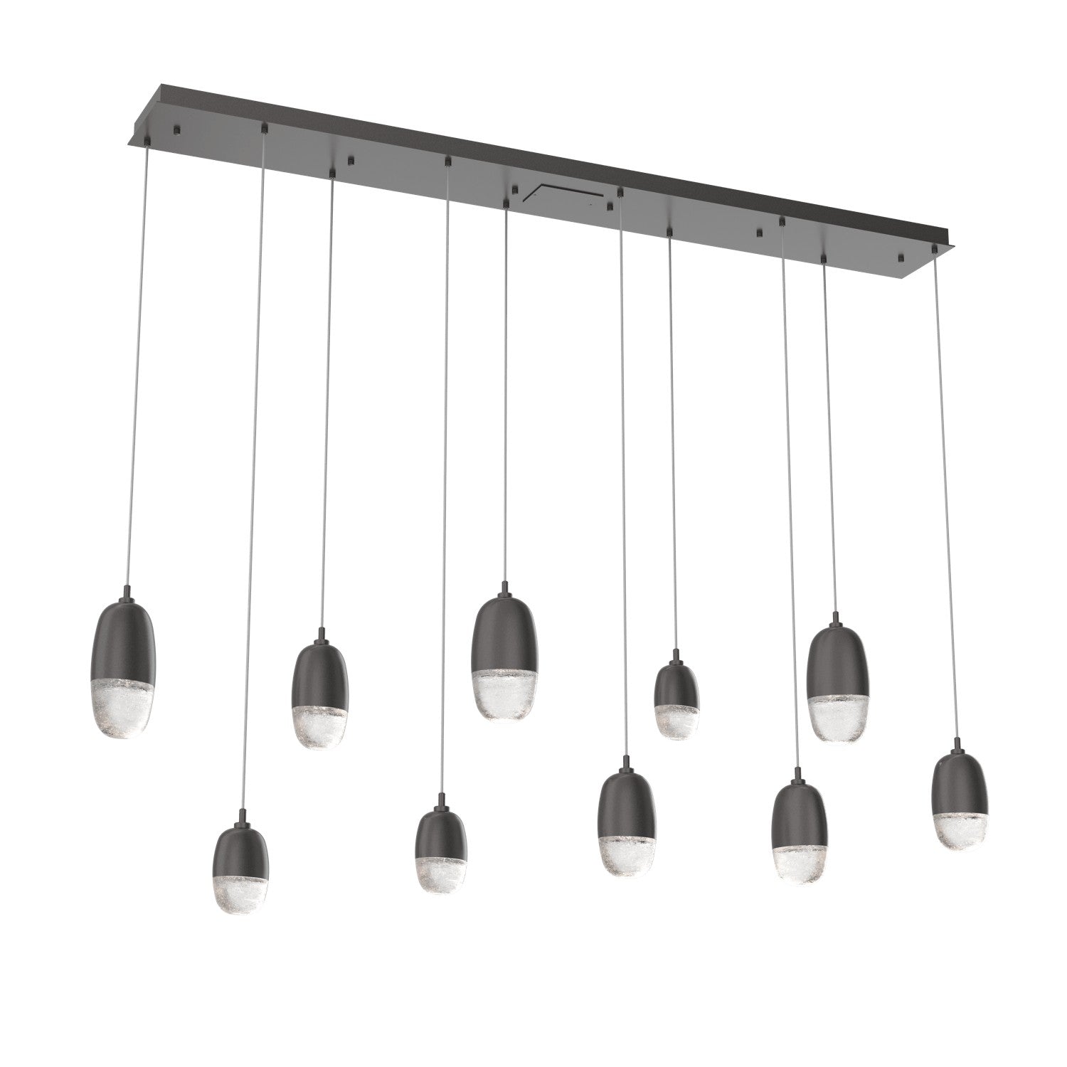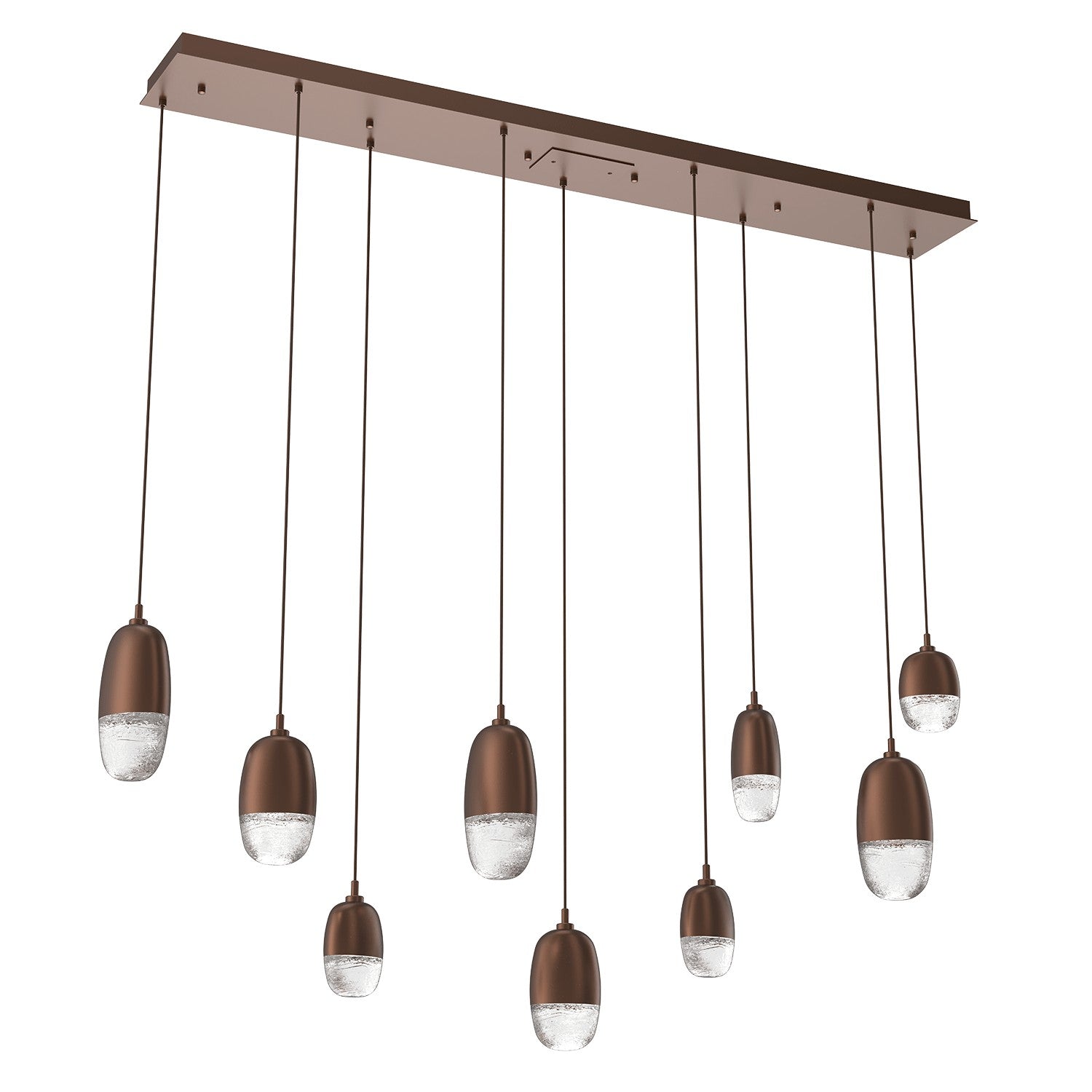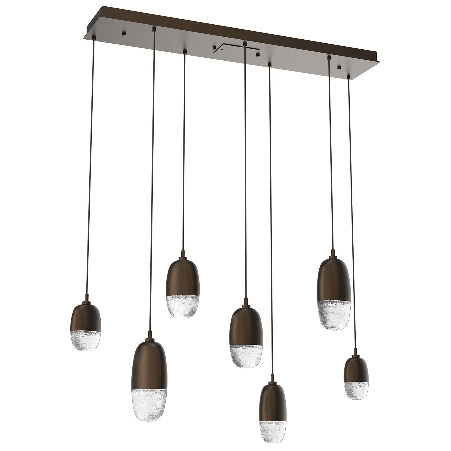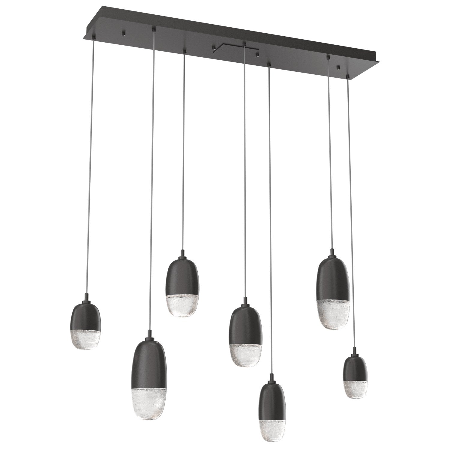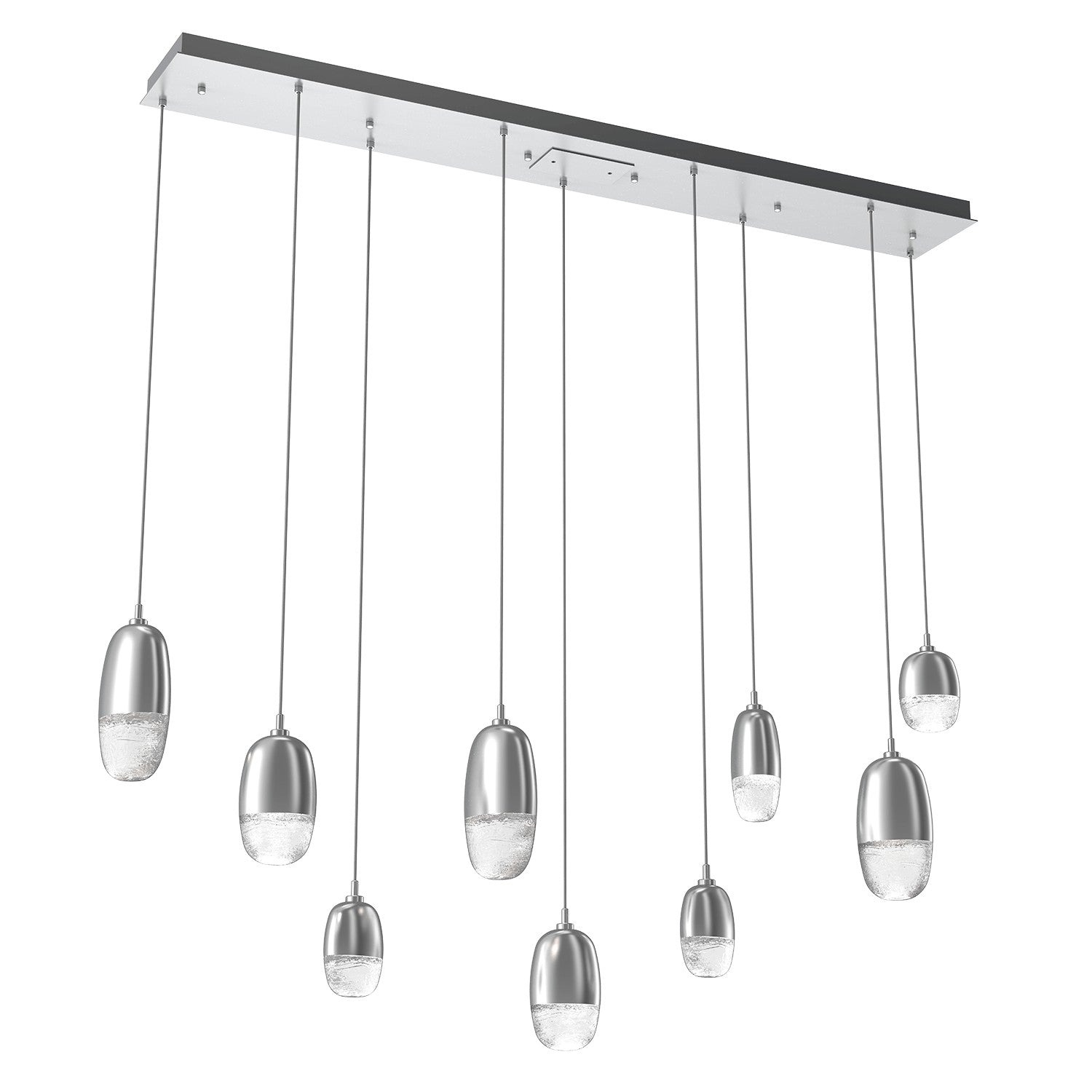 A versatile lighting solution ideal for a wide range of contemporary and modern spaces, this linear multi-port design features a rectangular canopy with 7 or 9 Pebble pendants in artisan cast glass
