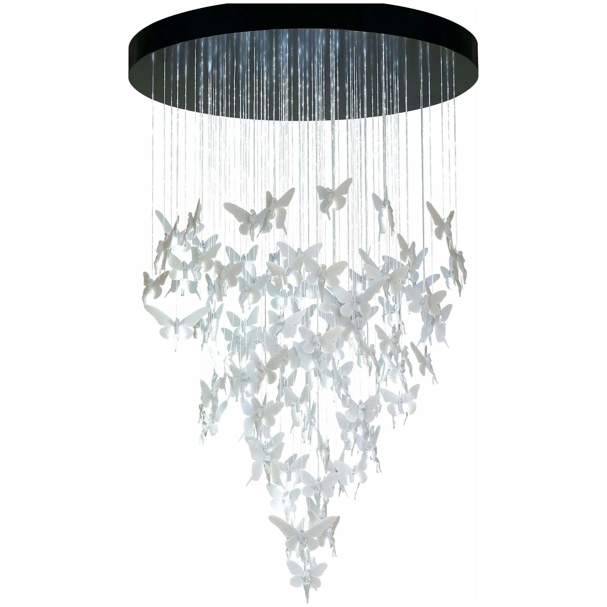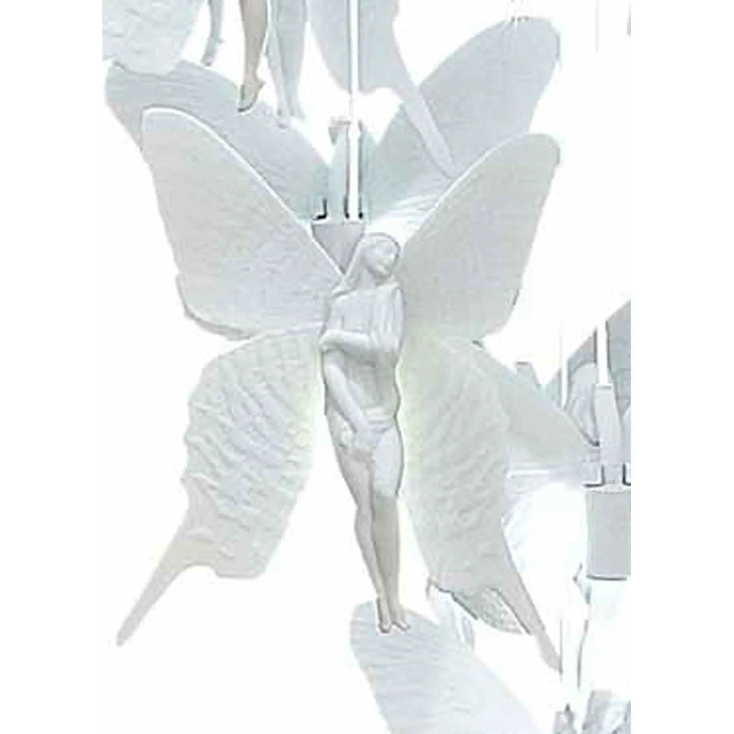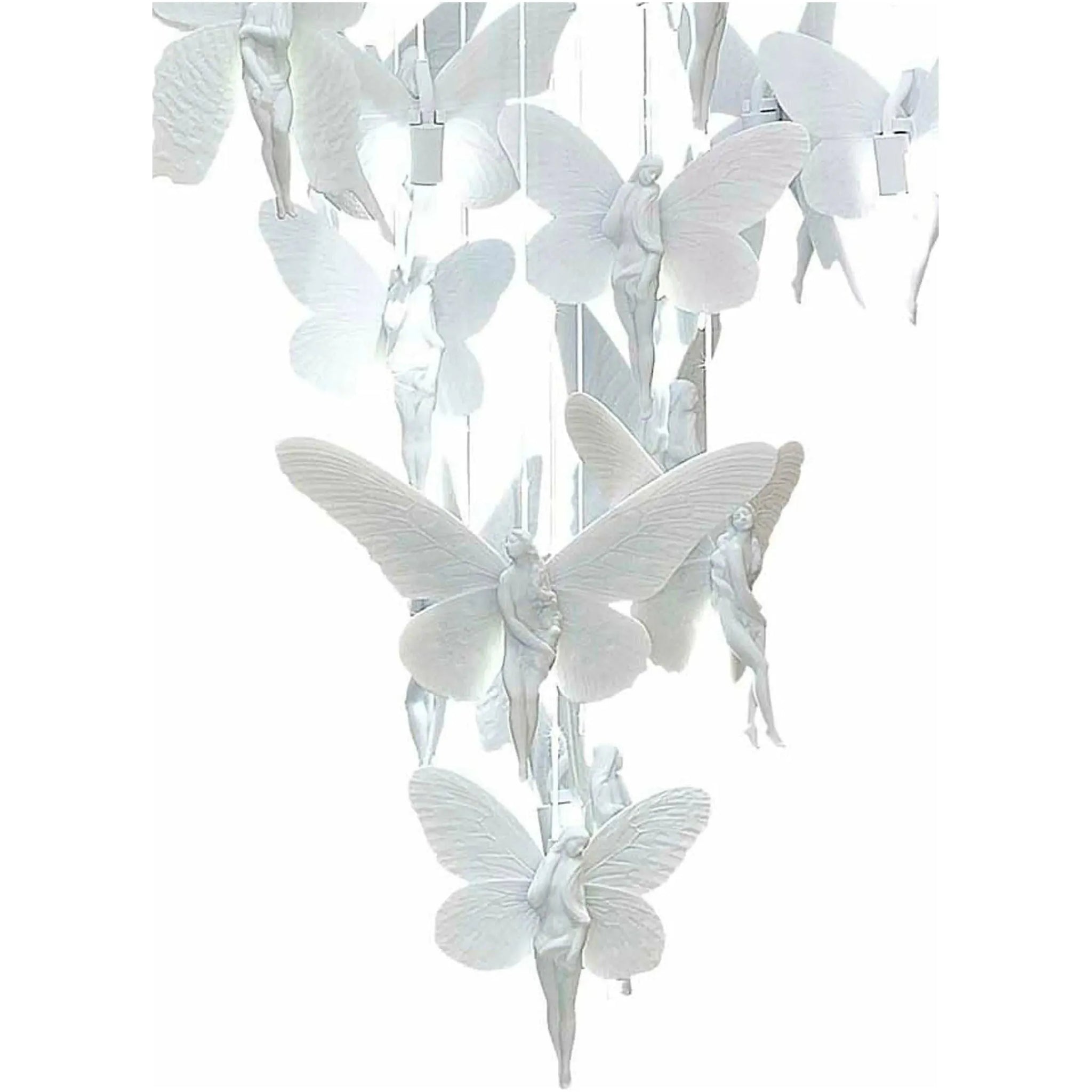 Chandelier with handmade fairies in matte white porcelain and gold lustre cascading 1.1 metres over a fibre optic with subtle highlights. Designed by Bodo Sperlein.