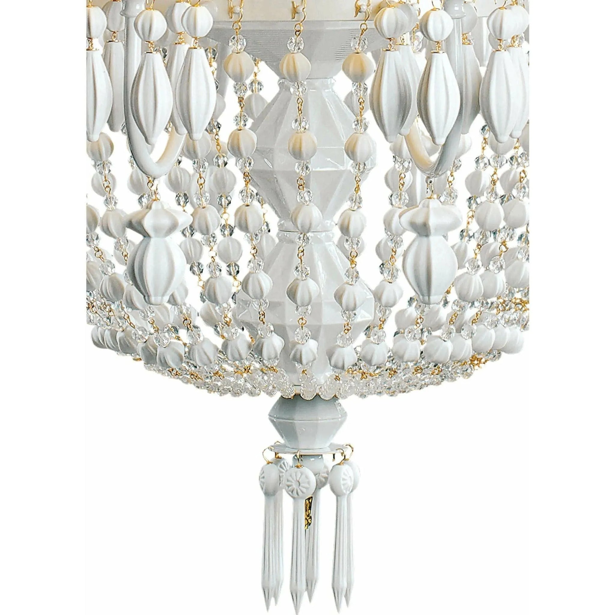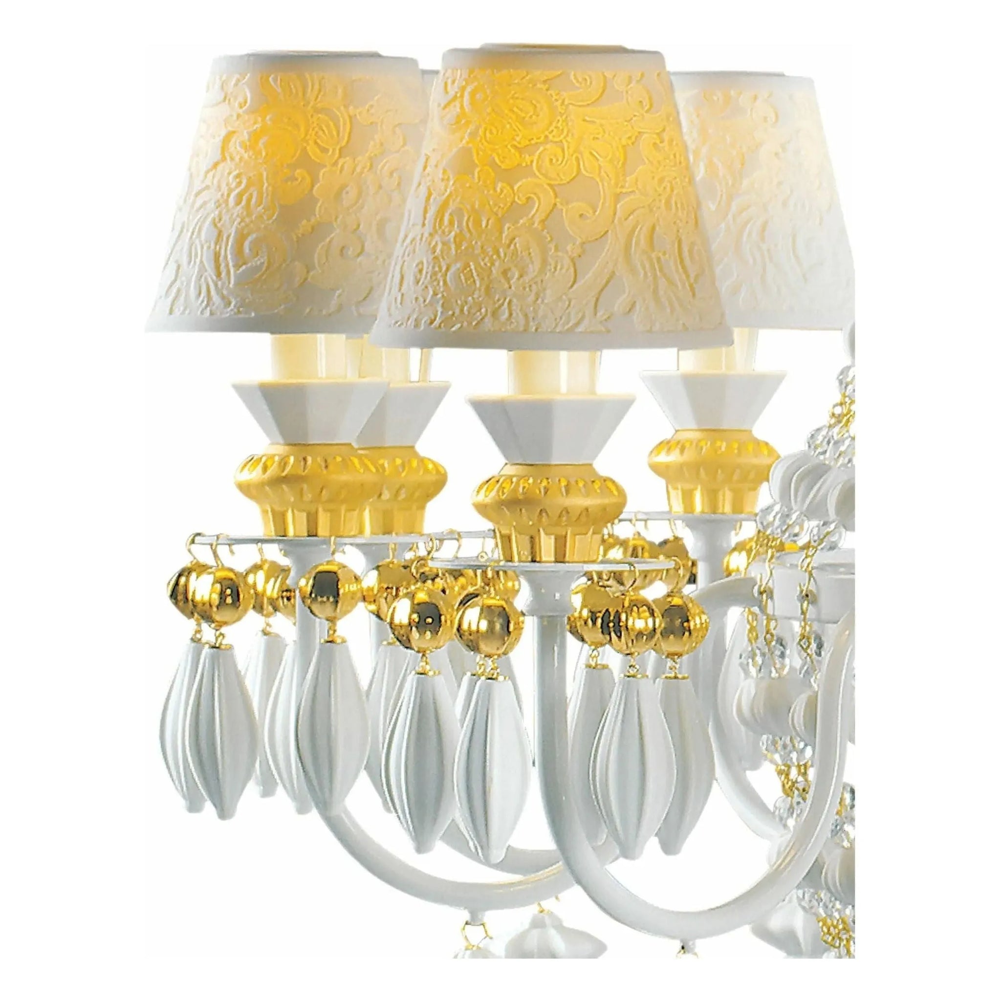 Handmade hanging ceiling lamp with white metal chandeliers and translucent porcelain tulips with twelve lights.
