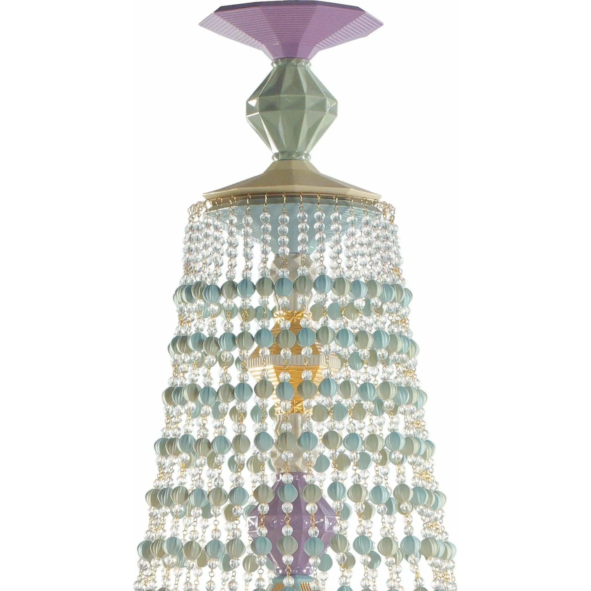 Handmade hanging ceiling lamp with metallic chandeliers in shades of green, blue and pink, and translucent porcelain tulips with twelve lights.