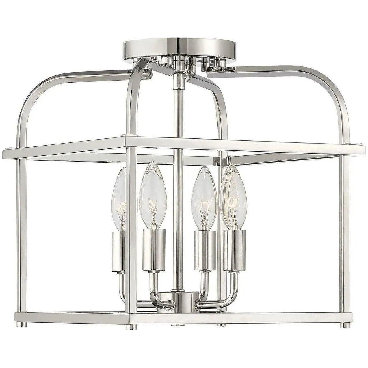 Four candelabra-style lights sit within the open cage, offering balanced ambient illumination and compatibility with dimmers for layered lighting schemes. The semi-flush profile keeps sightlines low while preserving architectural impact—perfect for modern, transitional, minimalist, or farmhouse interiors.