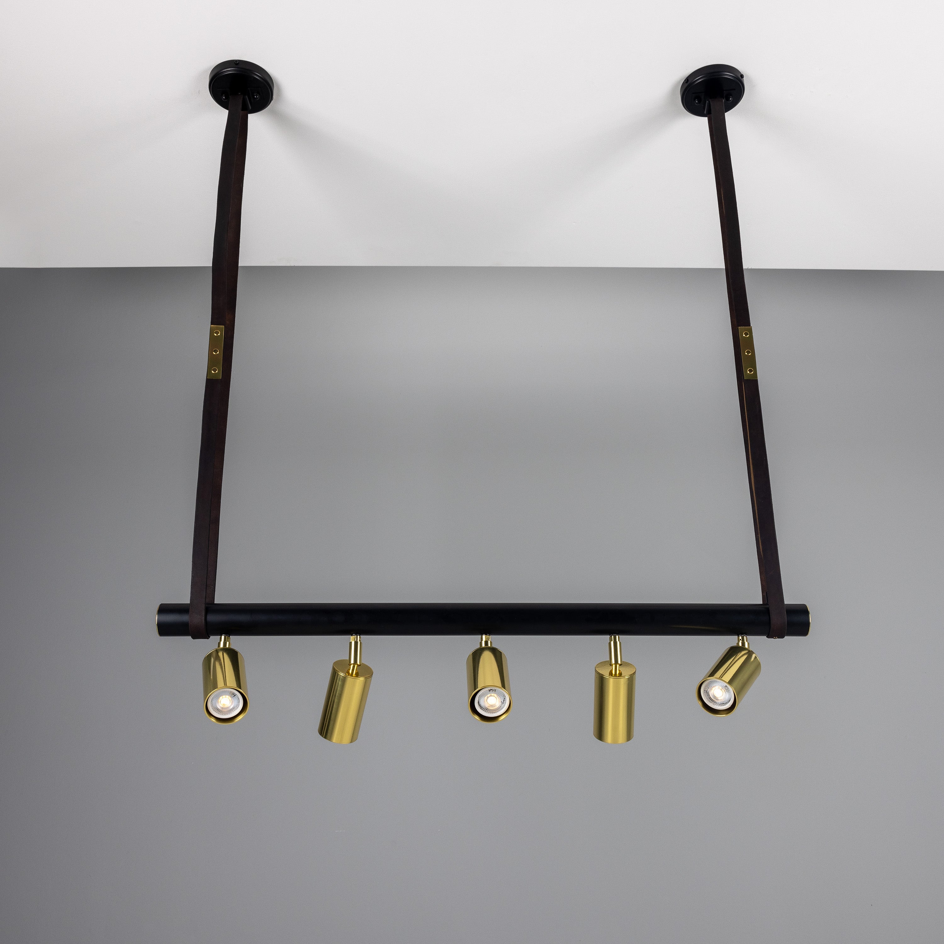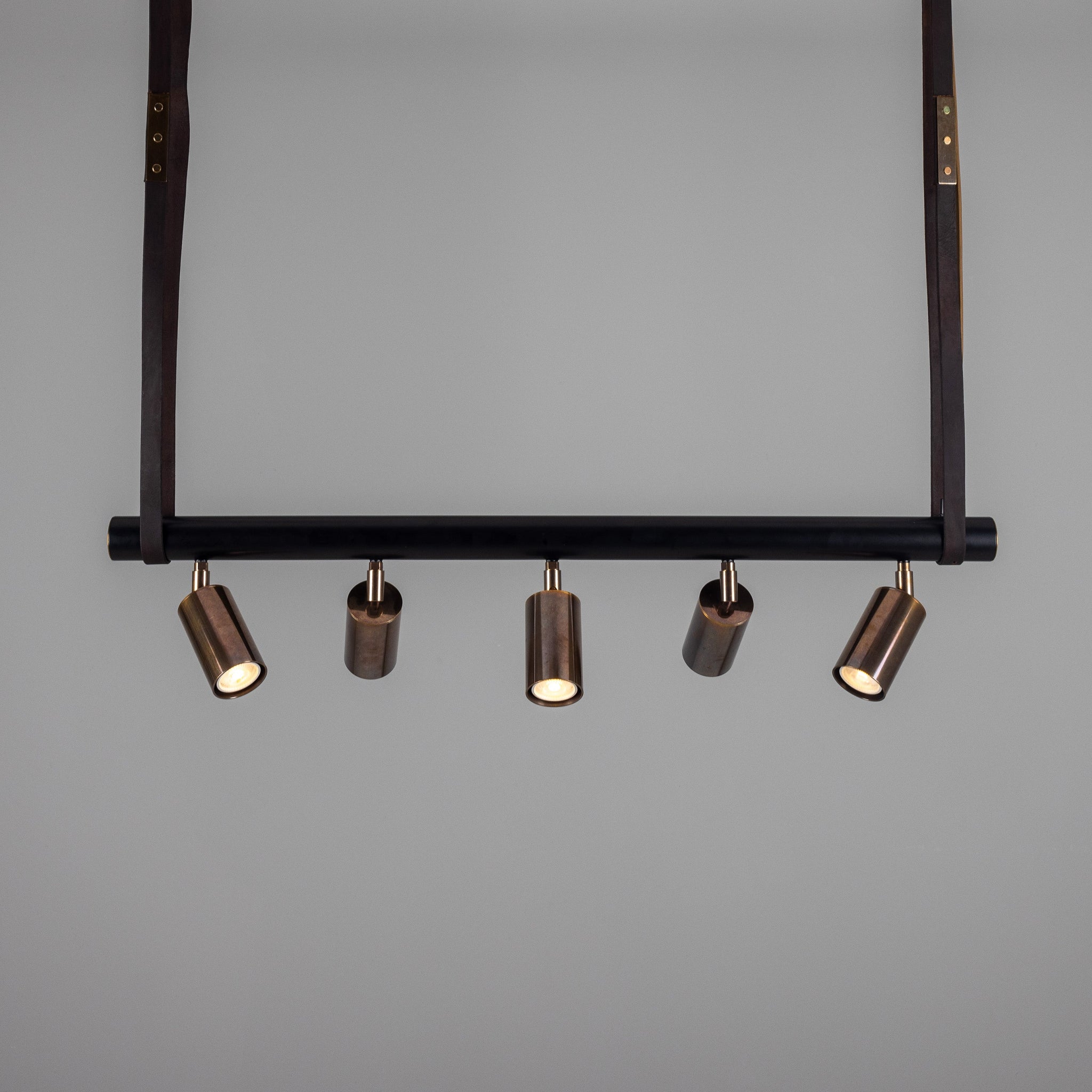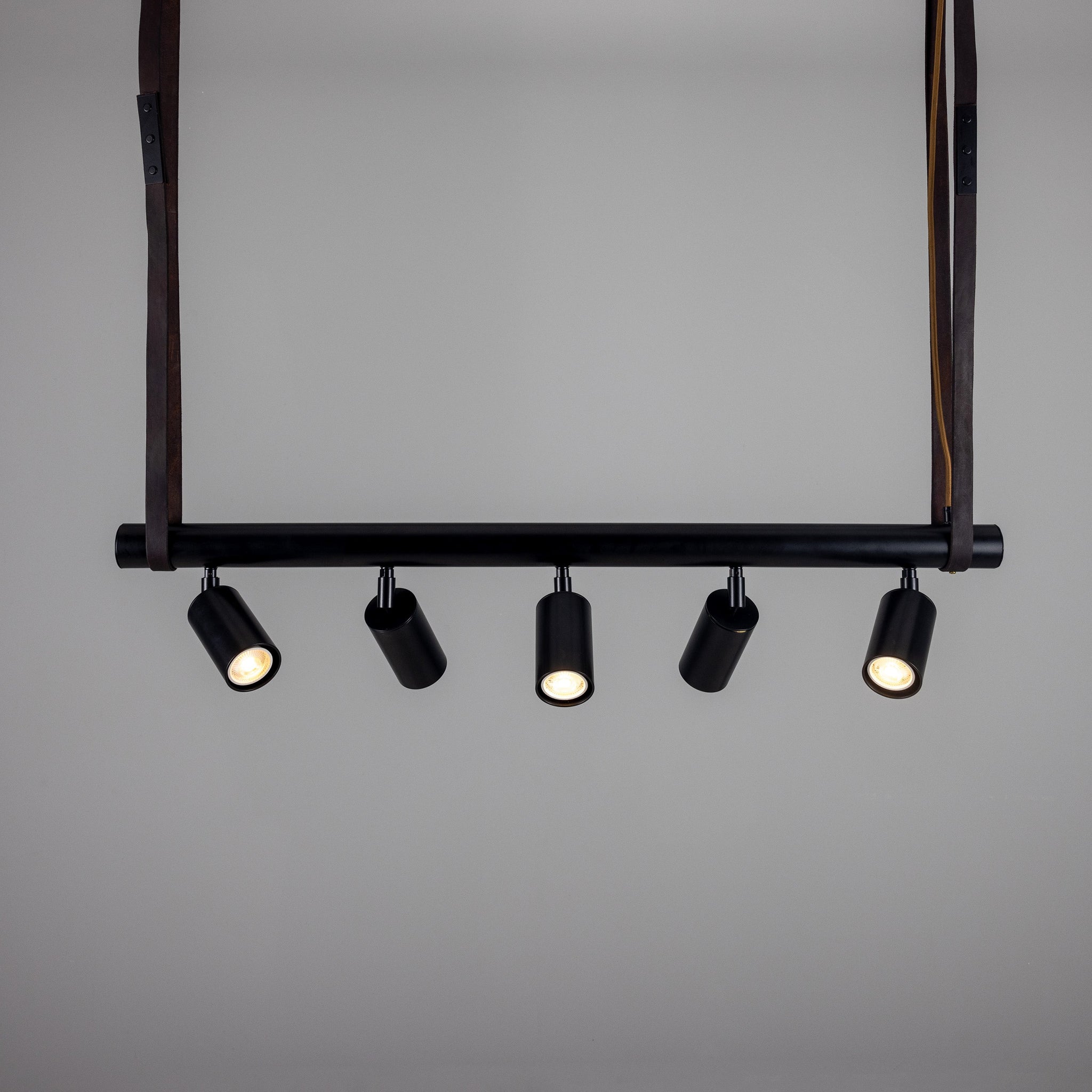 Holmes Chandelier from Mullan Lighting is a study in restrained, purposeful design — a linear fixture that pairs sculptural presence with precise task illumination. Its clean black metal bar suspends five adjustable cylindrical spot heads on contrasting leather straps, creating a refined balance of industrial and handcrafted detail.