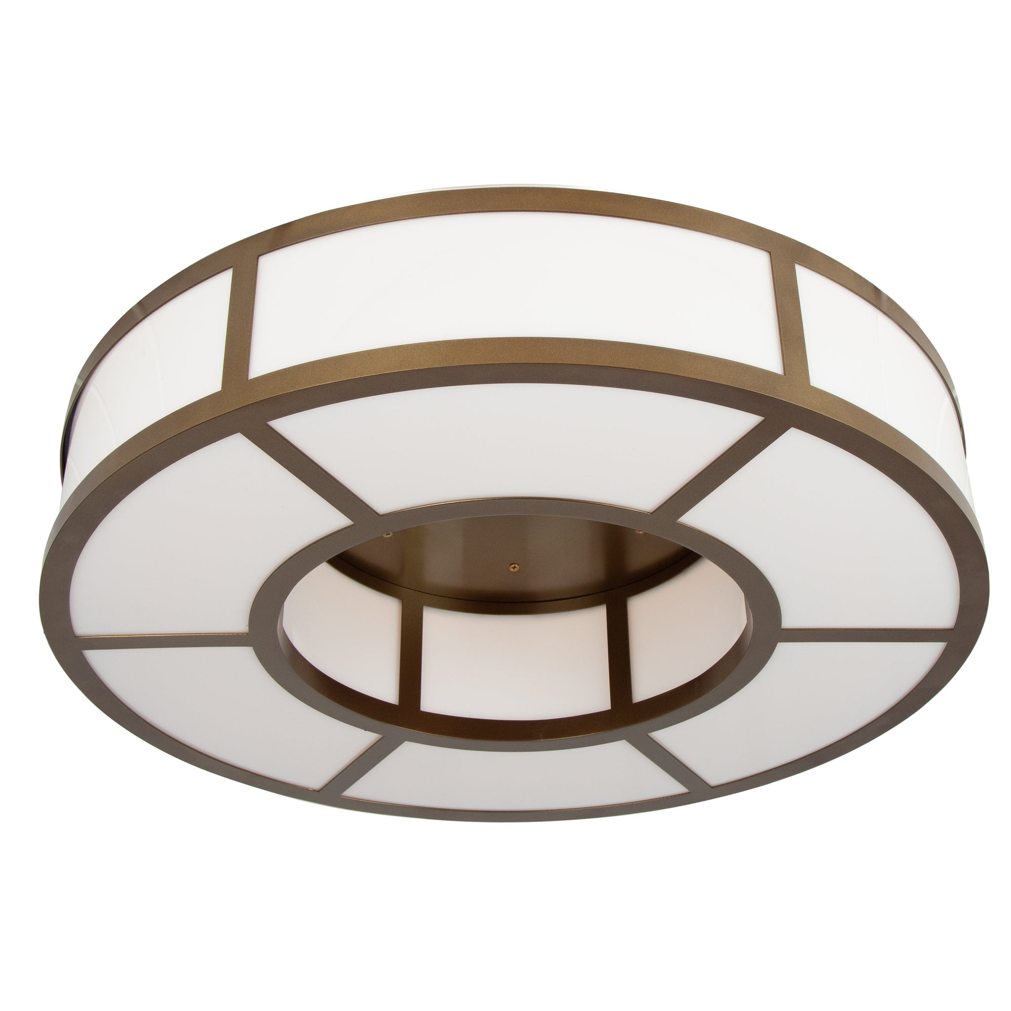 Crafted from opal acrylic and steel with a powder‑coated bronze finish, the fixture demonstrates precise craftsmanship and clean, architectural lines. Integrated LED illumination delivers continuous, dimmable light while remaining low profile (70cm diameter; 14.2cm height), making it a practical choice for ceilings with limited drop.