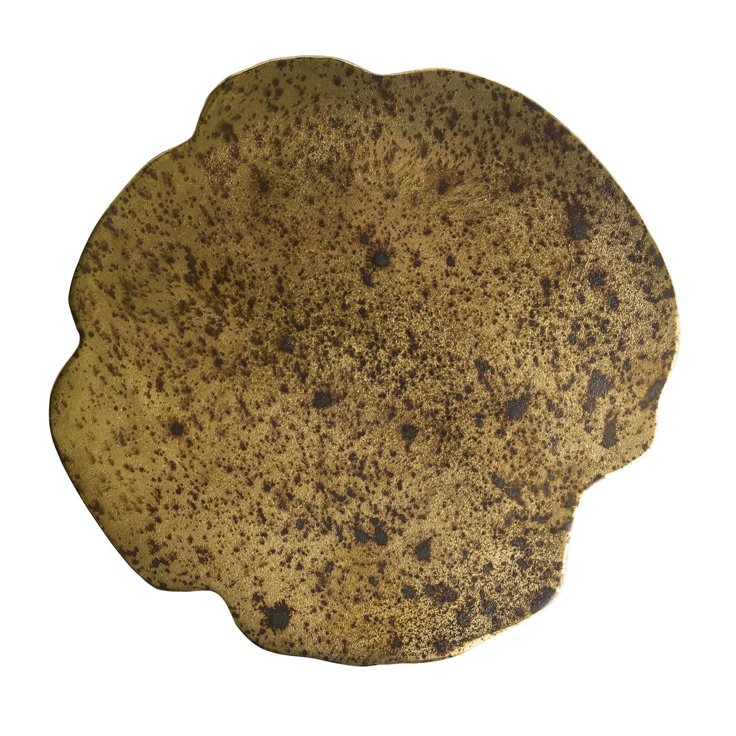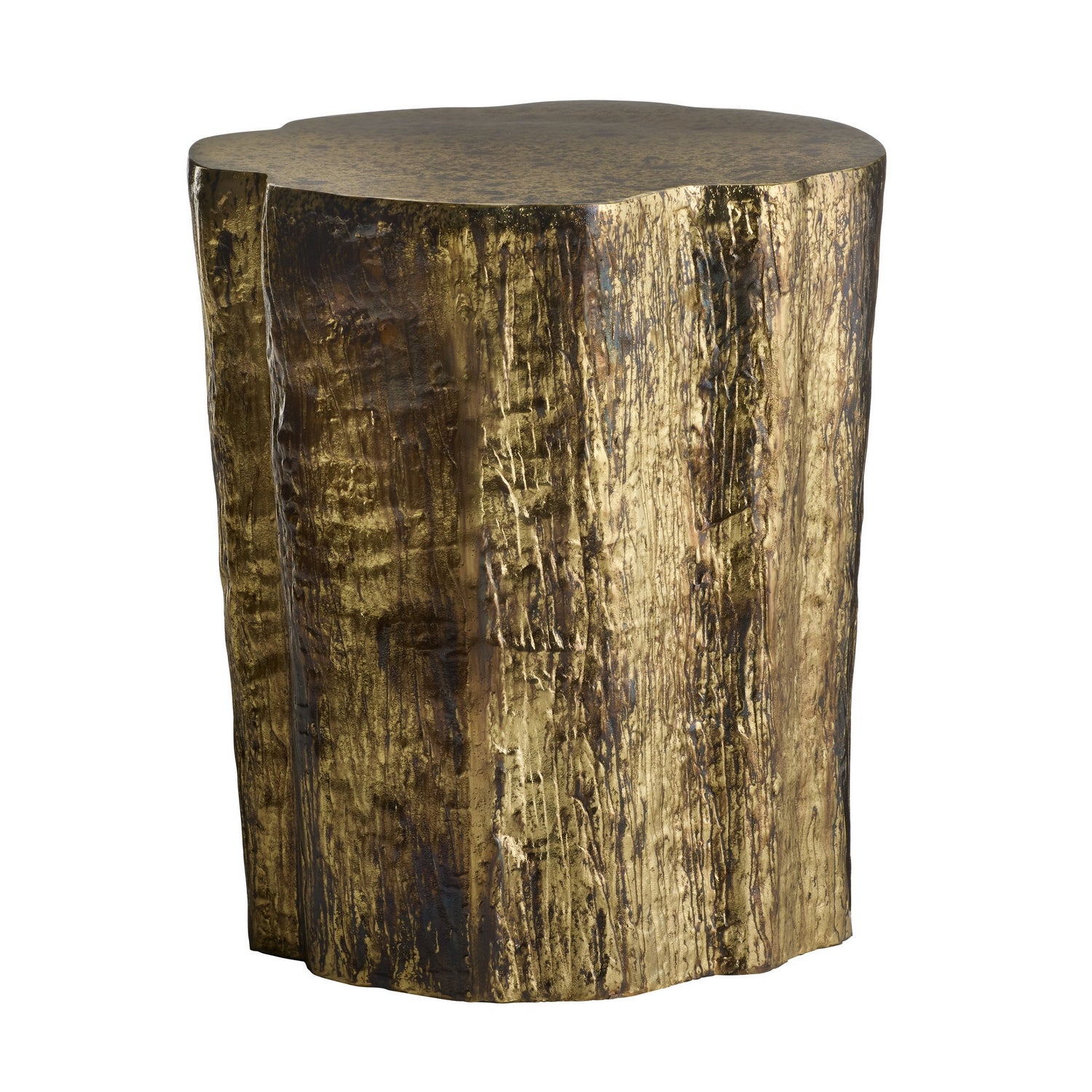 This faux bois end table of cast aluminum plated in antique brass, then distressed. The resulting finish delivers an array of metallic hues that will vary from piece to piece. Finish will vary.