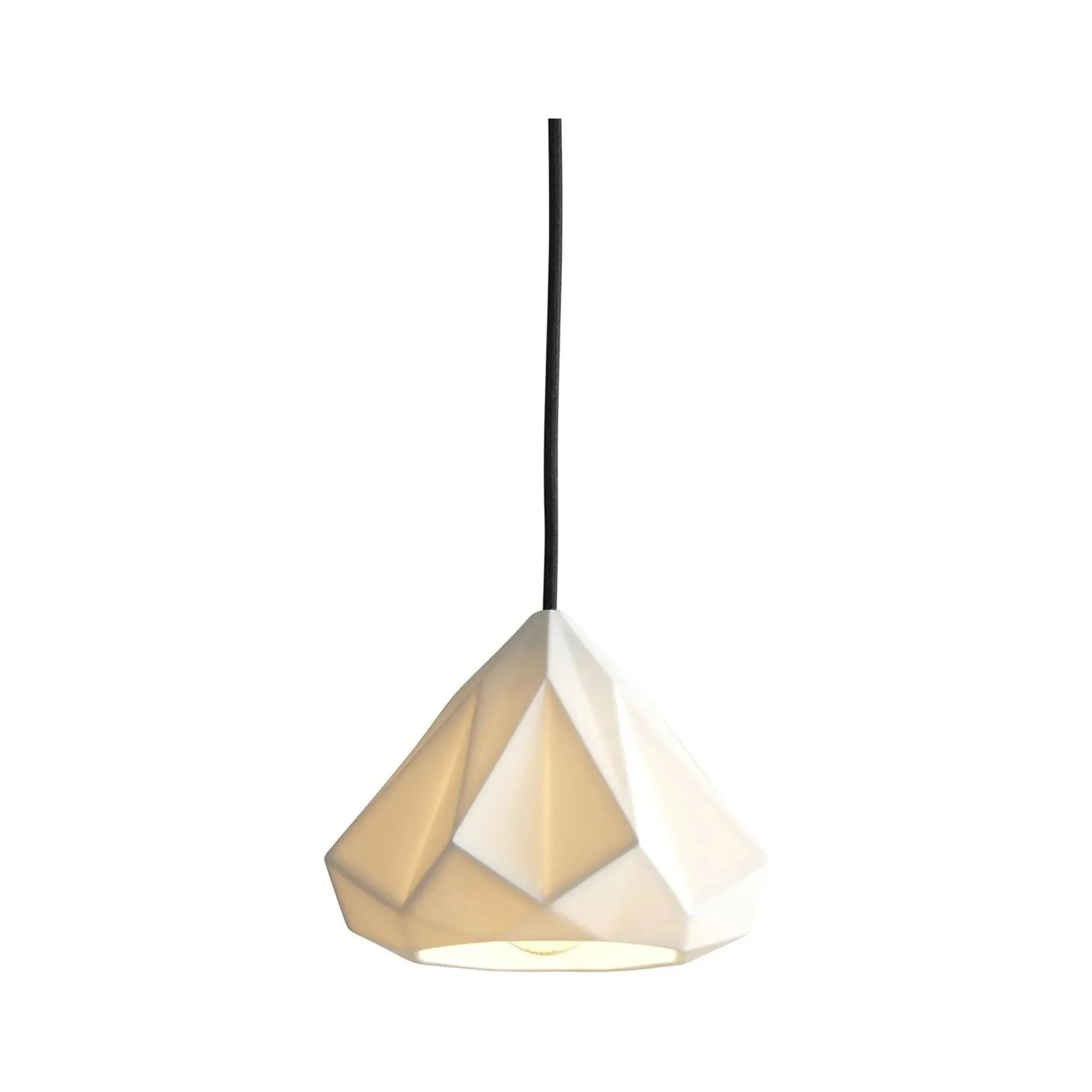 Hatton Pendant Lights have intricately beautiful bone china shades. Using highly skilled and labour intensive processes, bone china has been transformed in to multi faceted, symmetrical, gem-like forms. When switched off the lights have an angular sculptural beauty, and when switched on they provide warm, ambient lighting with dramatic lines and shadows. The lights are available in different shade designs. Each pendant has a complementing faceted bone china ceiling rose, with a contrasting black cotton braided cable, providing a contemporary edge. For a truly iconic statement piece, choose one of the Grouping of Three or Triangular Grouping styles.