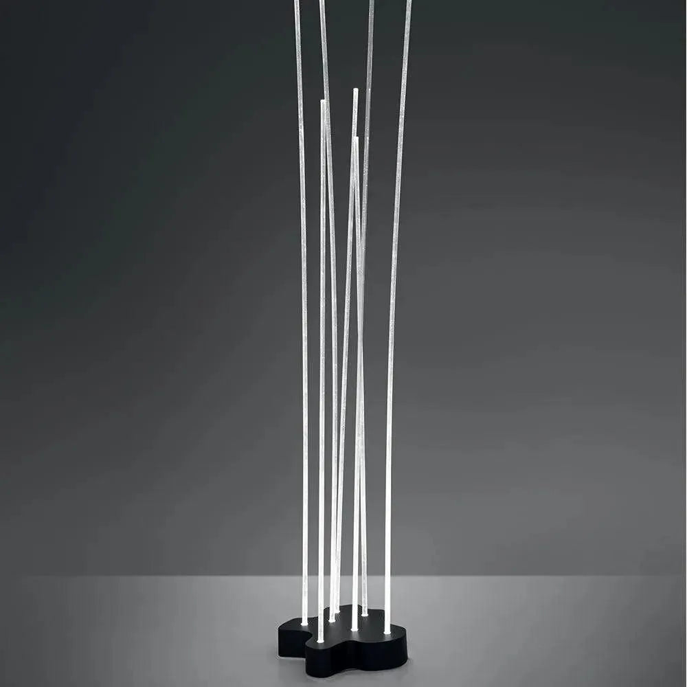 Seven flexible, transparent PMMA rods create tubes of LED light flowing upwards from a black painted aluminum base.