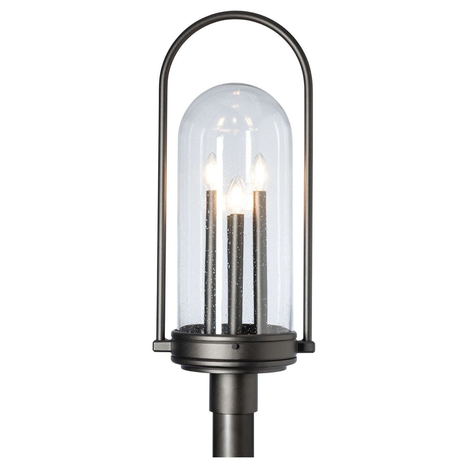 First impressions begin before guests arrive at the door. Four tall, exposed candlesticks are on display within the clear, seeded glass bell. The surrounding metalwork emphasizes this fresh interpretation of a traditional style. Coordinating accessories (post, pier mount) are sold separately. Available in a choice of AAMA 2604-rated Coastal Outdoor Finishes.