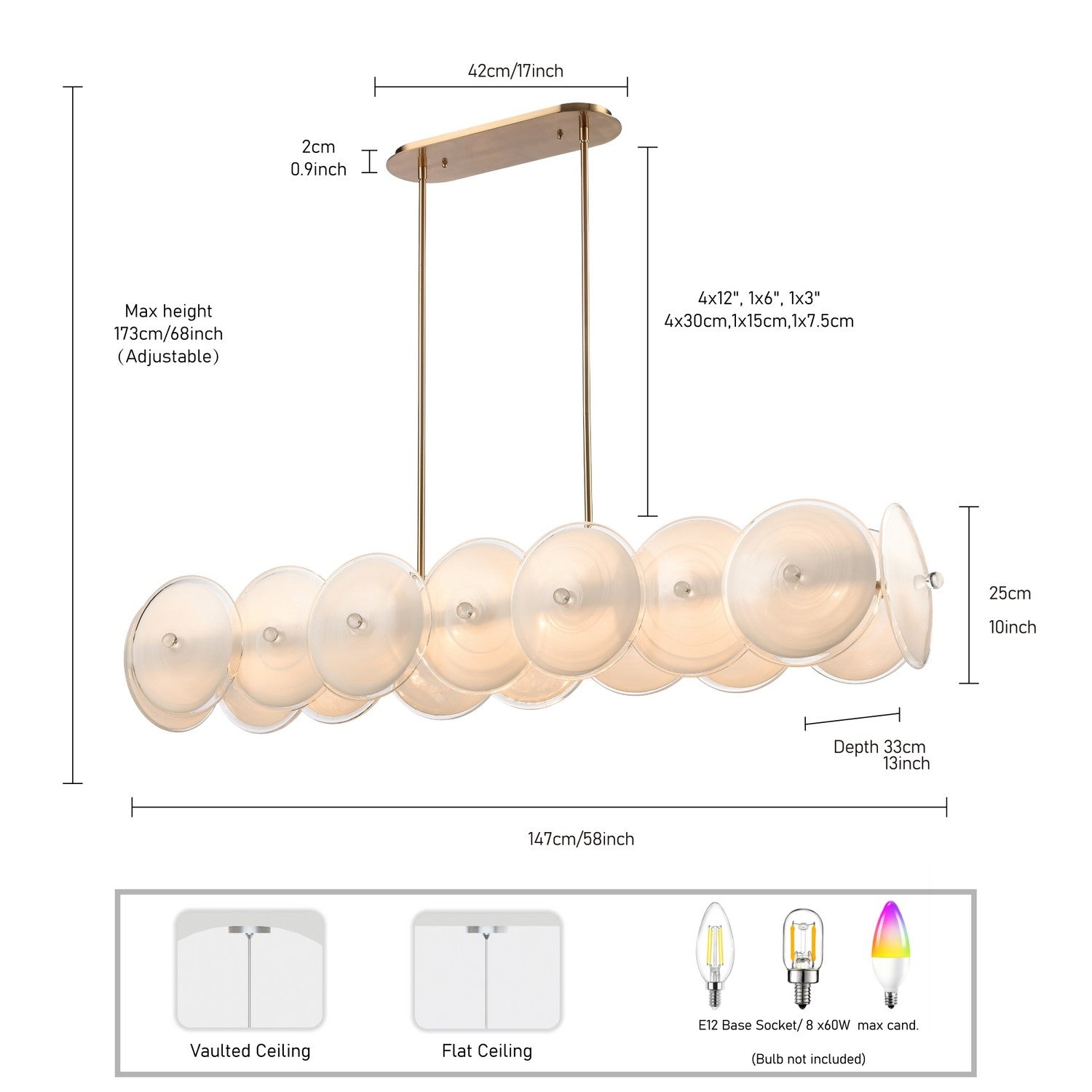 Bulbs: 8x B10 E12 60W, Dimmable