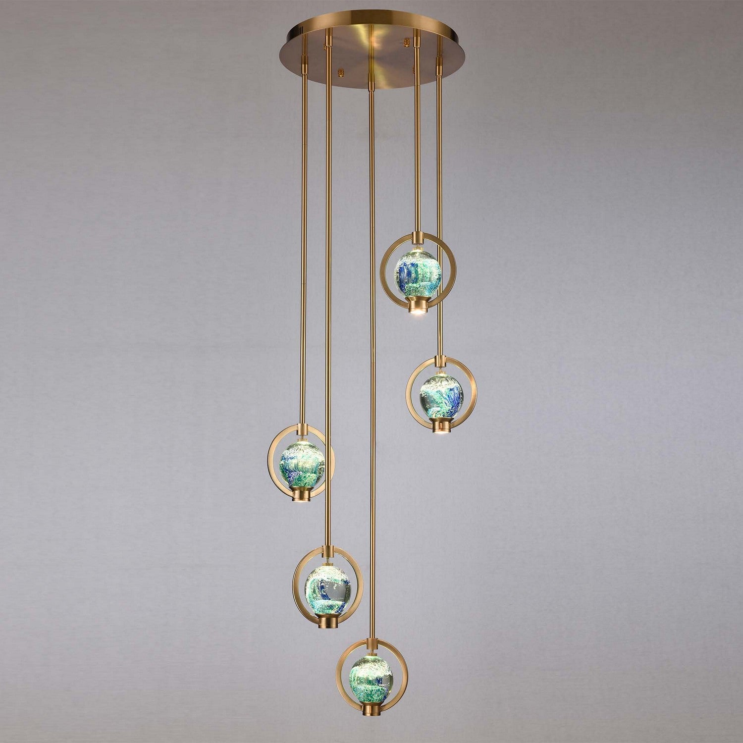 The Utopia Collection transforms modern lighting into a luminous work of art. At its center, a solid glass globe is encircled by a sleek ring finished in Lacquered Gold, creating a striking balance of sculptural beauty and architectural precision. The hand-crafted glass globe showcases swirling tones of oceanic blue, emerald green, and soft white, creating a marbled, dimensional effect reminiscent of a miniature abstract seascape. Each sphere is uniquely patterned, making every fixture one of a kind. Designed with dual LED technology, the uplight radiates into the glass sphere, illuminating its rich color and pattern like a curated modern art exhibit, while the downlight delivers focused task lighting below. This contemporary glass globe lighting blends statement design with everyday functionality. The threaded knob detail secures the glass in place while allowing for easy removal and cleaning which is thoughtfully engineered for both style and practicality. Perfect for dining rooms, kitchen islands, and refined living spaces, the Utopia Collection offers layered illumination and luxury modern lighting appeal. It's decorative lighting that feels intentional, artistic, and unforgettable.