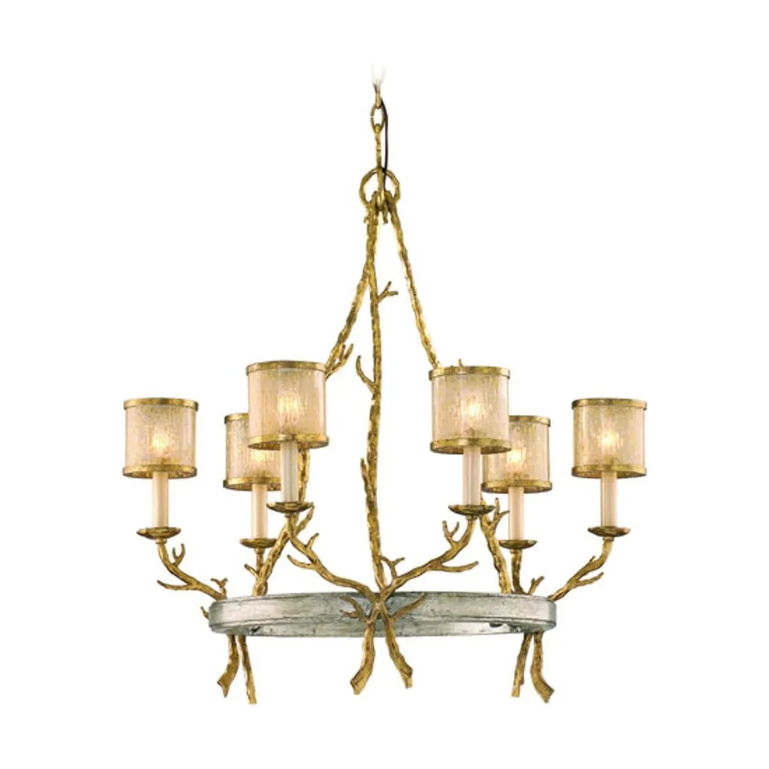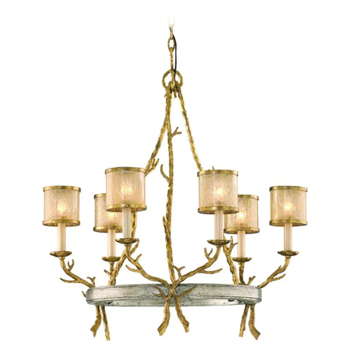 Parc Royale Chandelier by Corbett Lighting is a sculptural, nature‑inspired statement fixture that blends hand‑wrought iron craftsmanship with refined glass shades and a dual gold‑and‑silver leaf finish to create warm, layered ambient light. Its twig‑like arms and cylindrical golden‑ice shades give the piece an organic silhouette that anchors dining rooms, entryways, and curated hospitality interiors with quiet luxury.