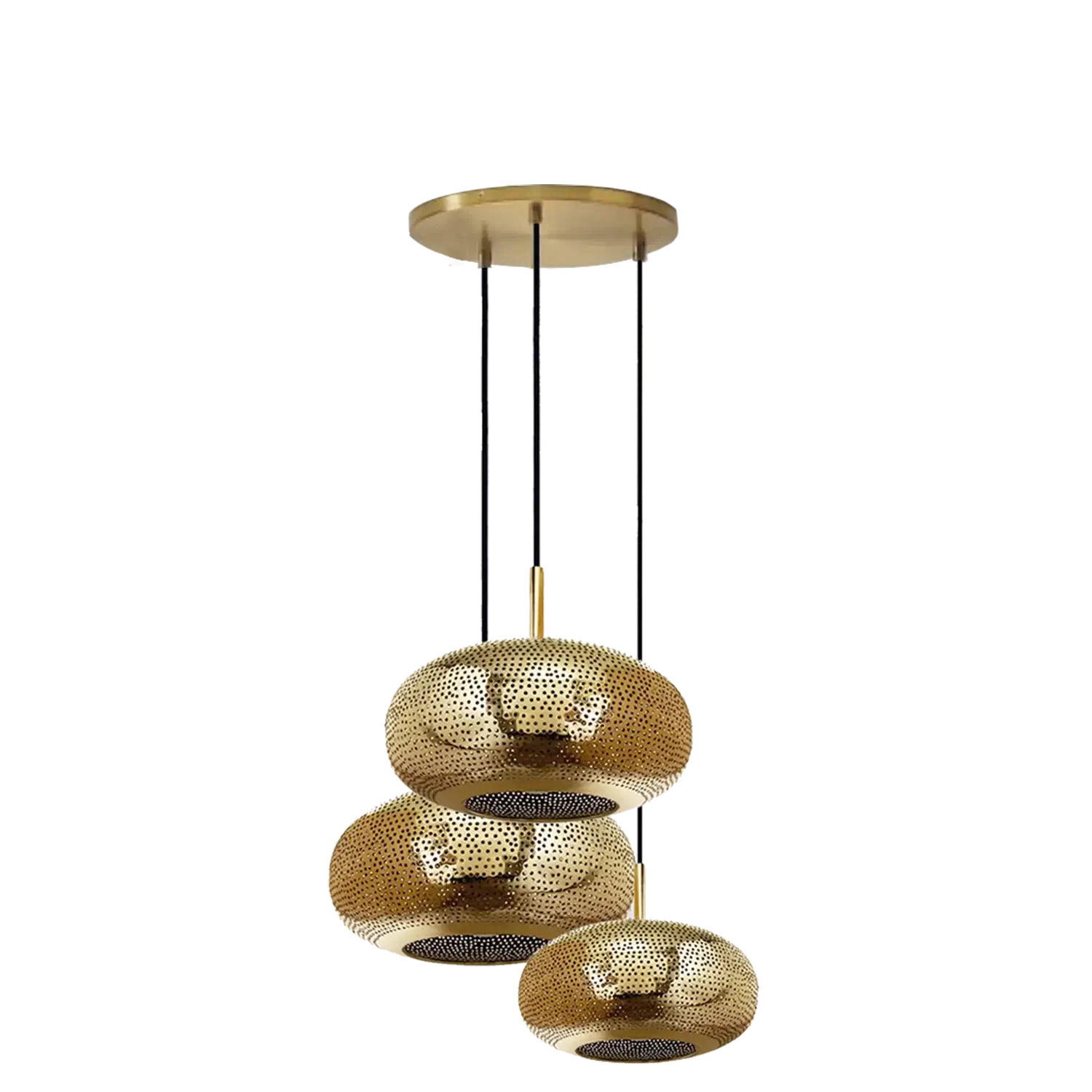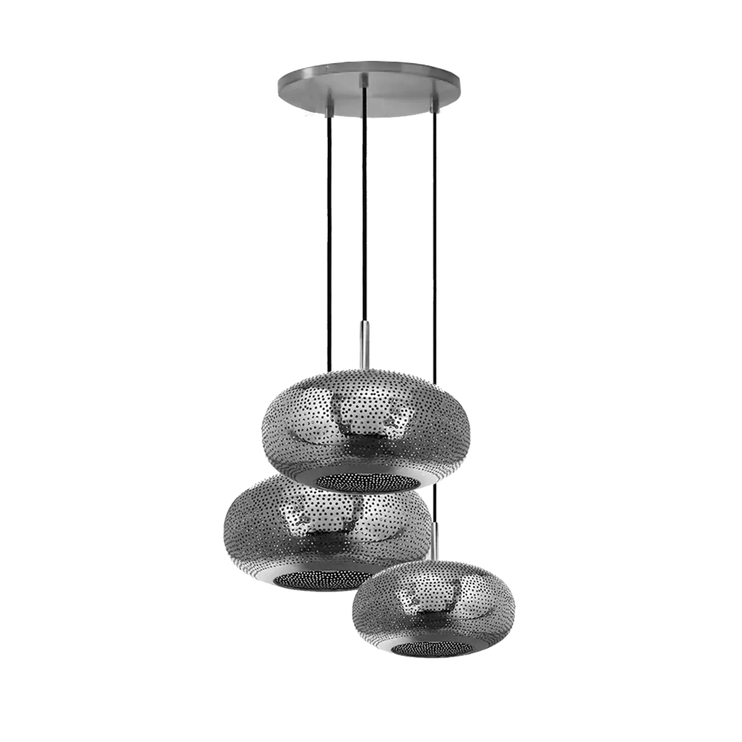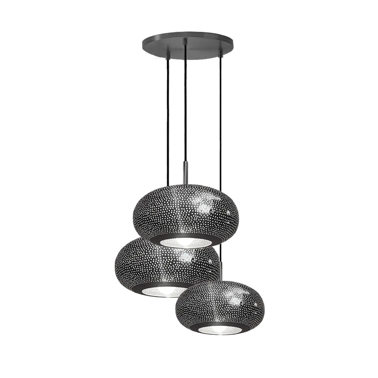 Lila chandelier is an oval-shaped set of 3 cluster light fixtures, with its simple sculptural shape and its pierced shades cast brilliant shadows onto the ceiling and onto the space around it while creating a focused light at the base. It provides an abundant, yet diffused light making it a perfect addition to dining and living spaces.