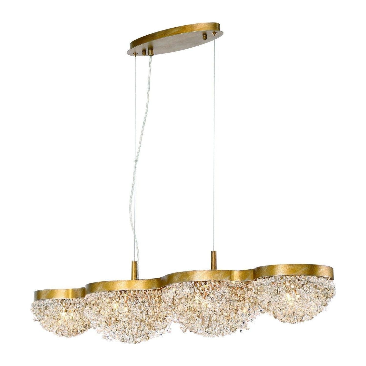 Mondo Chandelier by Eurofase is a sculptural linear statement designed to anchor long dining tables, entry halls, and hospitality spaces. An undulating antique-gold metal frame supports dense clusters of hand-set clear crystal droplets that refract warm, multidirectional light—creating depth and a refined focal plane for curated interiors.