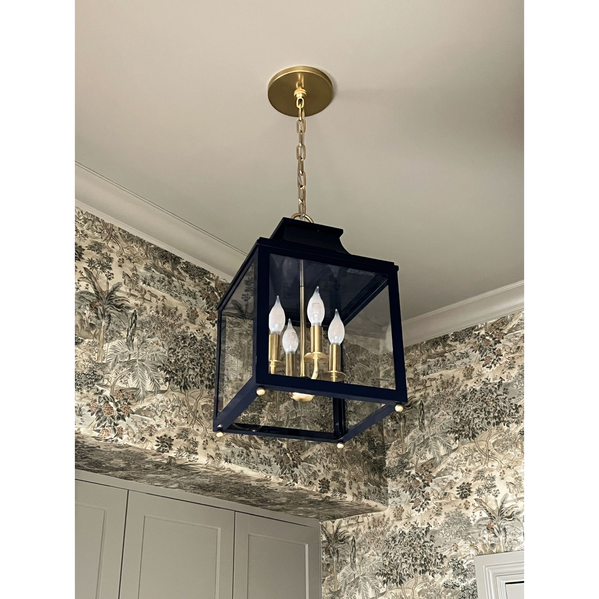 Crafted with clear glass panels and a four-light candelabra cluster, the Leigh Pendant delivers layered, ambient illumination ideal for entryways, dining zones, or layered over islands. Visible details—polished ball feet, a slender suspension chain, and crisp metal framing—speak to meticulous craftsmanship and material quality.