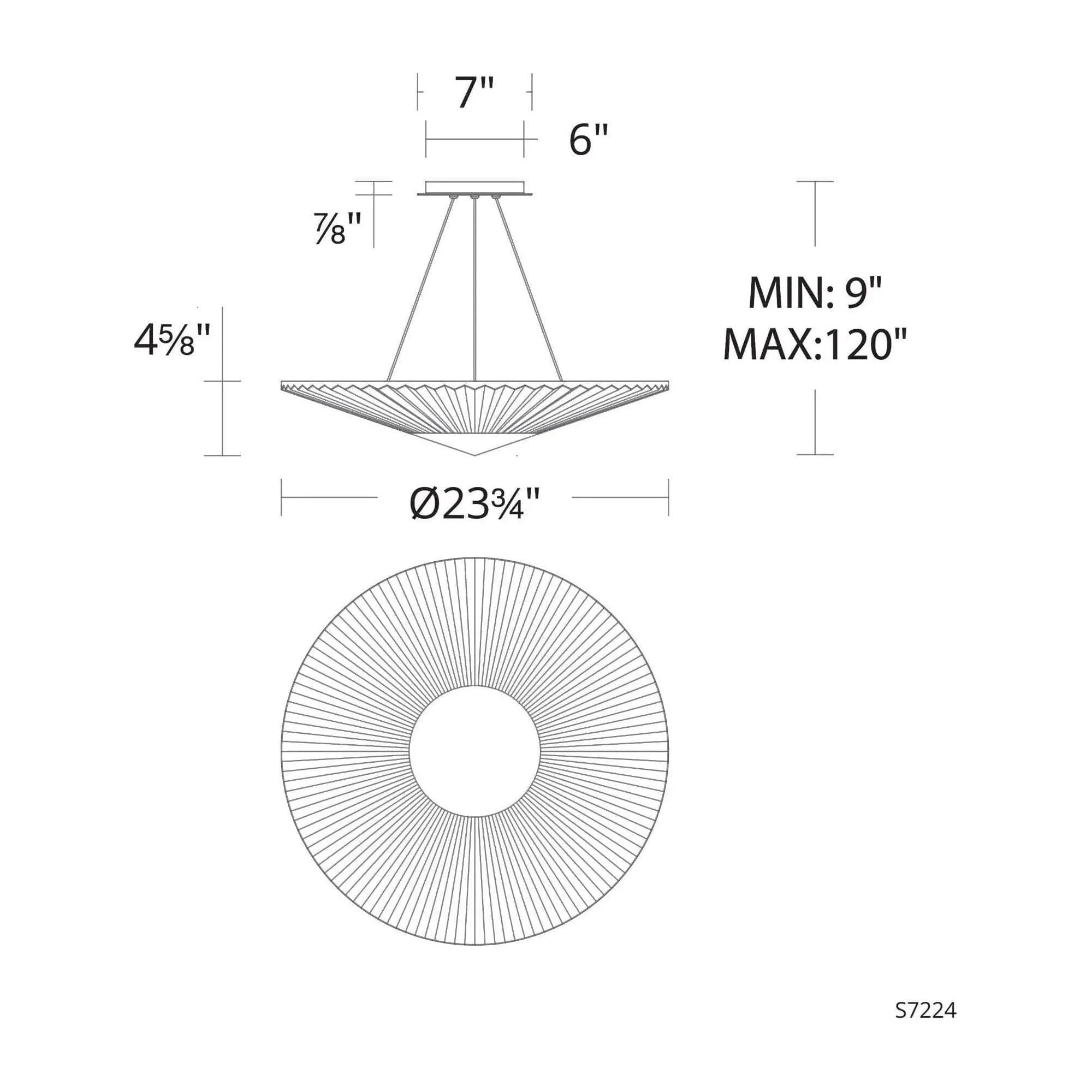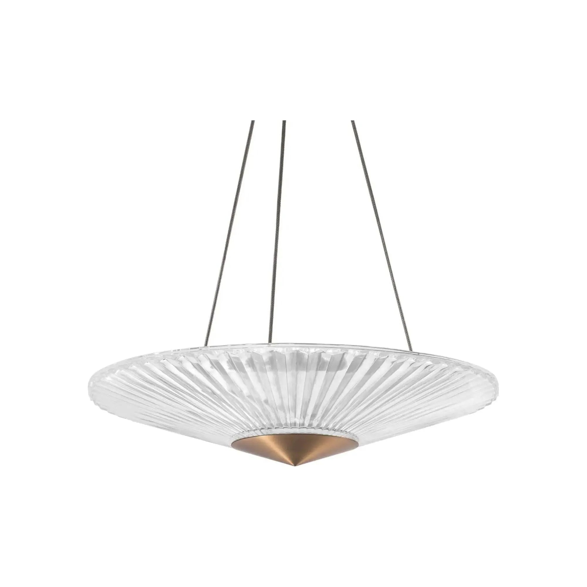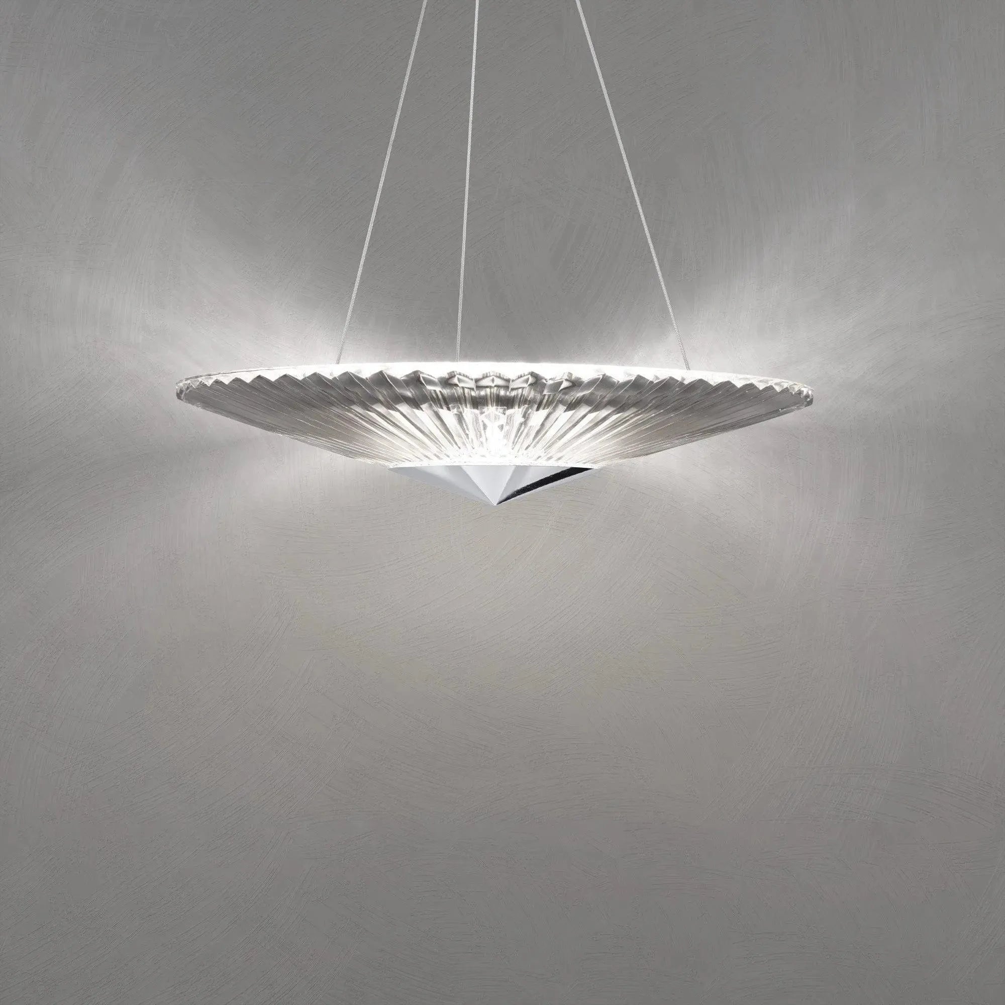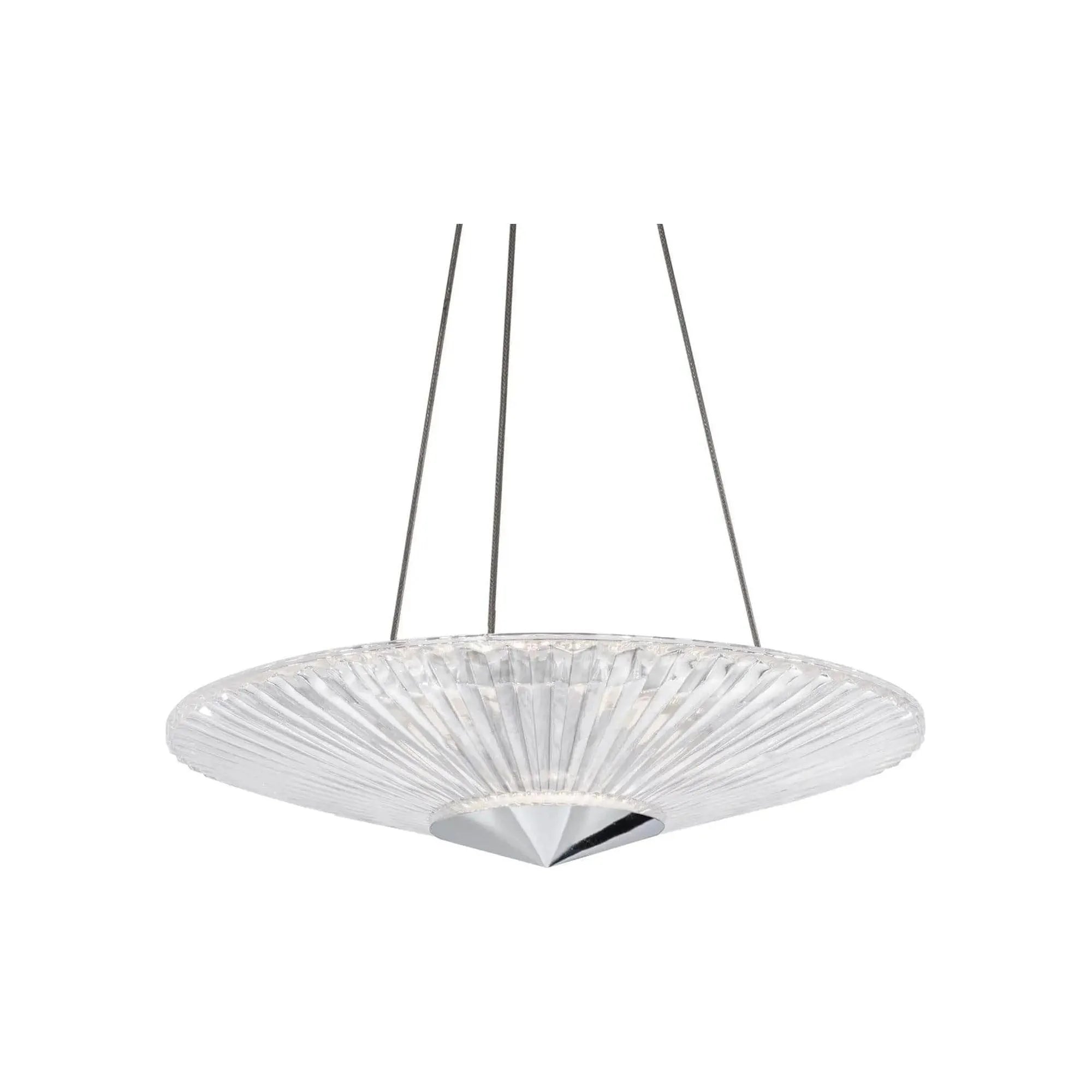 Calming and prescient, Origami proffers a simple elegance. Folds in the patterned Schonbek handcut crystal glass shade illuminate as prisms to bend light. Integral LEDs discreetly offer generous indirect illumination from behind a reflector plate finished in luxurious Aged Brass or Chrome.
