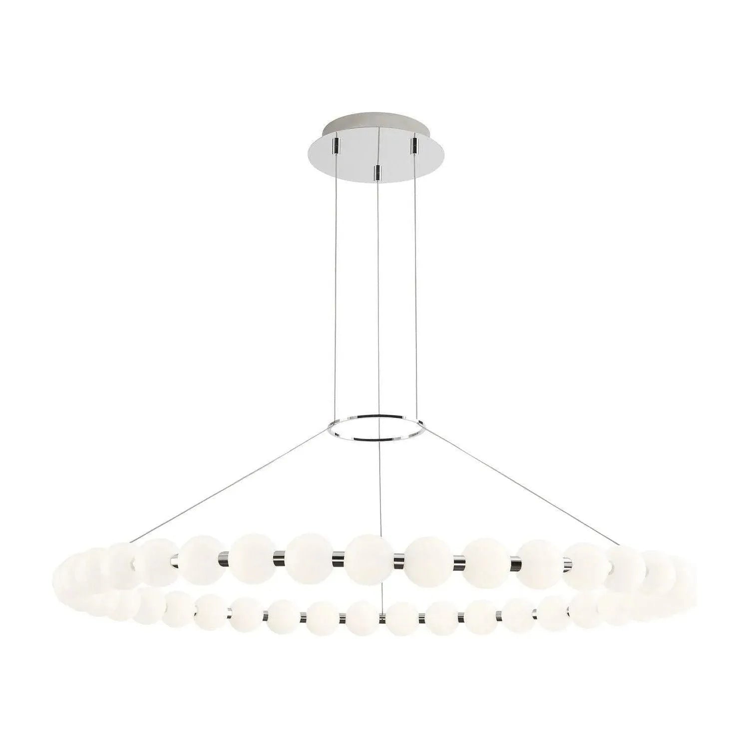 The Orbet 42 Chandelier by Sean Lavin is a modern upgrade to the classic ring design. Milk-glass orbs provide a soft diffused aesthetic for the integrated LEDs and are accented with metal spacers for a touch of contrast. This fixture is the perfect design for dining room, foyers, hospitality and more.