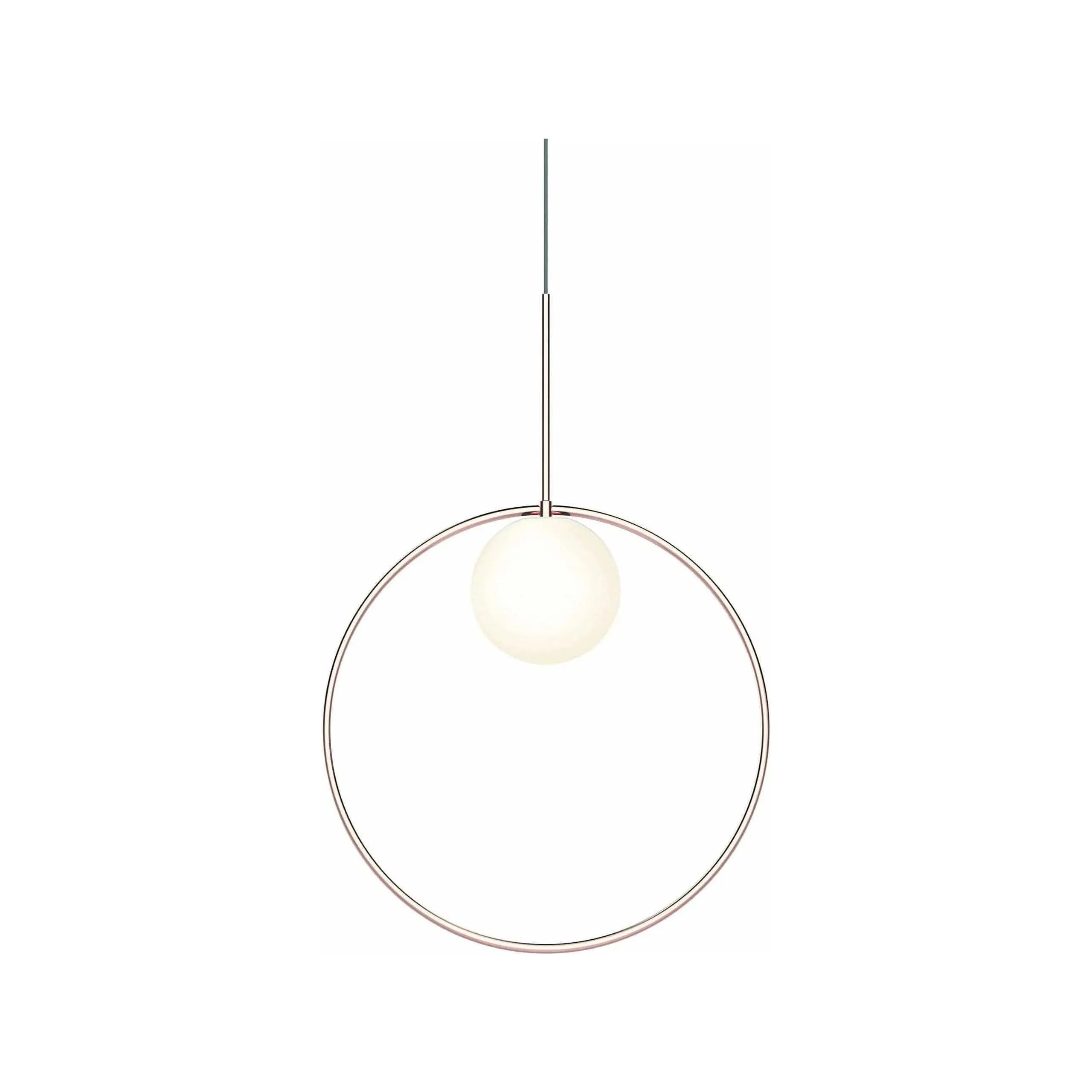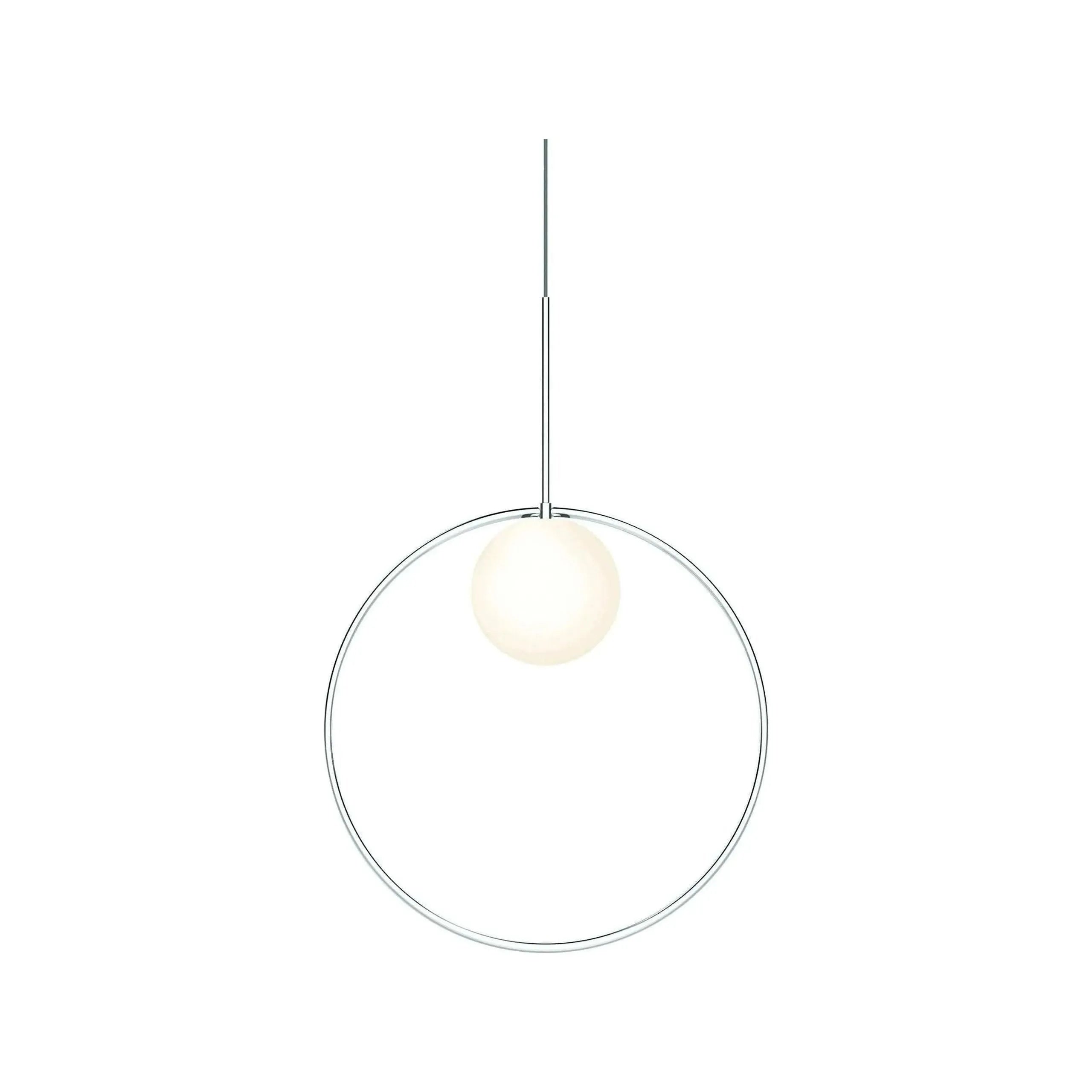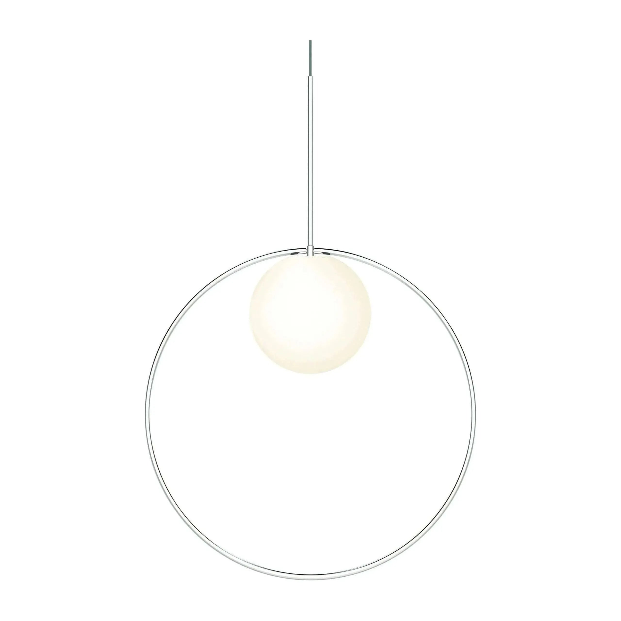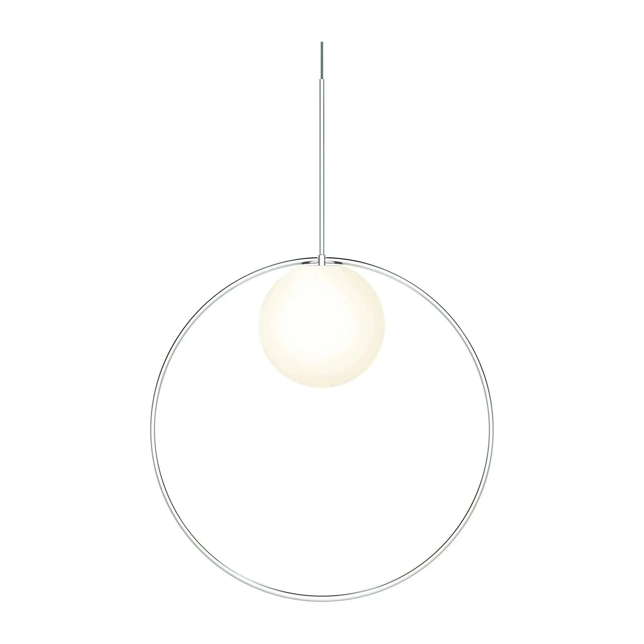 Precision-driven form meets luminous simplicity. The Bola Halo Pendant from Pablo Designs frames a single opaline globe within a slender metal halo, creating a balanced sculptural presence that reads equally well in residential and commercial projects.