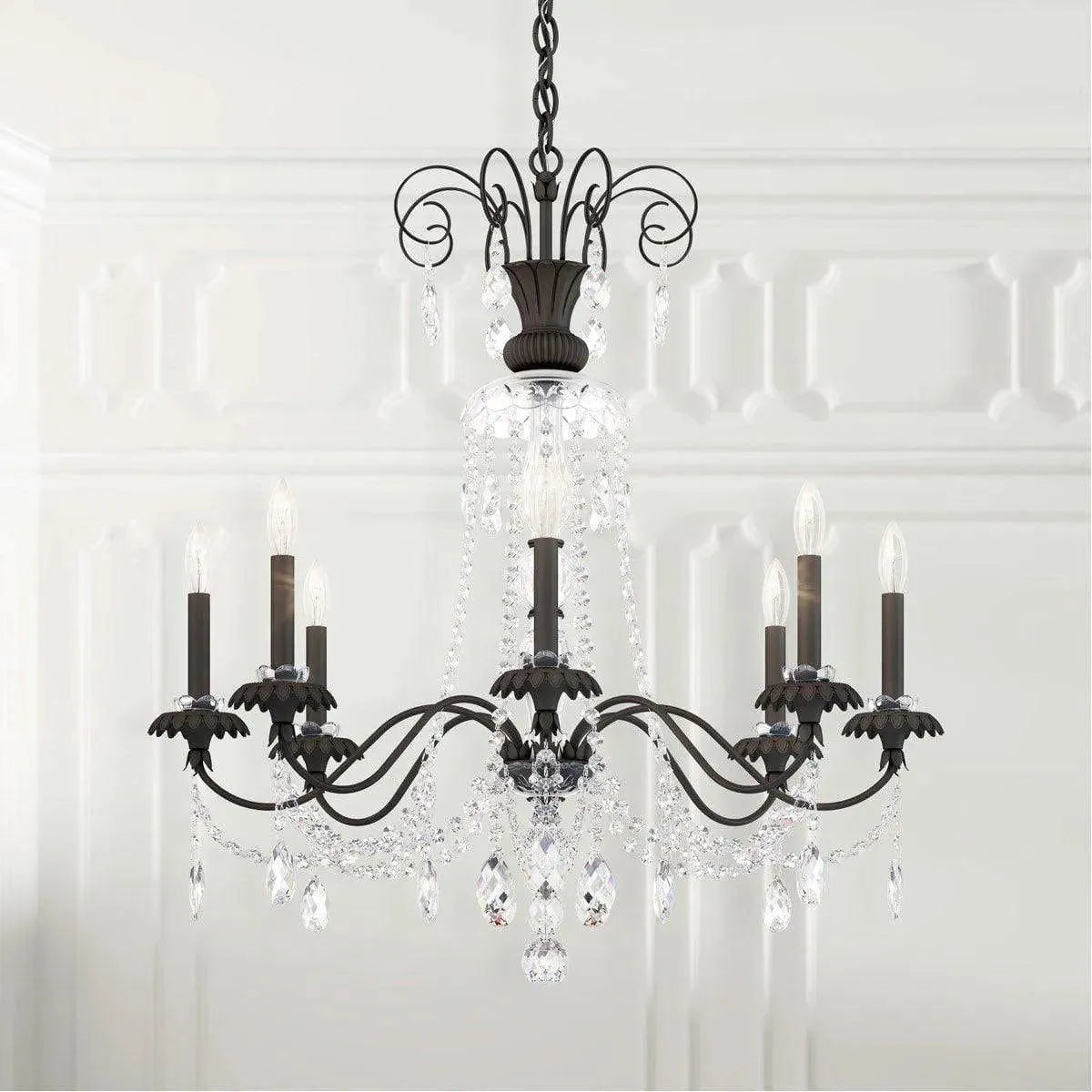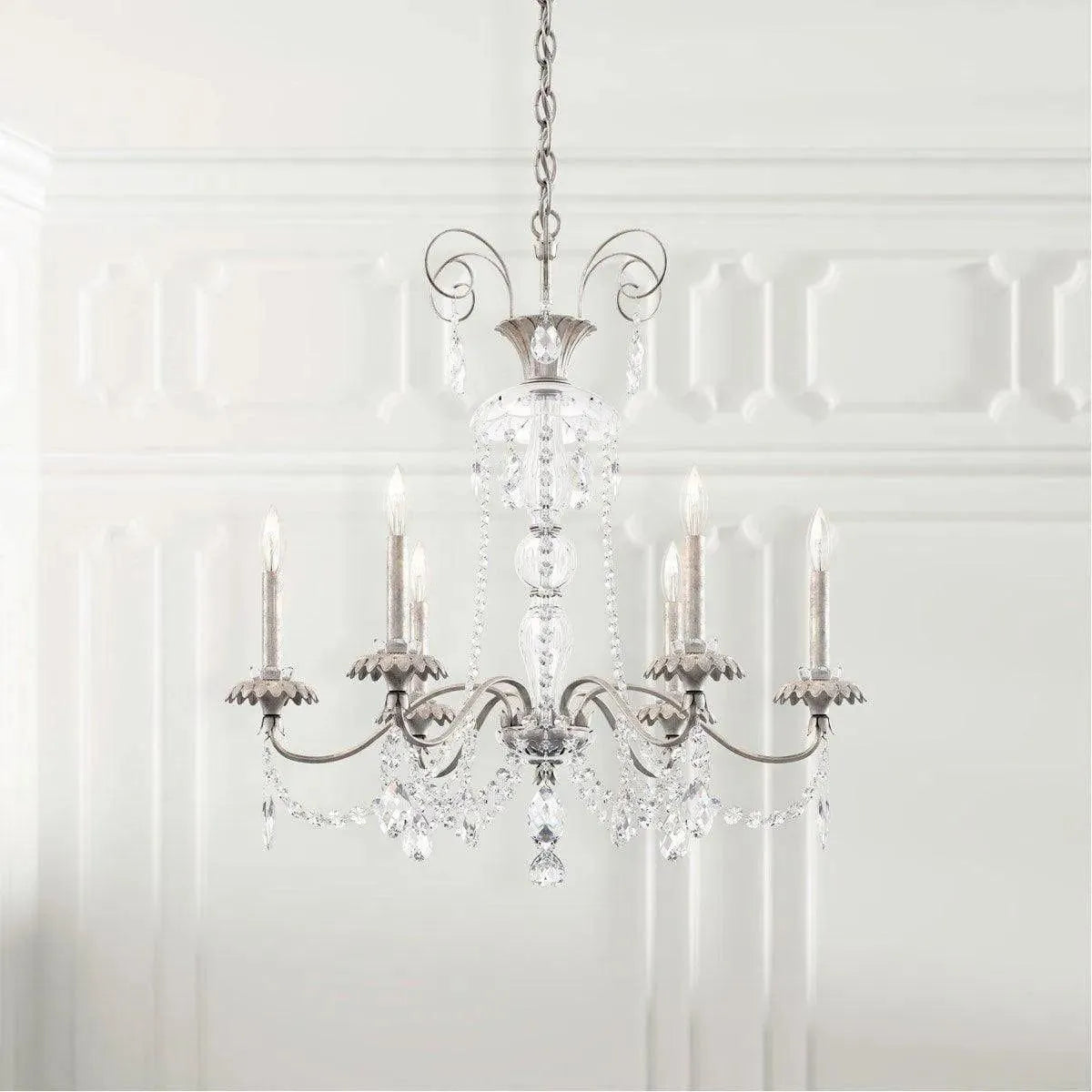 Helenia Chandelier by Schonbek 1870 marries refined crystal artistry with a sculptural metal armature to create a defining focal point for elevated interiors. Its balanced silhouette—six candle-style lights on gracefully curved arms—pairs hand-cut crystal drops and draped chains for controlled sparkle and layered reflection.