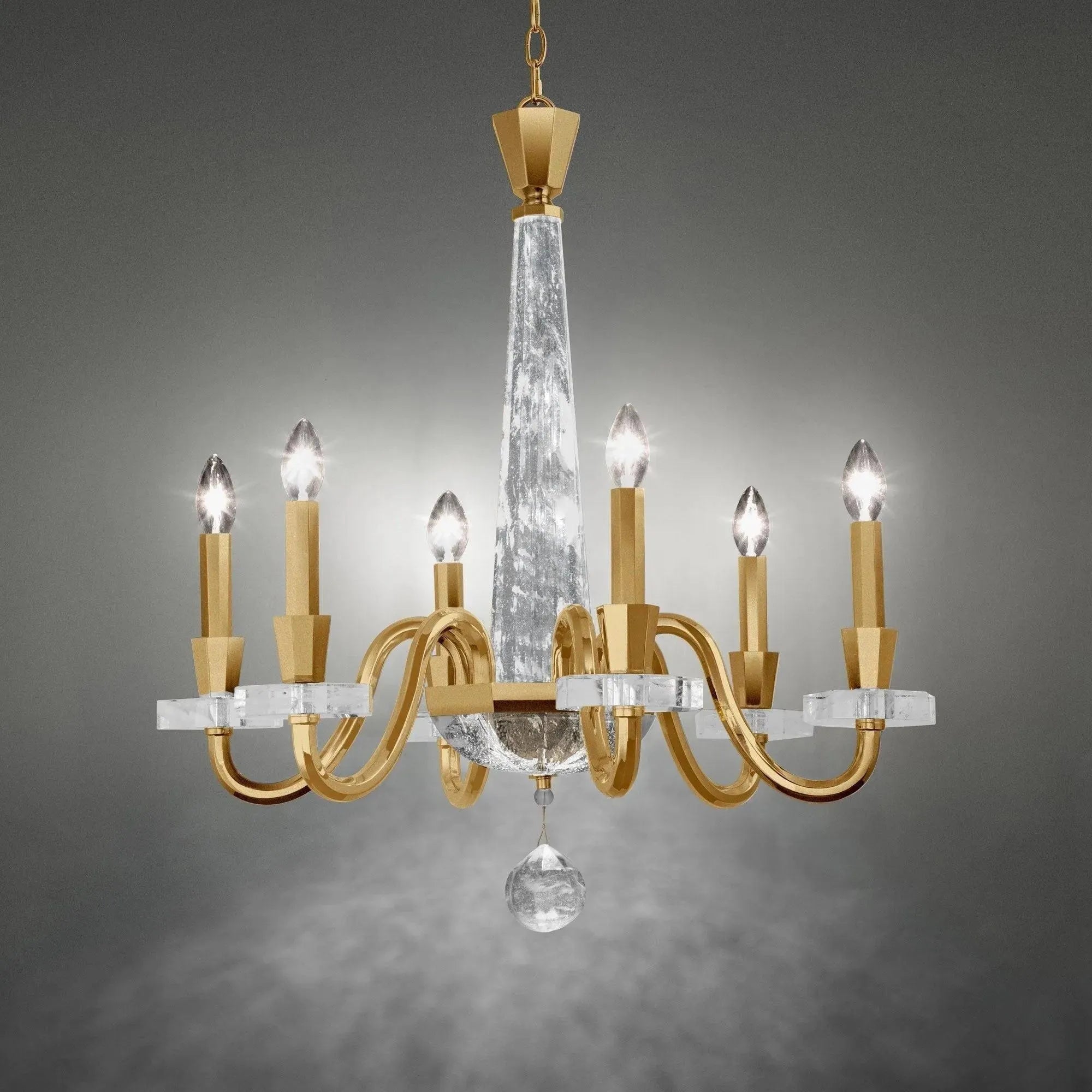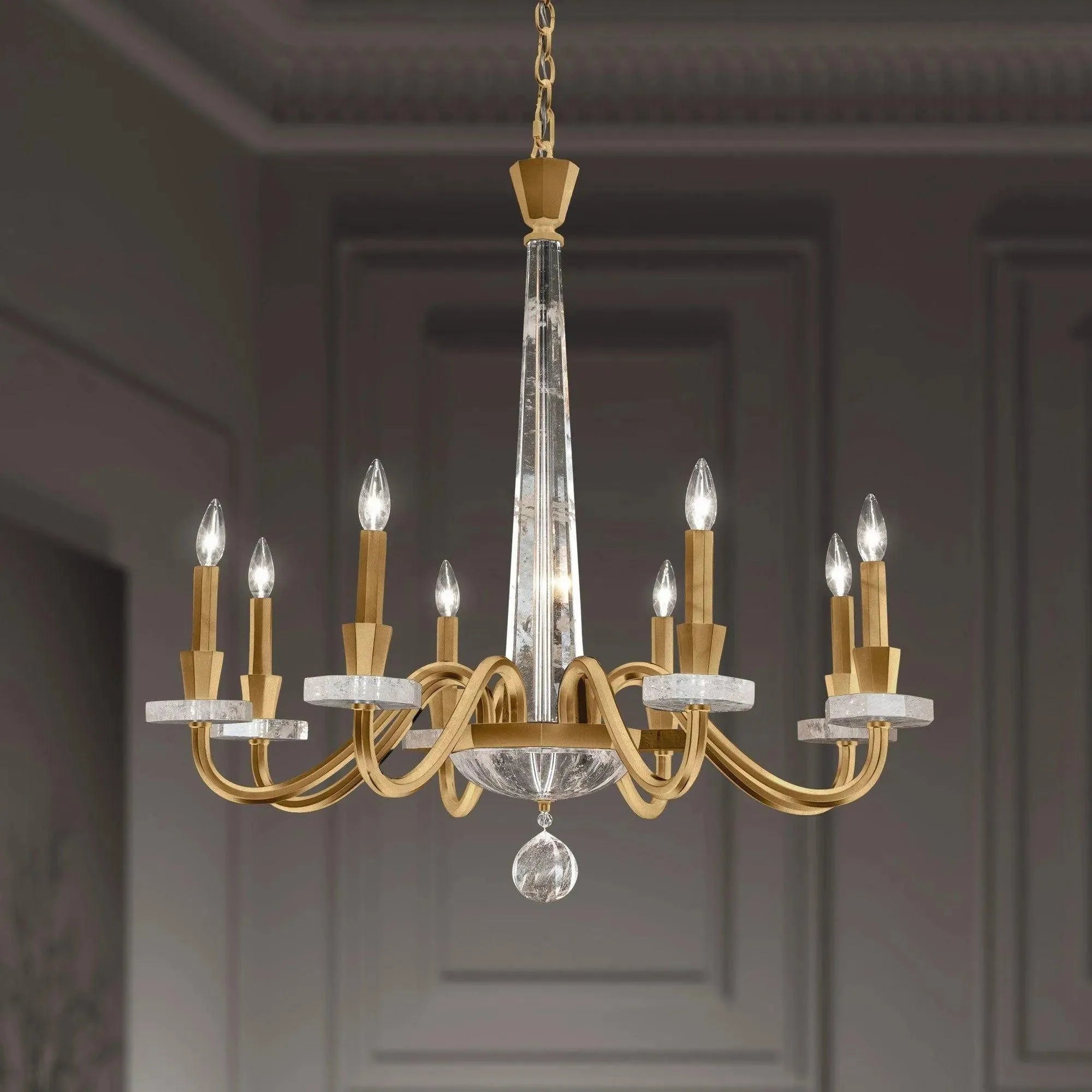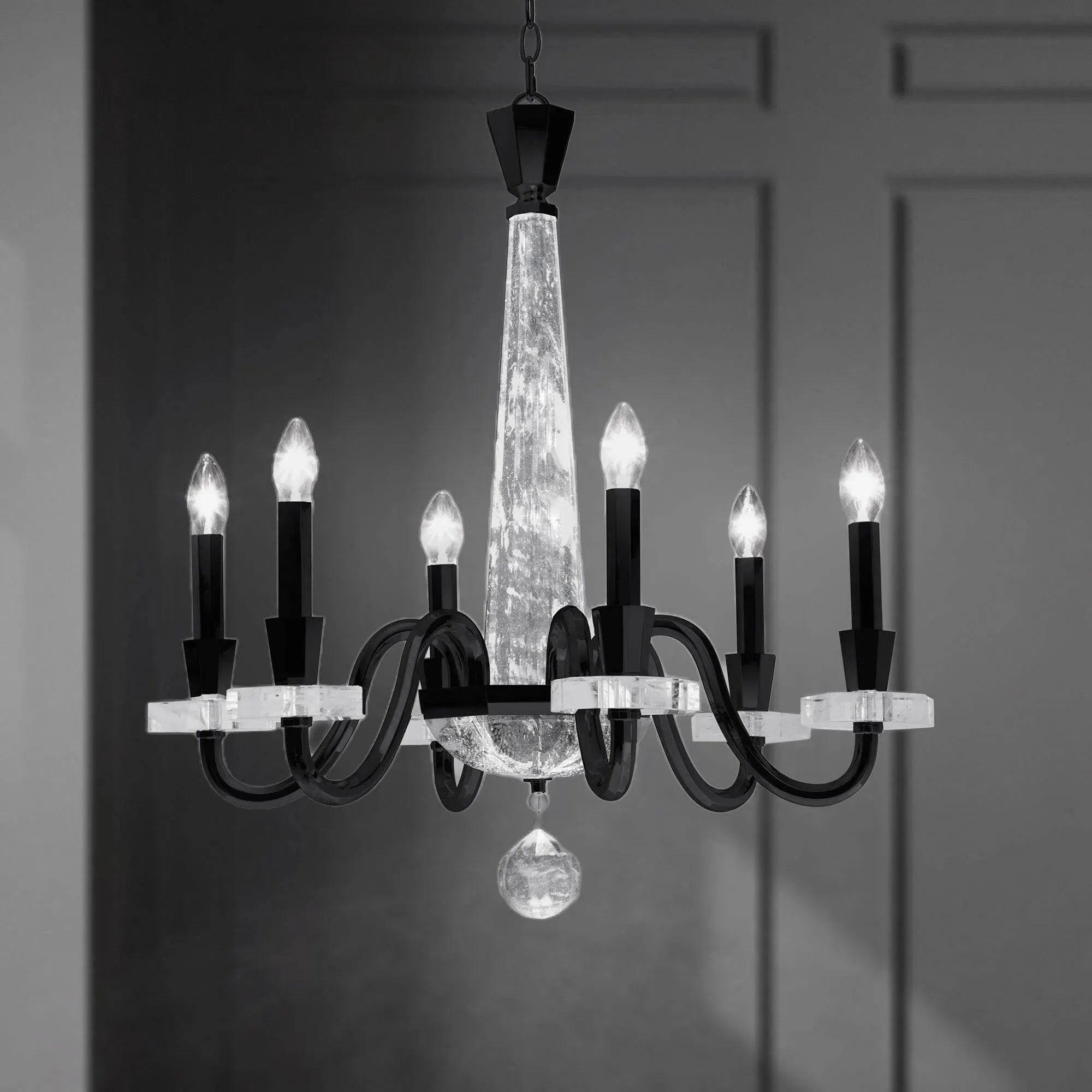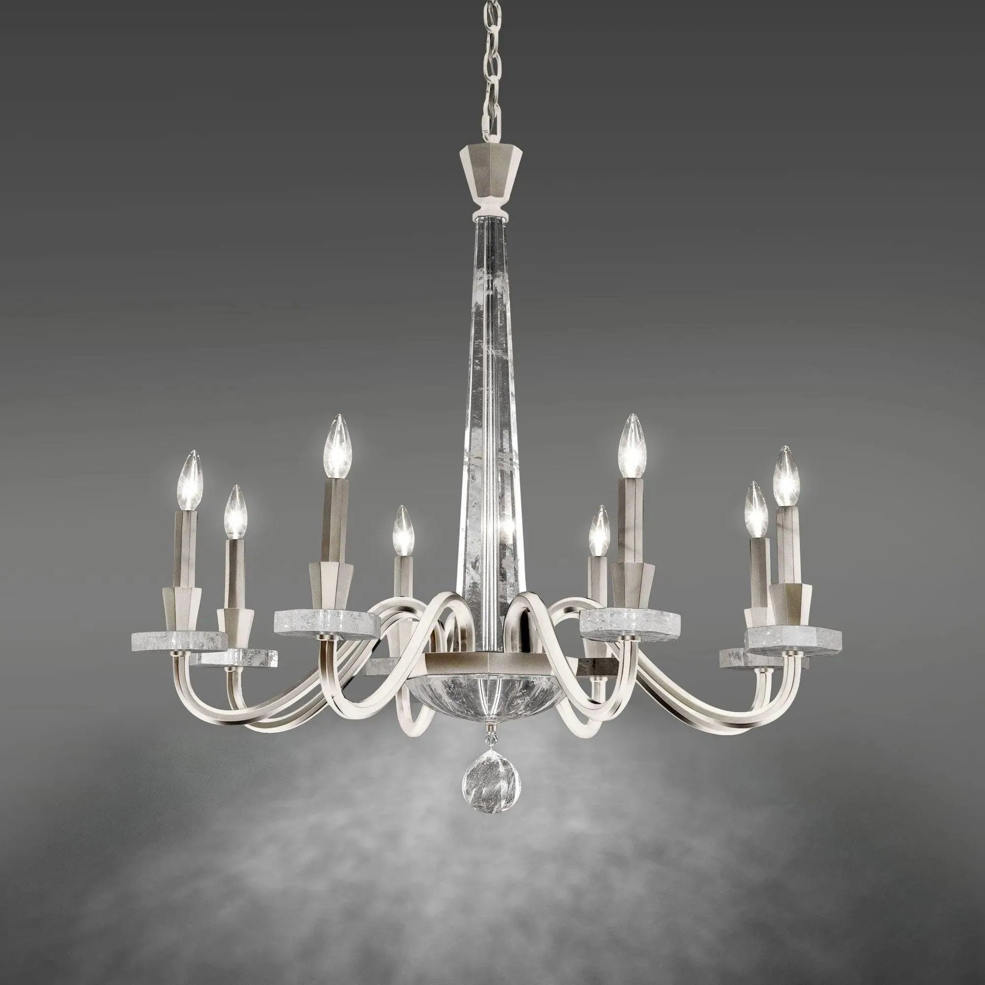 A luxurious symphony of graceful curves with faux candle lights enhanced by a mesmerizing optic haze crystal center and matching orb finial. The stunning chandelier harmonizes in a refined creation and classical elegance. Three exquisite finishes available.