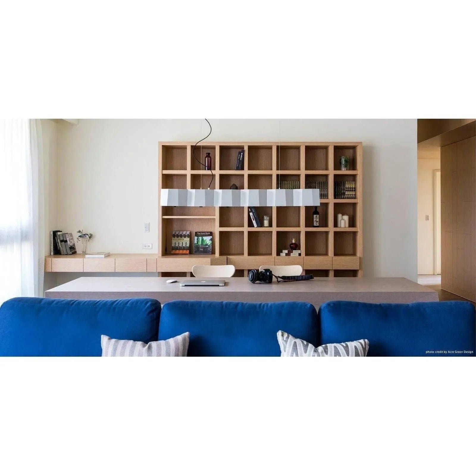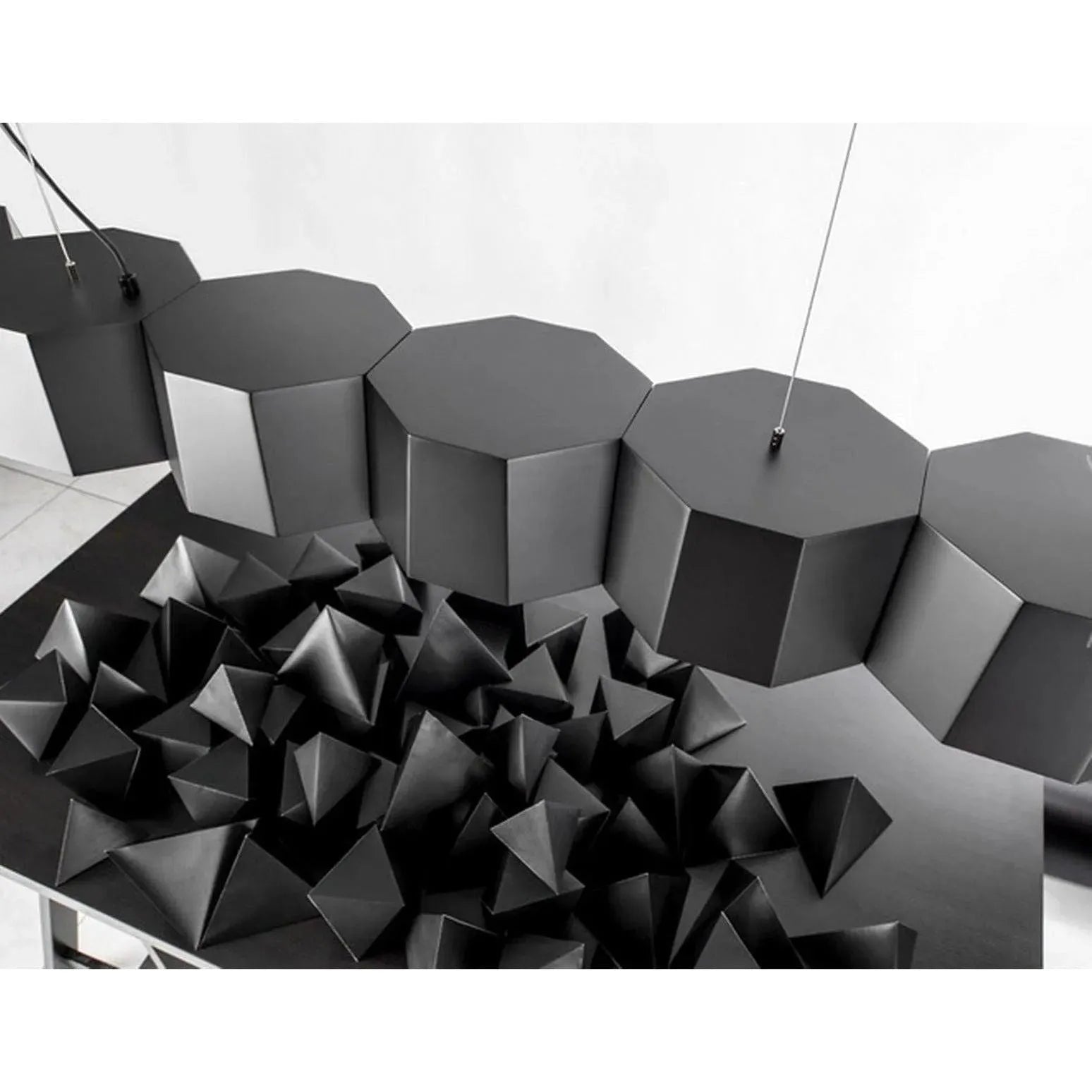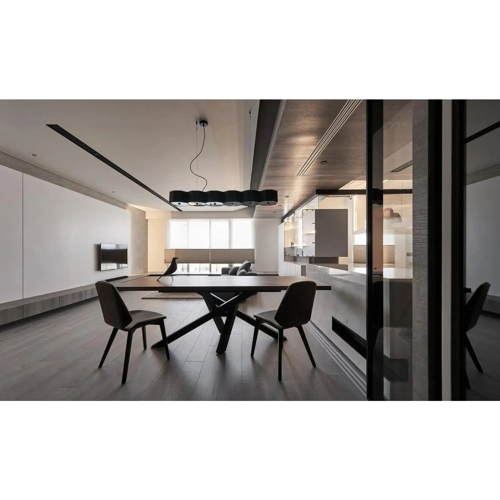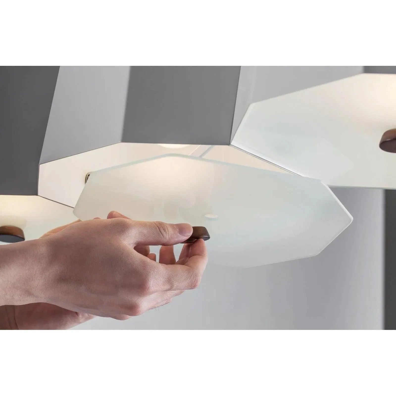 ZHE is inspired by a wood from the Orient that is as hard as rock. The metal lampshade is meticulously and painlessly hand welded to resemble a cluster of rocks together. The wooden stoppers under each frosted diffuser not only introduce the warm elements of wood, but functionally it softens up the overall light source. ZHE exemplifies illumination on a grand scale.