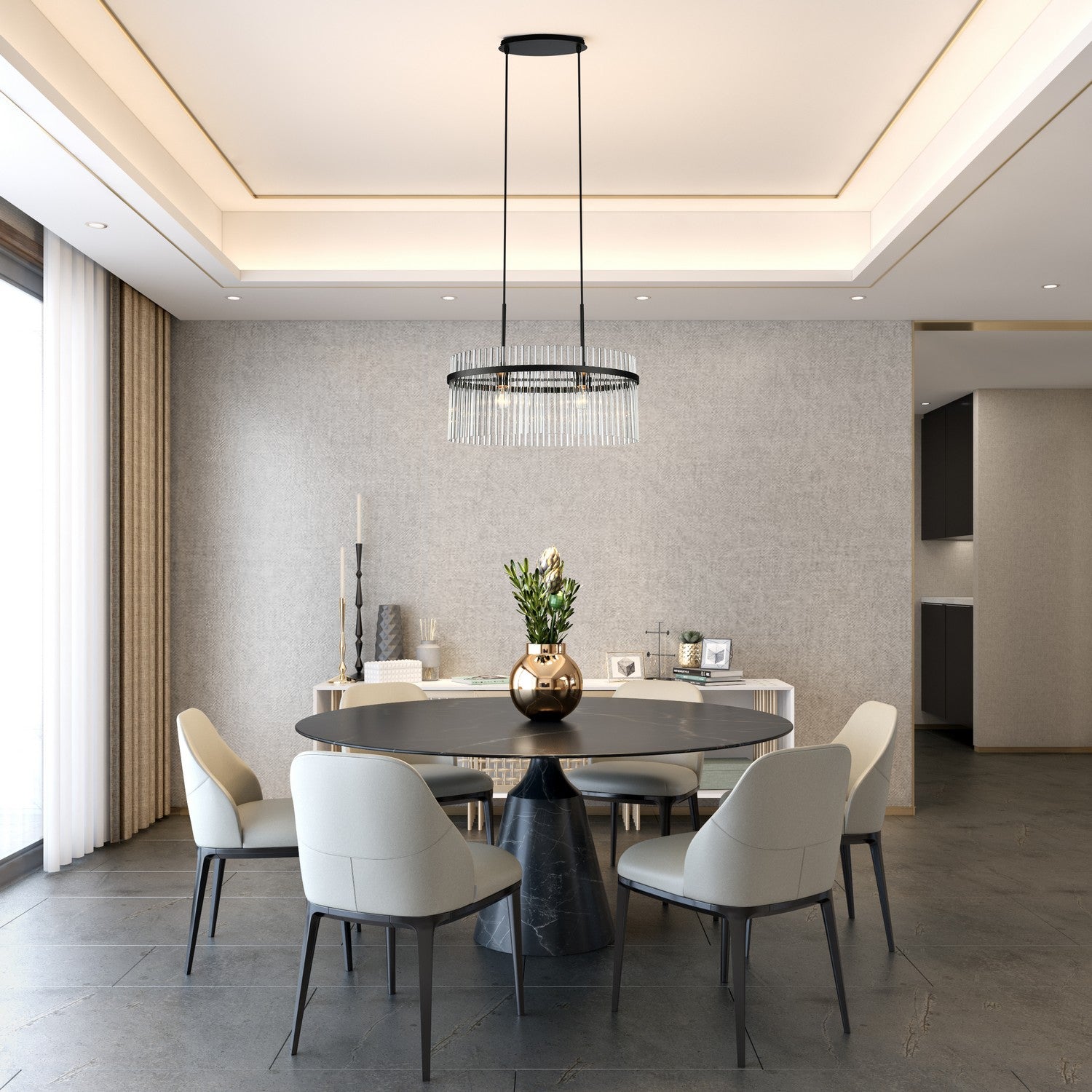 The Ava Collection oval chandelier enchants with its delicate arrangement of circular glass rods, elegantly suspended on a sleek black frame. Its versatile design harmonizes beautifully with both circular and rectangular tables, adding a touch of refined glamour to any room. (This model is easily height adjustable to meet you preference)