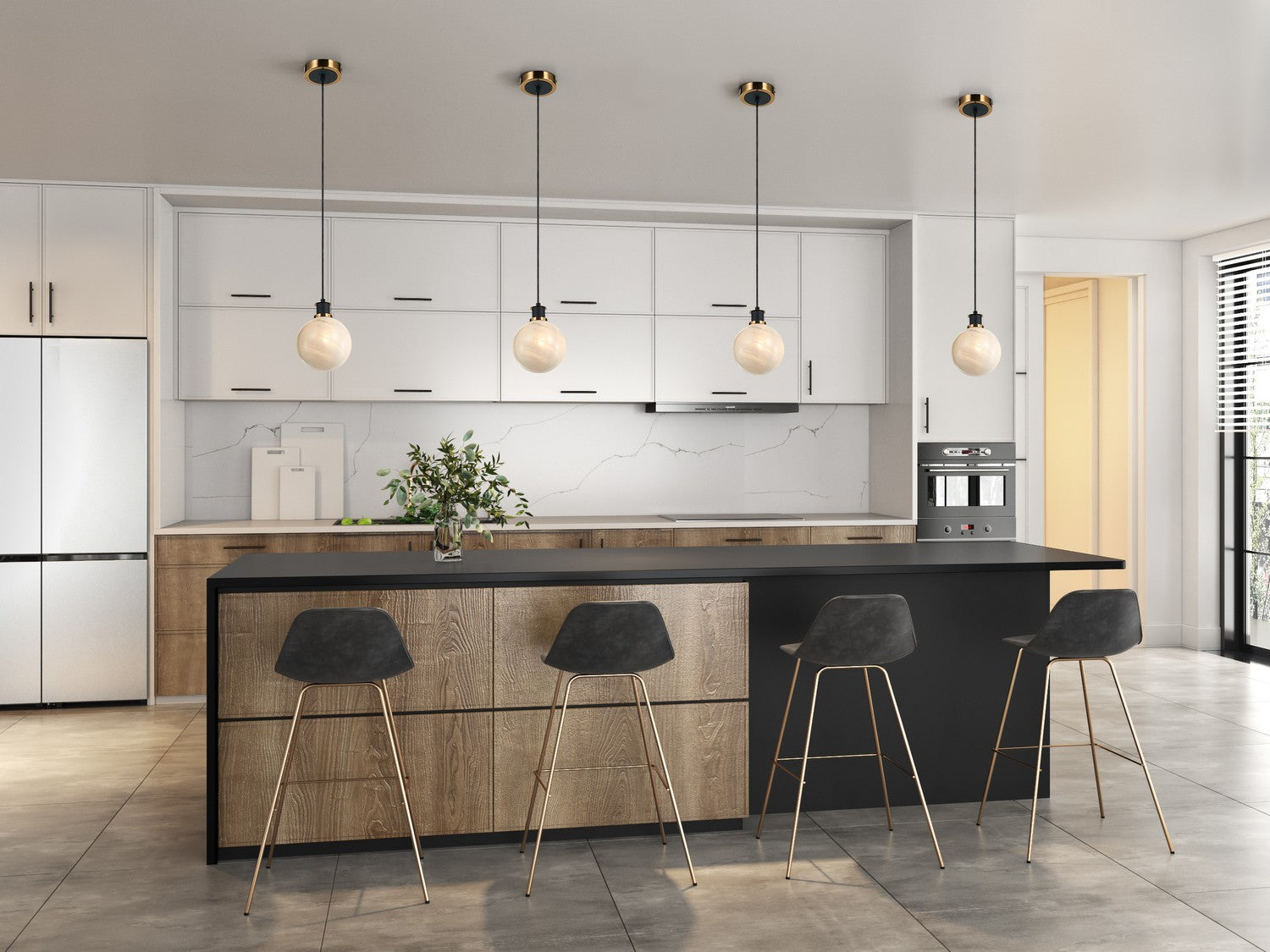 The Gem collection with "Blizzard" glassware exudes a sense of sophistication. Featuring a glossy textured white, the glass glows giving it a timeless and contemporary feel. The combination of the black framing with brushed brass is simply exquisite. Single pendant model shown.