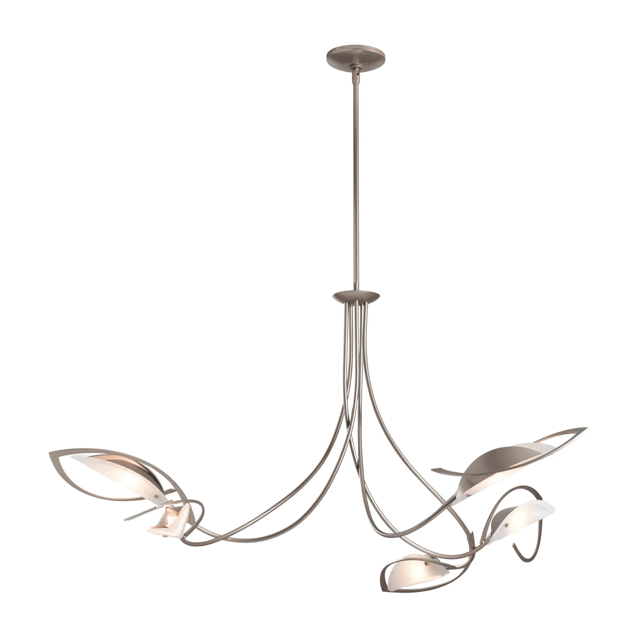The large-scale Aerial Pendant strikes an artistic balance of materials. Leaf-like steel forms are complimented by art glass—created through heating and draping over contoured forms. Asymmetrical and organic design lends itself to the botanical feel of the fixture.