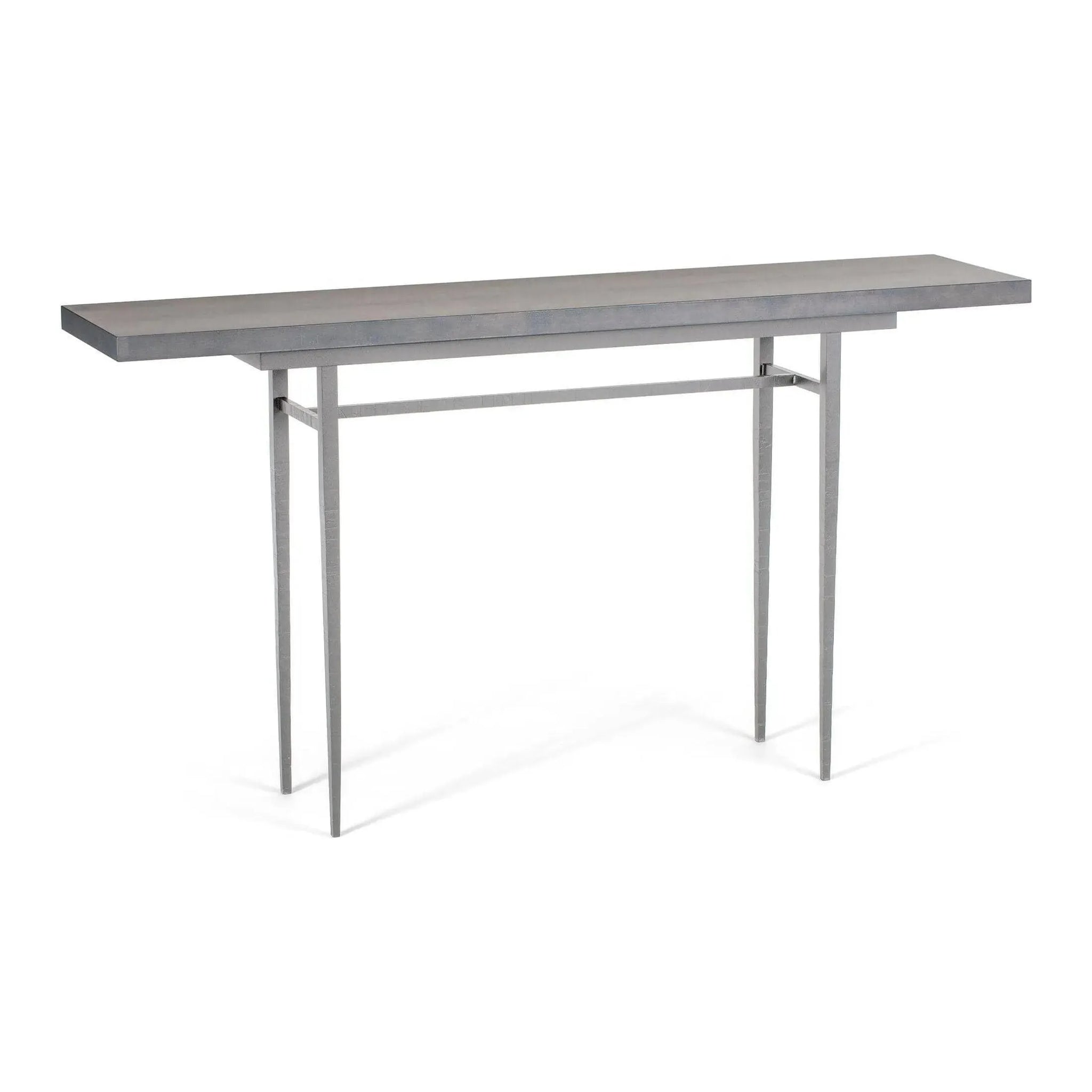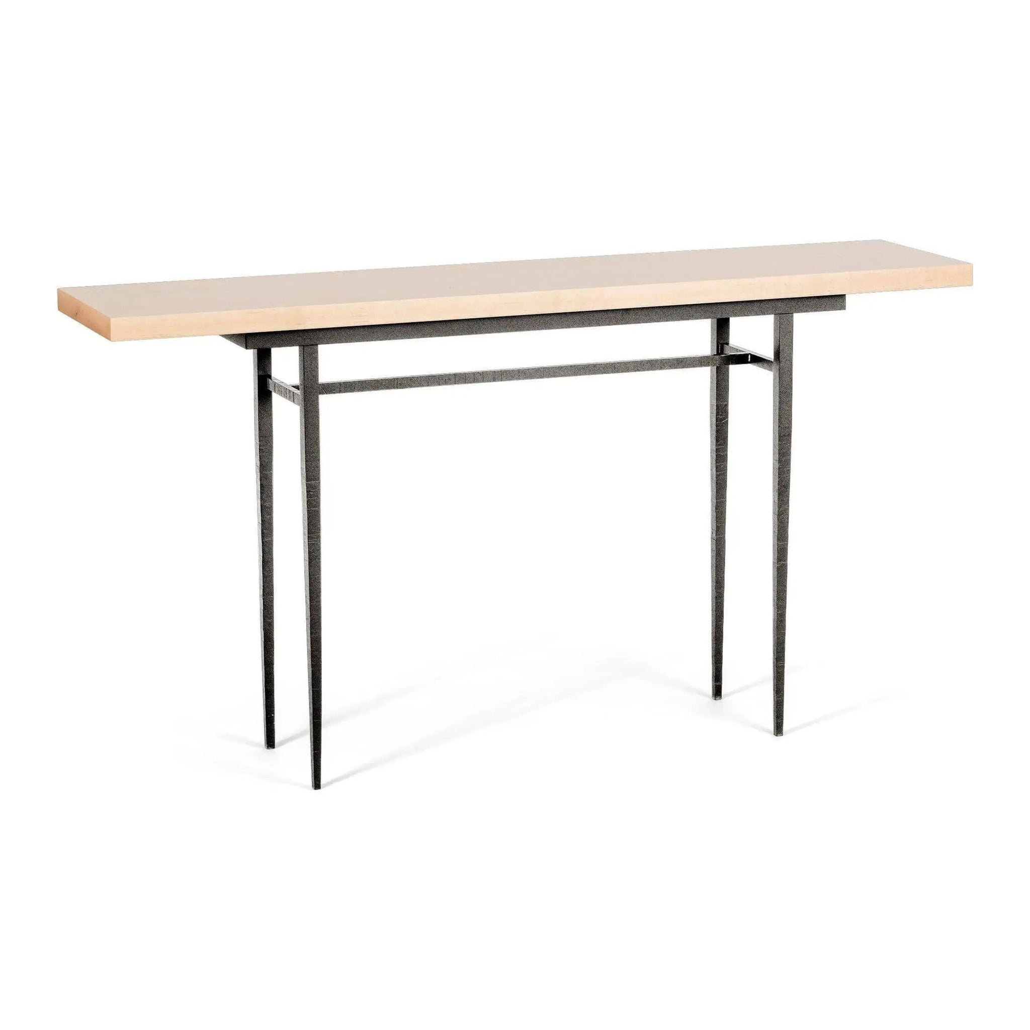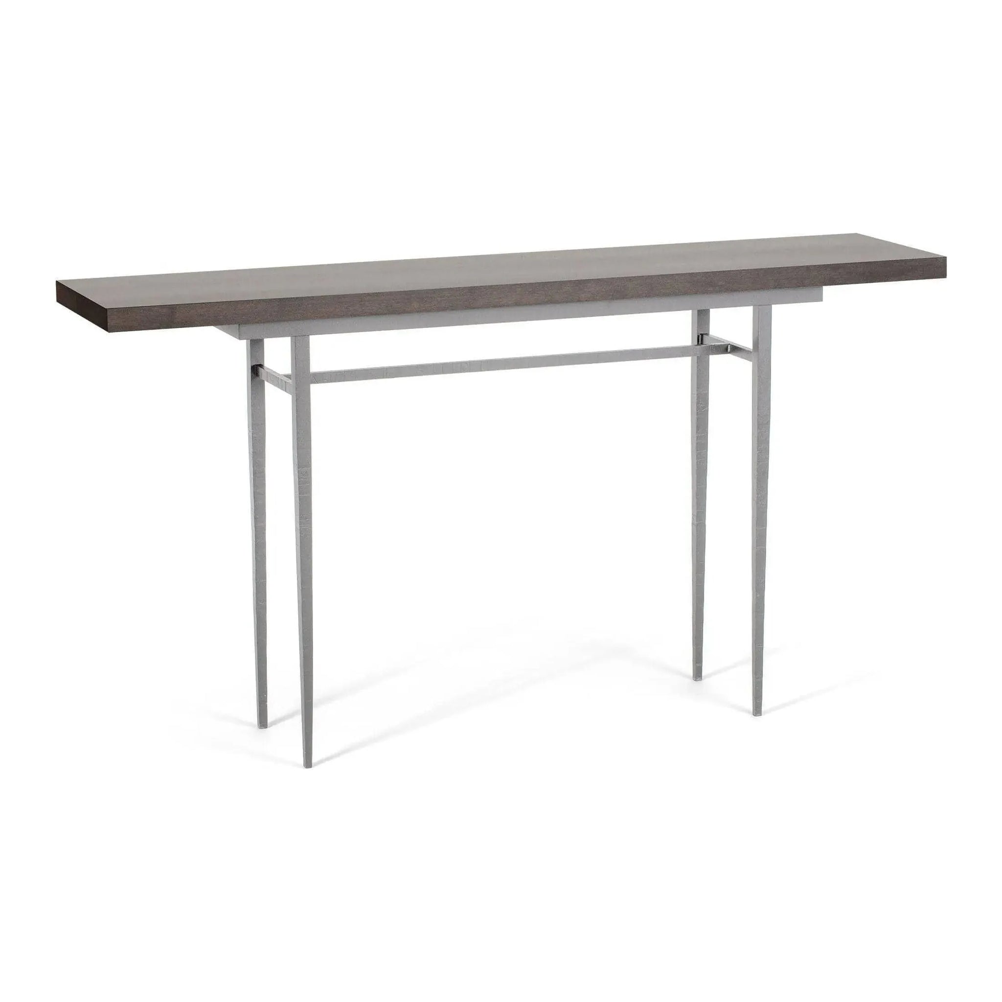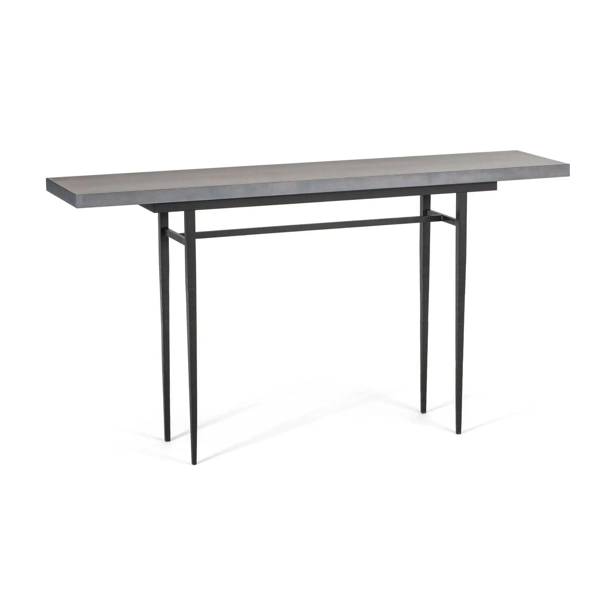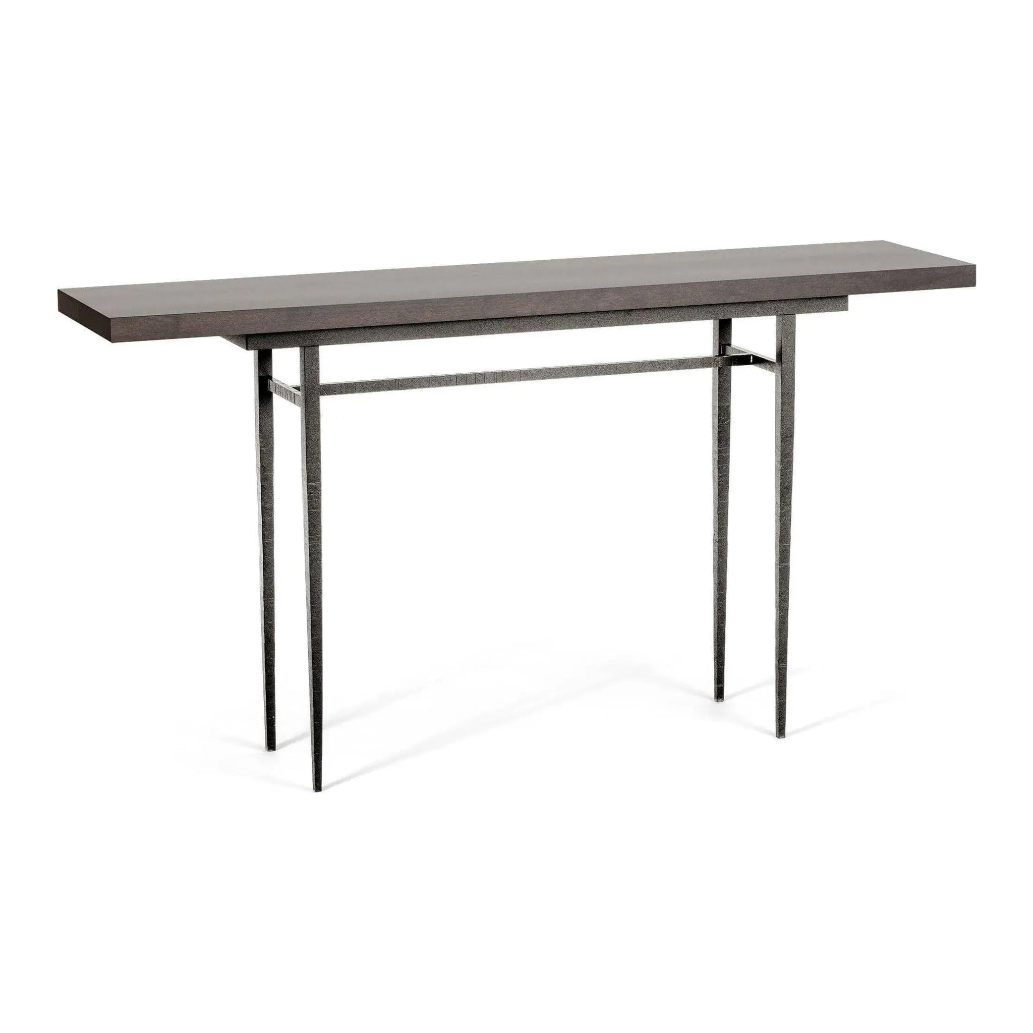 The long, elegant tapered legs and 1.5" thick, solid wood top define the Wick Collection of tables. The large 60" Wick Console Table features forged, hand-hammered, solid steel legs. Its solid maple wood top, offered in a choice of Clear, Grey or Espresso finishes, extends beyond the table's metal footprint to a full 5' usable surface length.