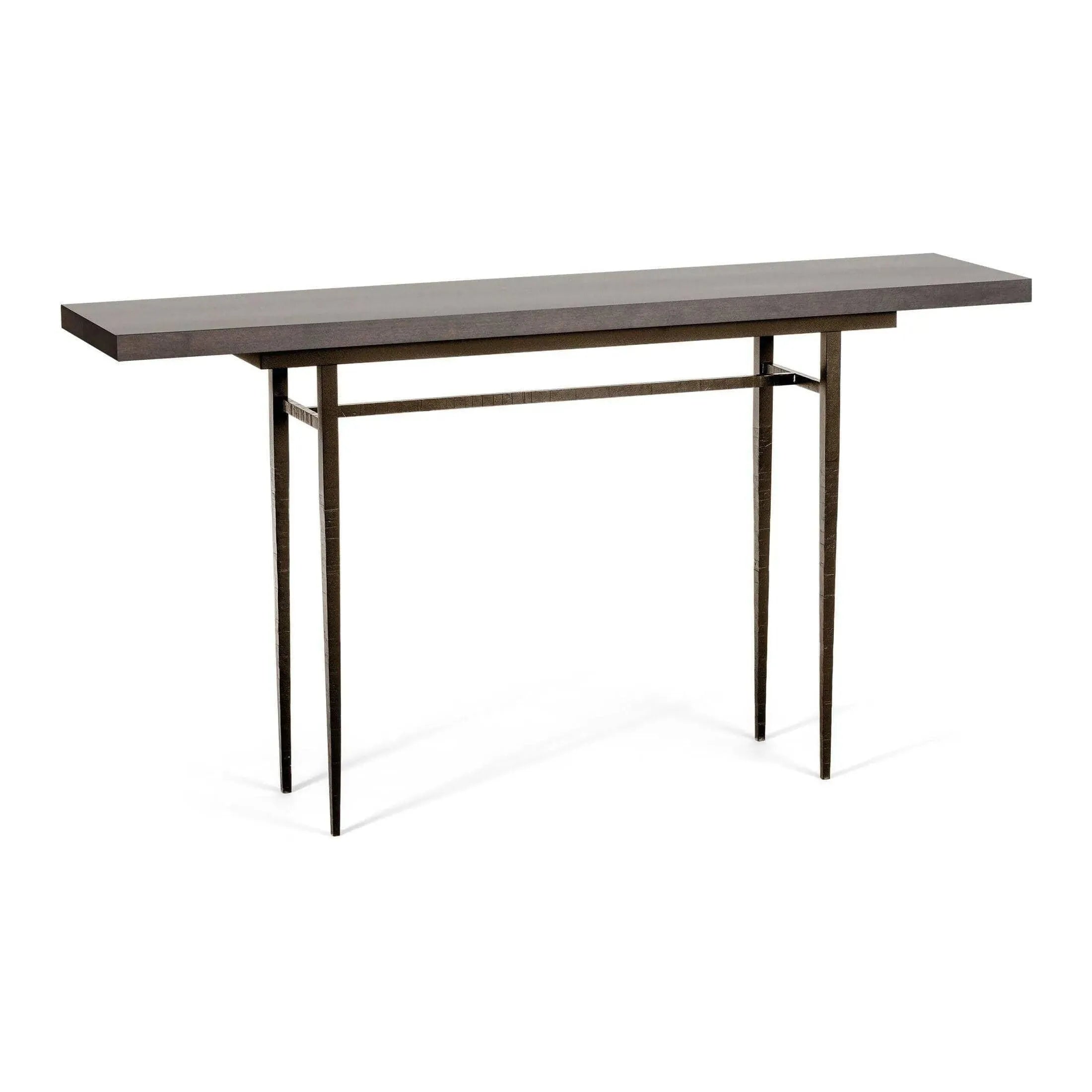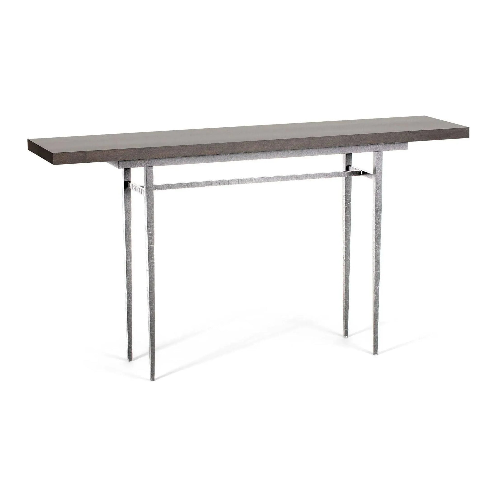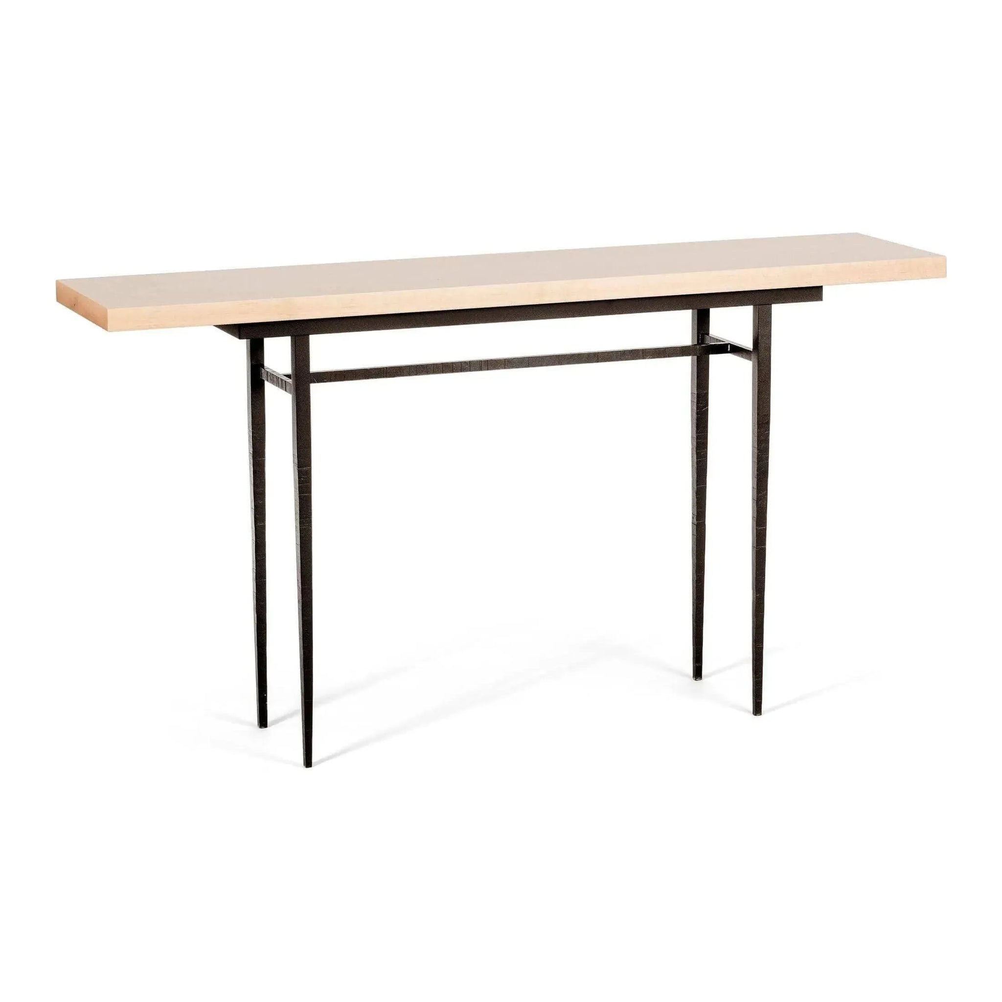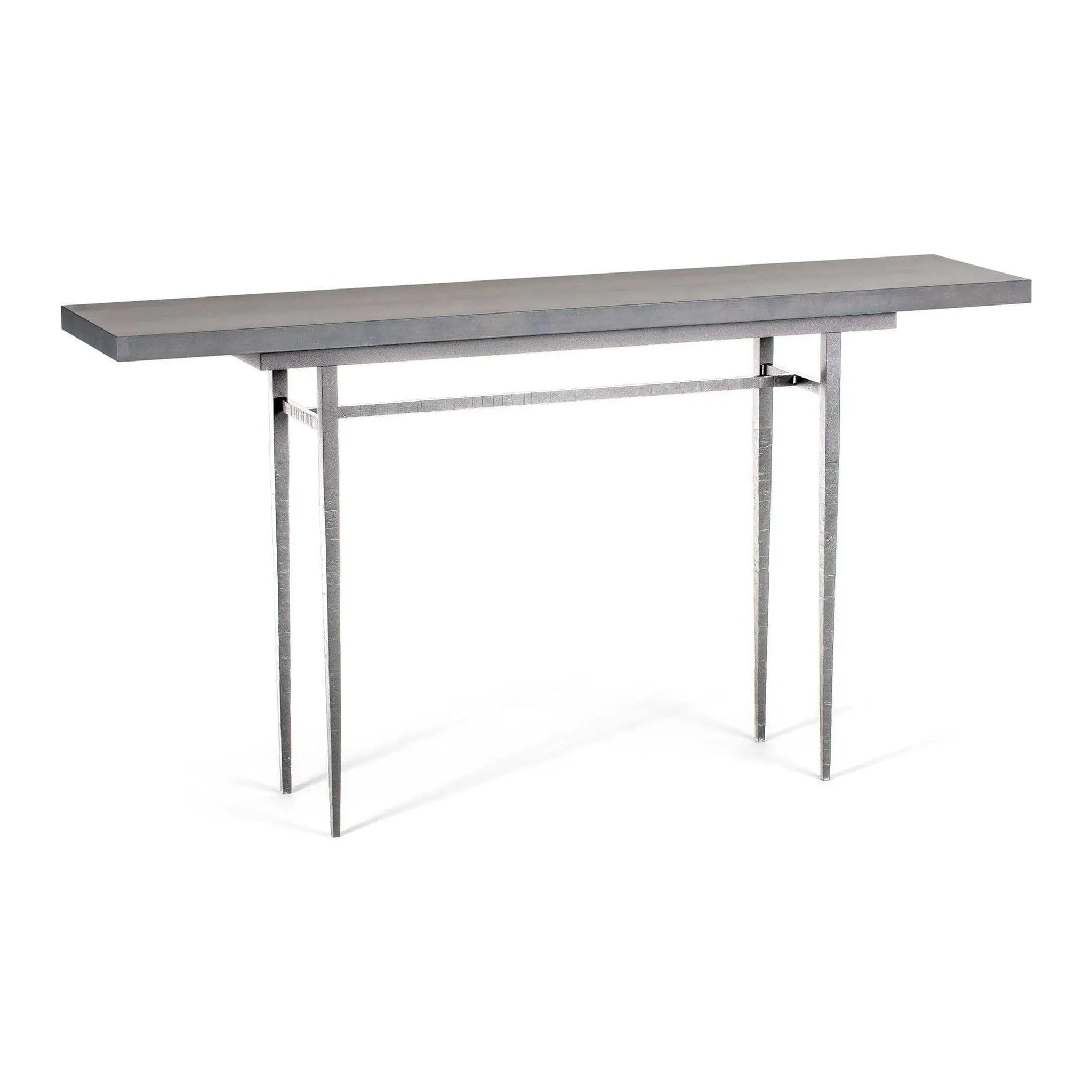 The long, elegant tapered legs and 1.5" thick, solid wood top define the Wick Collection of tables. The large 60" Wick Console Table features forged, hand-hammered, solid steel legs. Its solid maple wood top, offered in a choice of Clear, Grey or Espresso finishes, extends beyond the table's metal footprint to a full 5' usable surface length.
