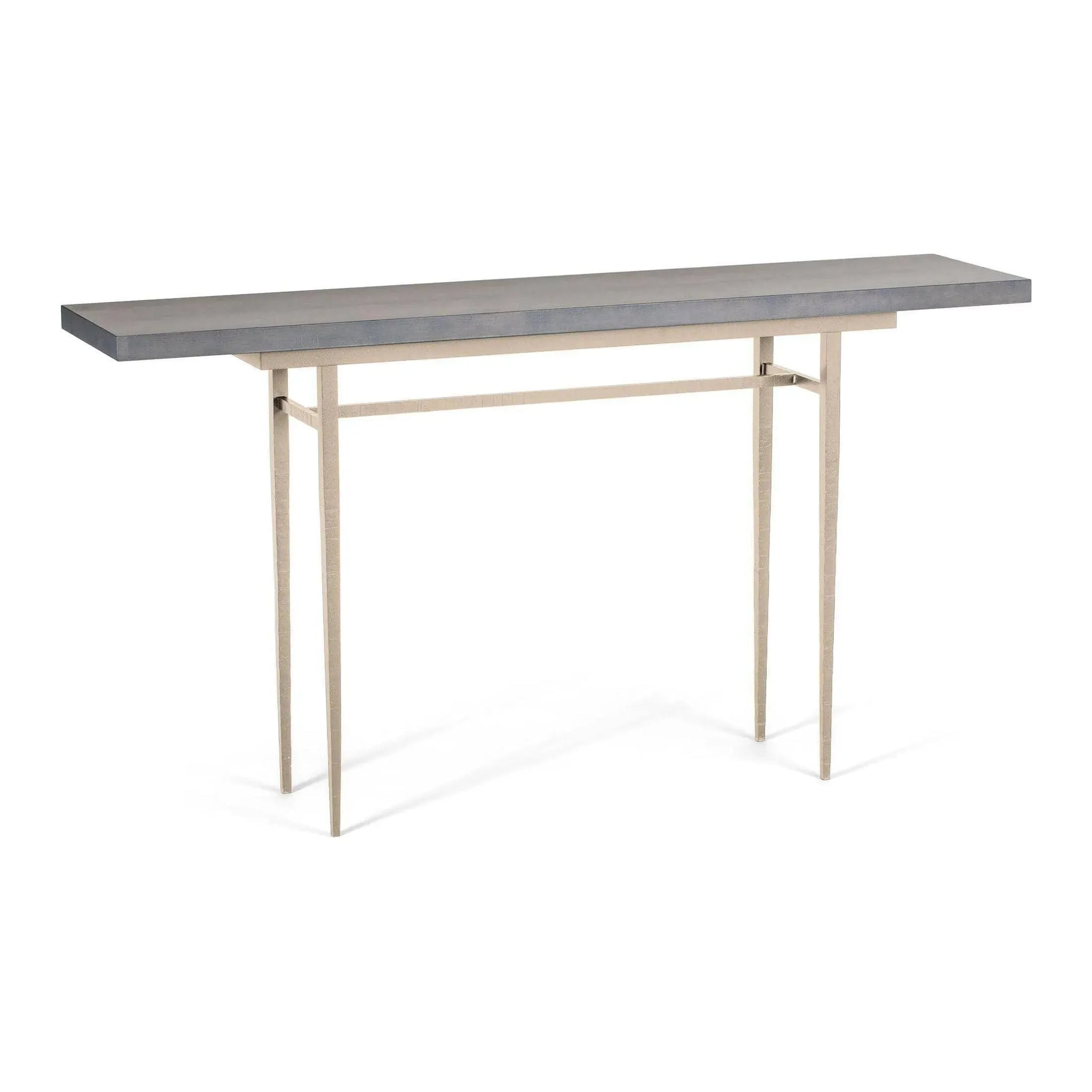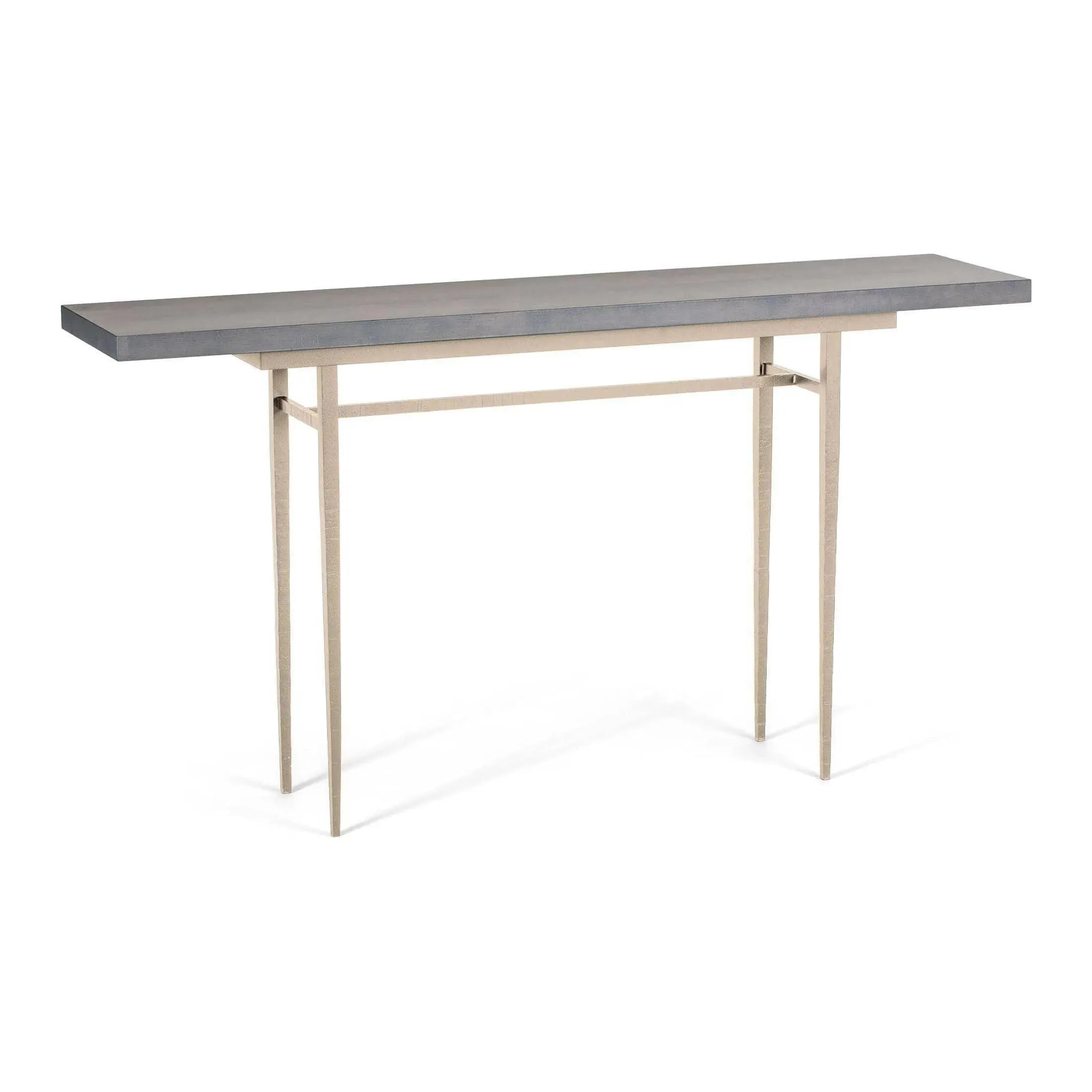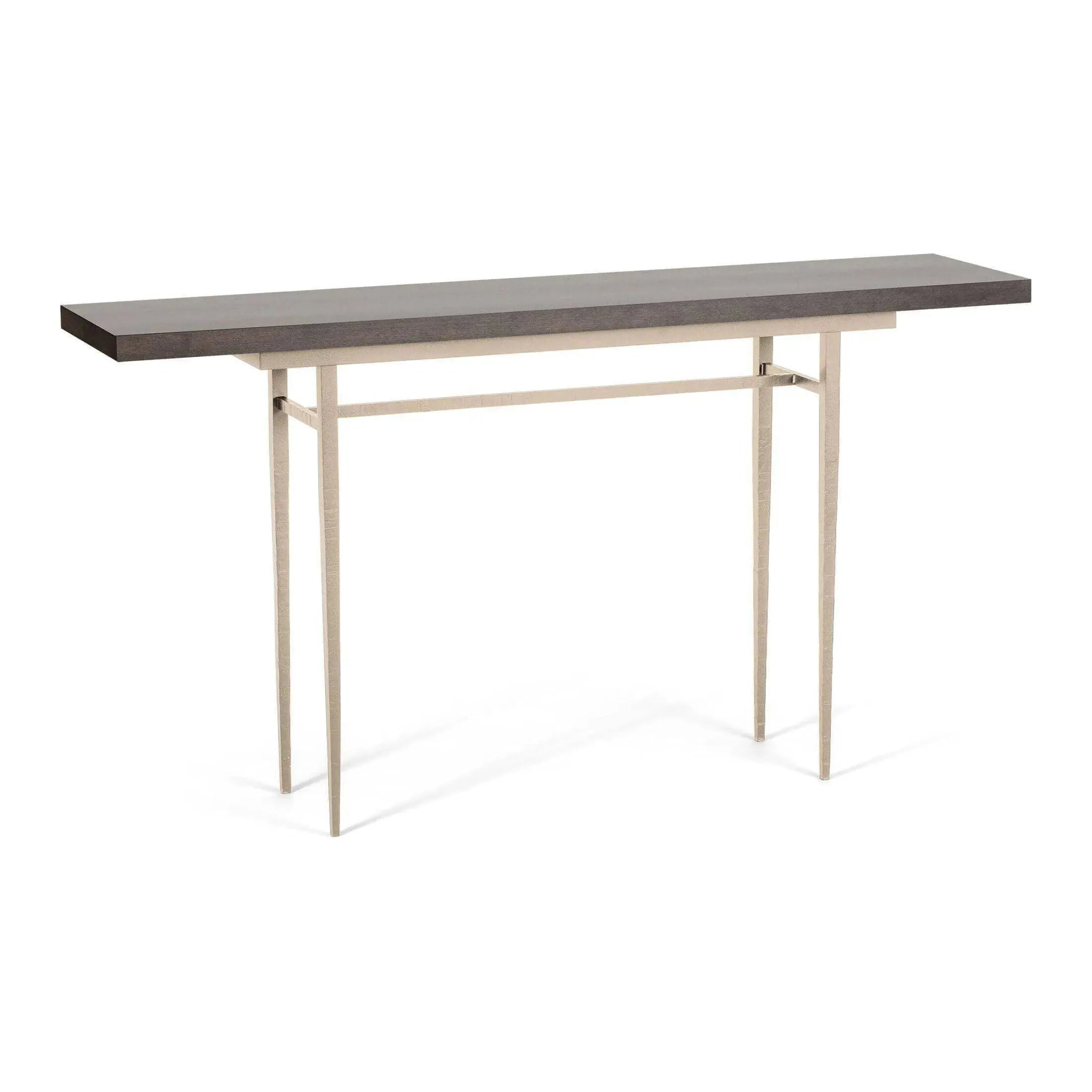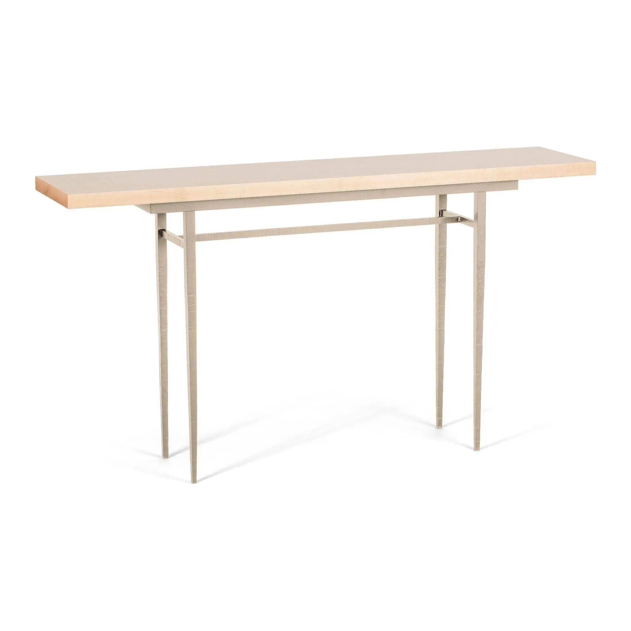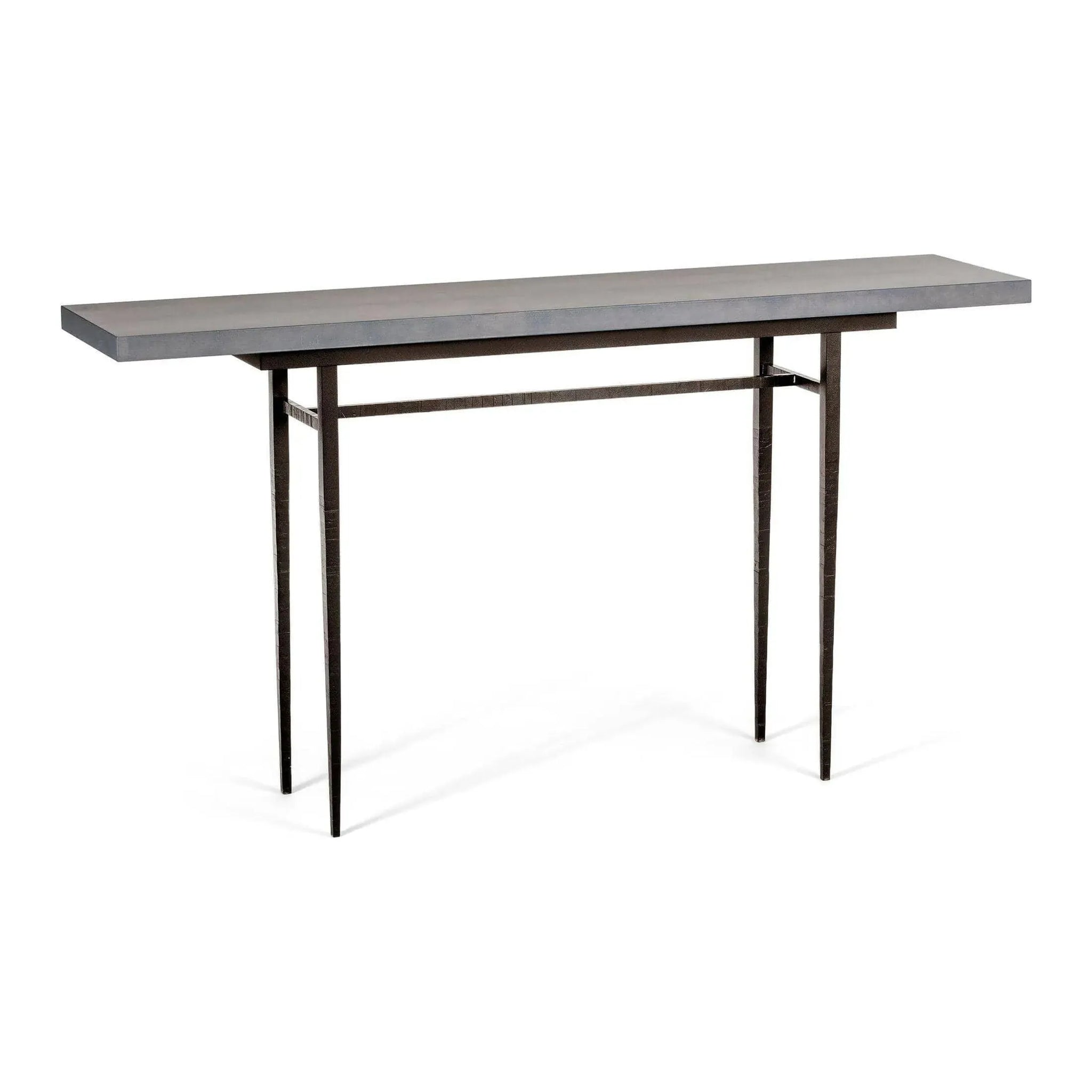 The long, elegant tapered legs and 1.5" thick, solid wood top define the Wick Collection of tables. The large 60" Wick Console Table features forged, hand-hammered, solid steel legs. Its solid maple wood top, offered in a choice of Clear, Grey or Espresso finishes, extends beyond the table's metal footprint to a full 5' usable surface length.