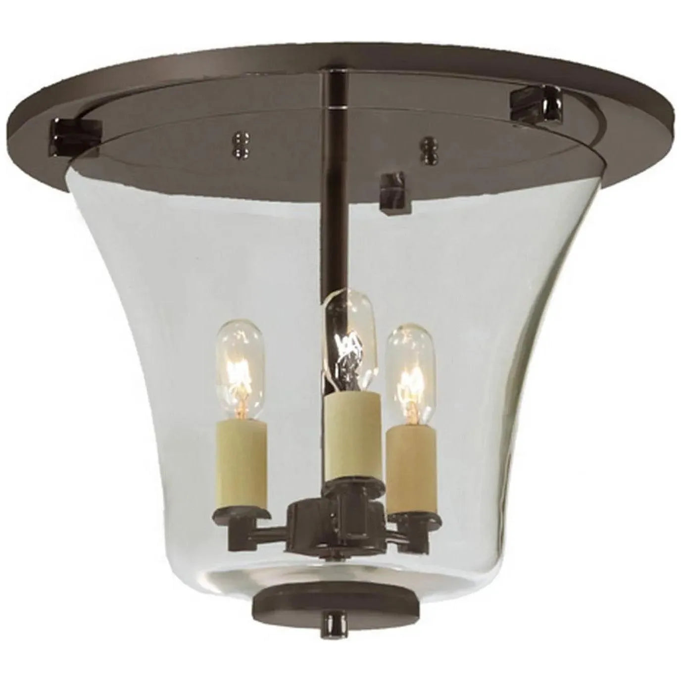 Greenwich Flush Mount by JVI Designs makes a refined statement — a designer lighting piece that pairs archival form with modern clarity. The flared clear-glass shade cradles a three-light candelabra cluster, showcasing faux-candle sleeves and exposed bulbs for an elegant, architectural glow. The compact flush profile and dark metal canopy create a clean silhouette ideal for low ceilings and transitional interiors.