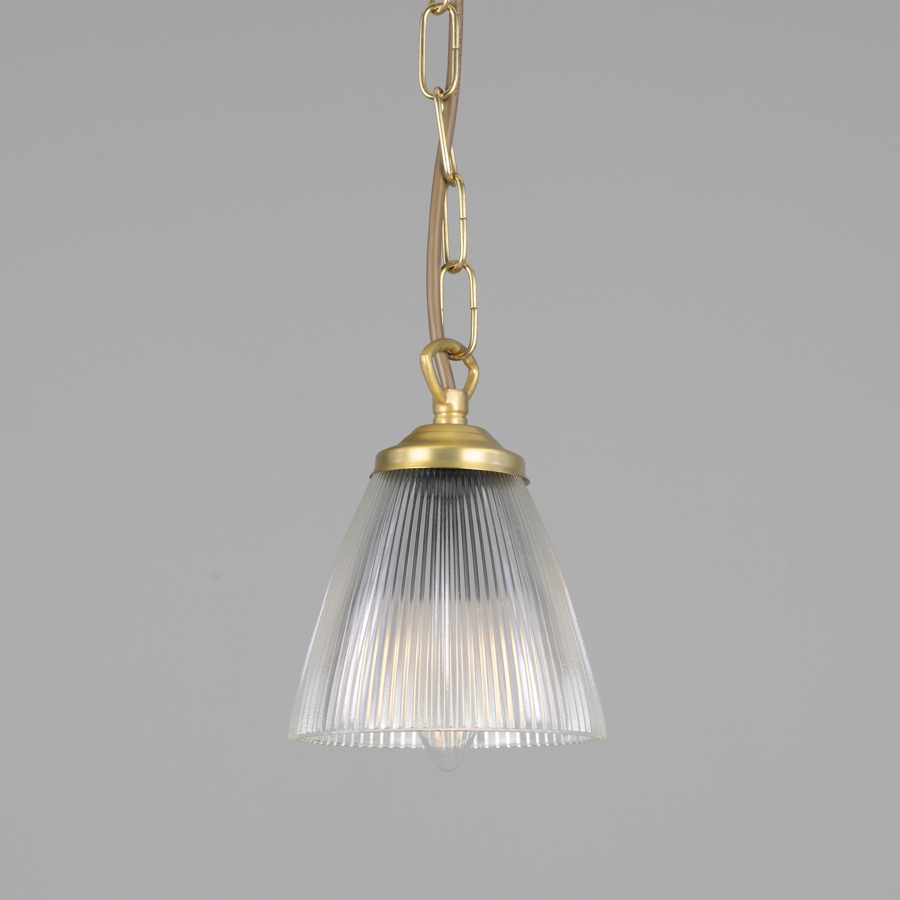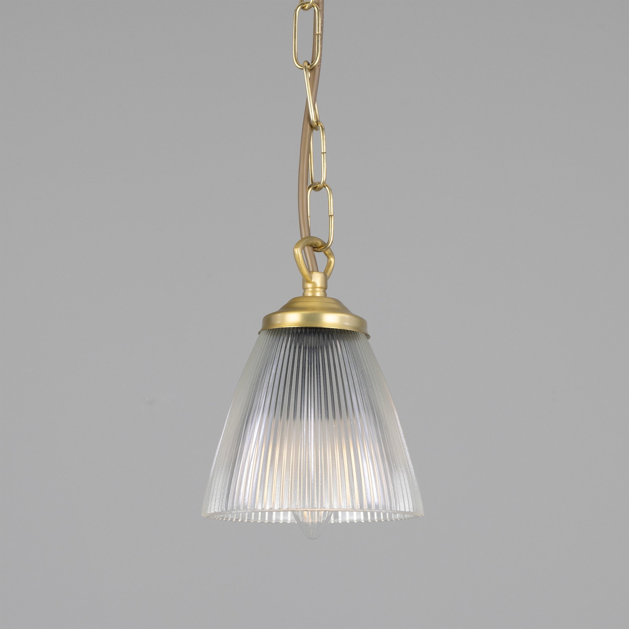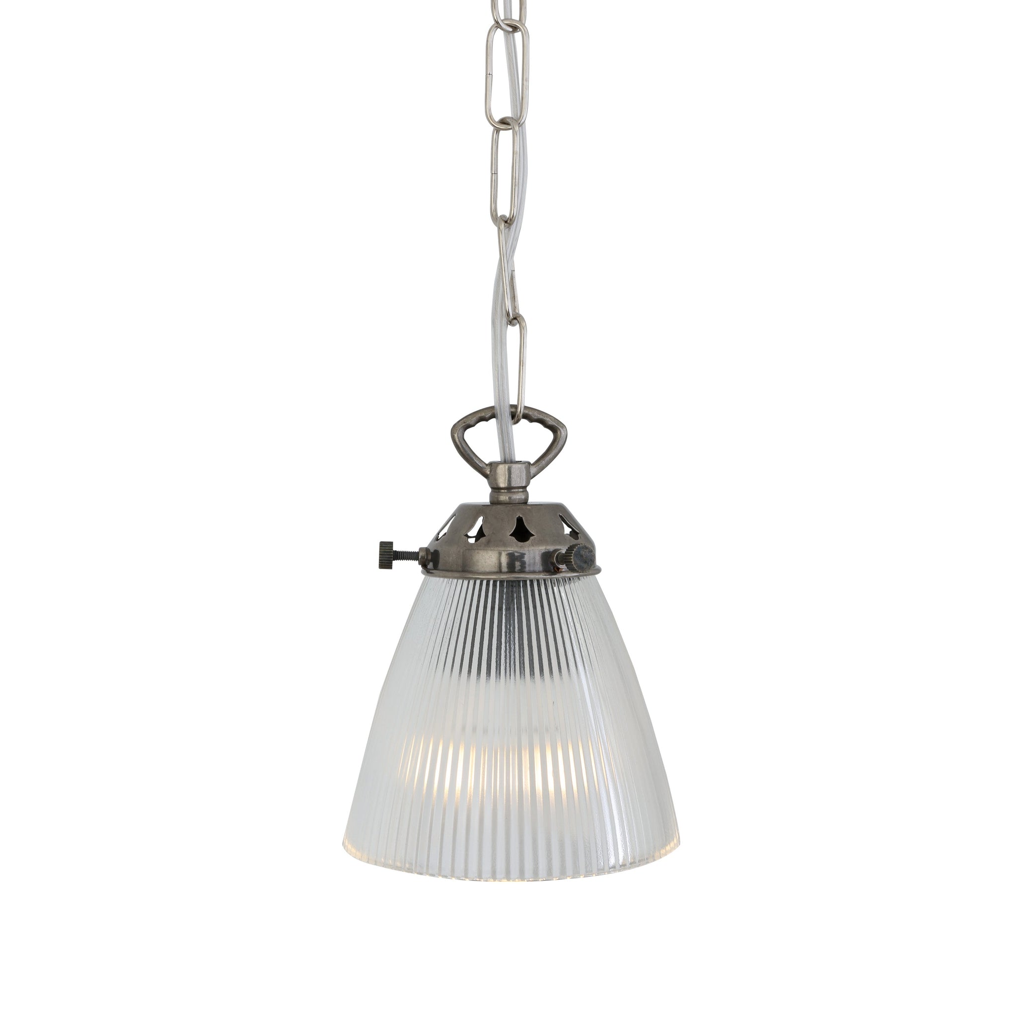 The Gadar Pendant by Mullan Lighting pairs industrial refinement with measured elegance—designed to deliver focused illumination and visual texture in curated interiors. A fluted, conical glass shade refracts light evenly while a hand-finished metal cap and exposed hardware convey artisanal detail and structural clarity.